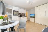Die moderne, offene Küchenzeile ist ausgestattet mit einem Backofen, 2-Platten-Ceranfeld, Geschirrspüler, Kaffeemaschine, Wasserkocher und Toaster ideal für entspannte Selbstversorgung im Urlaub.