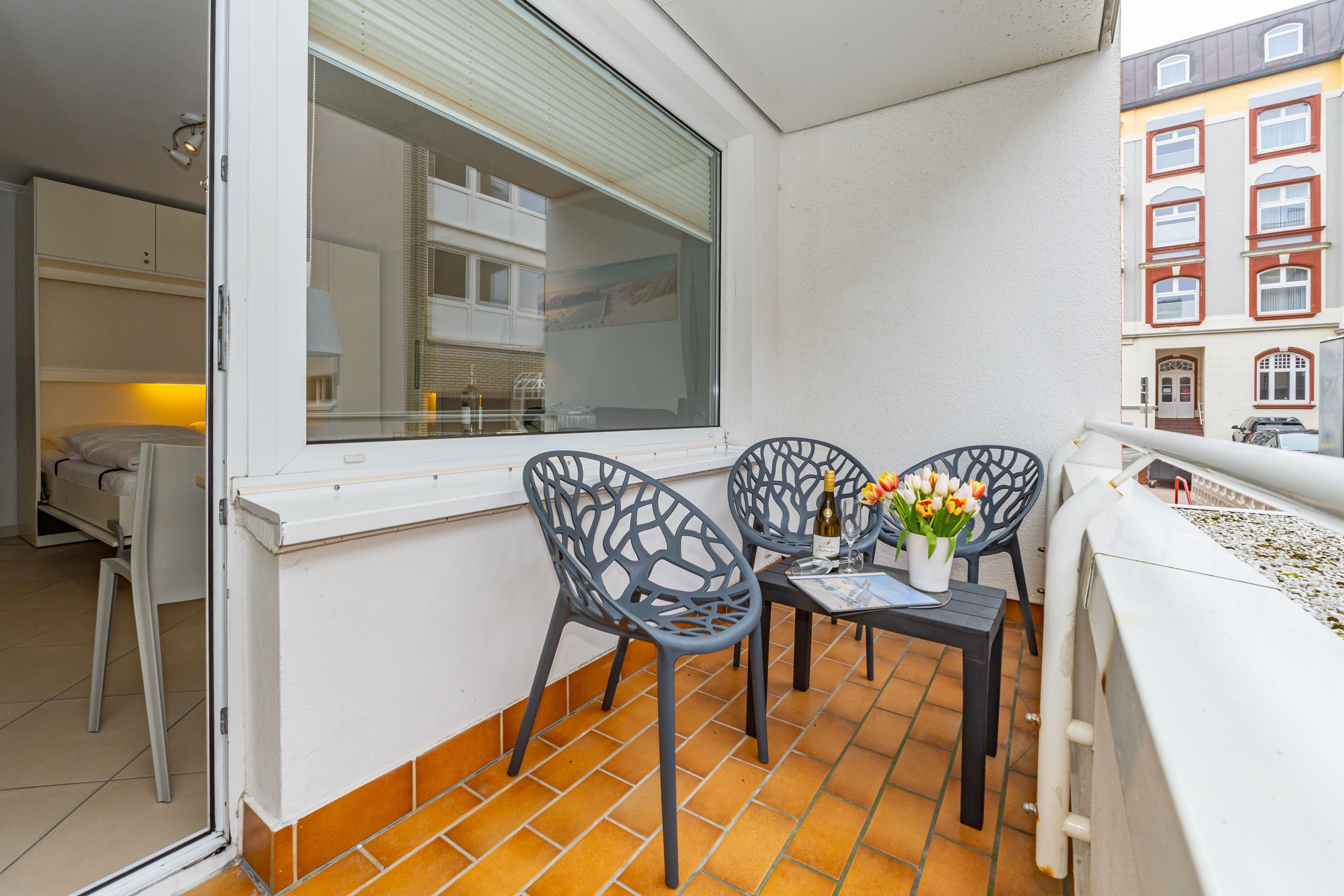 Der Balkon ist mit modernen Möbeln ausgestattet und lädt zu erholsamen Momenten an der frischen Meeresluft ein.