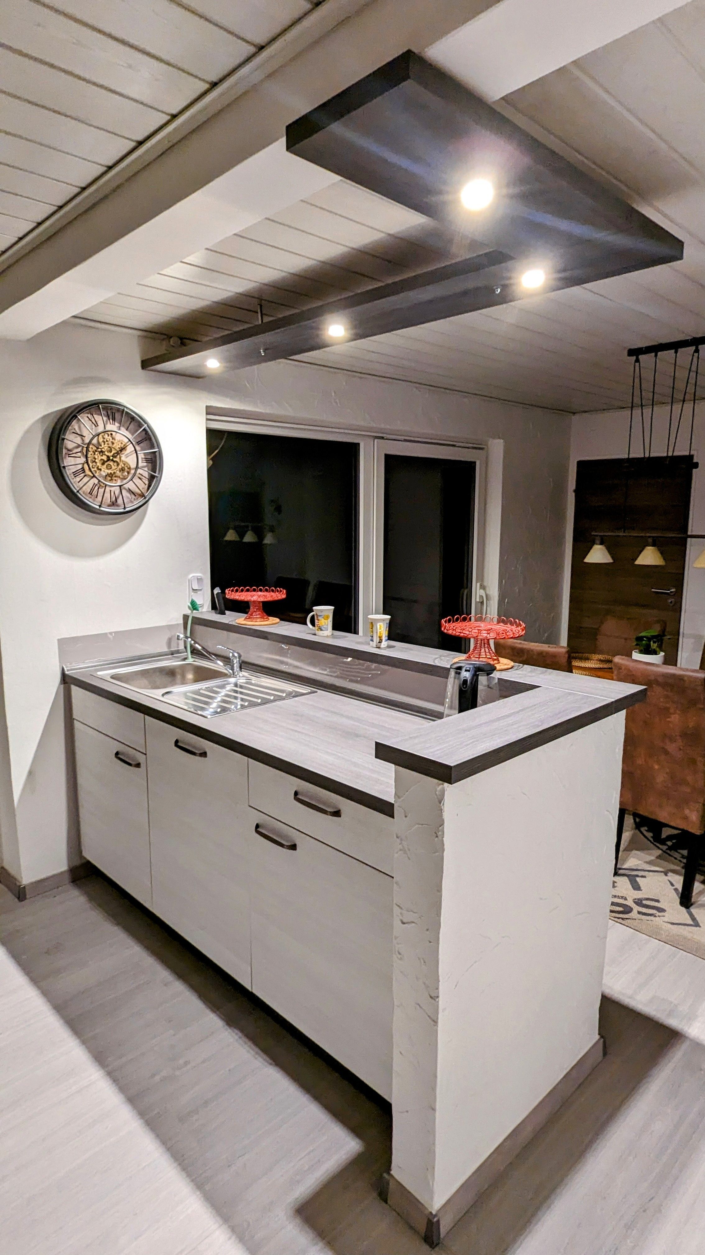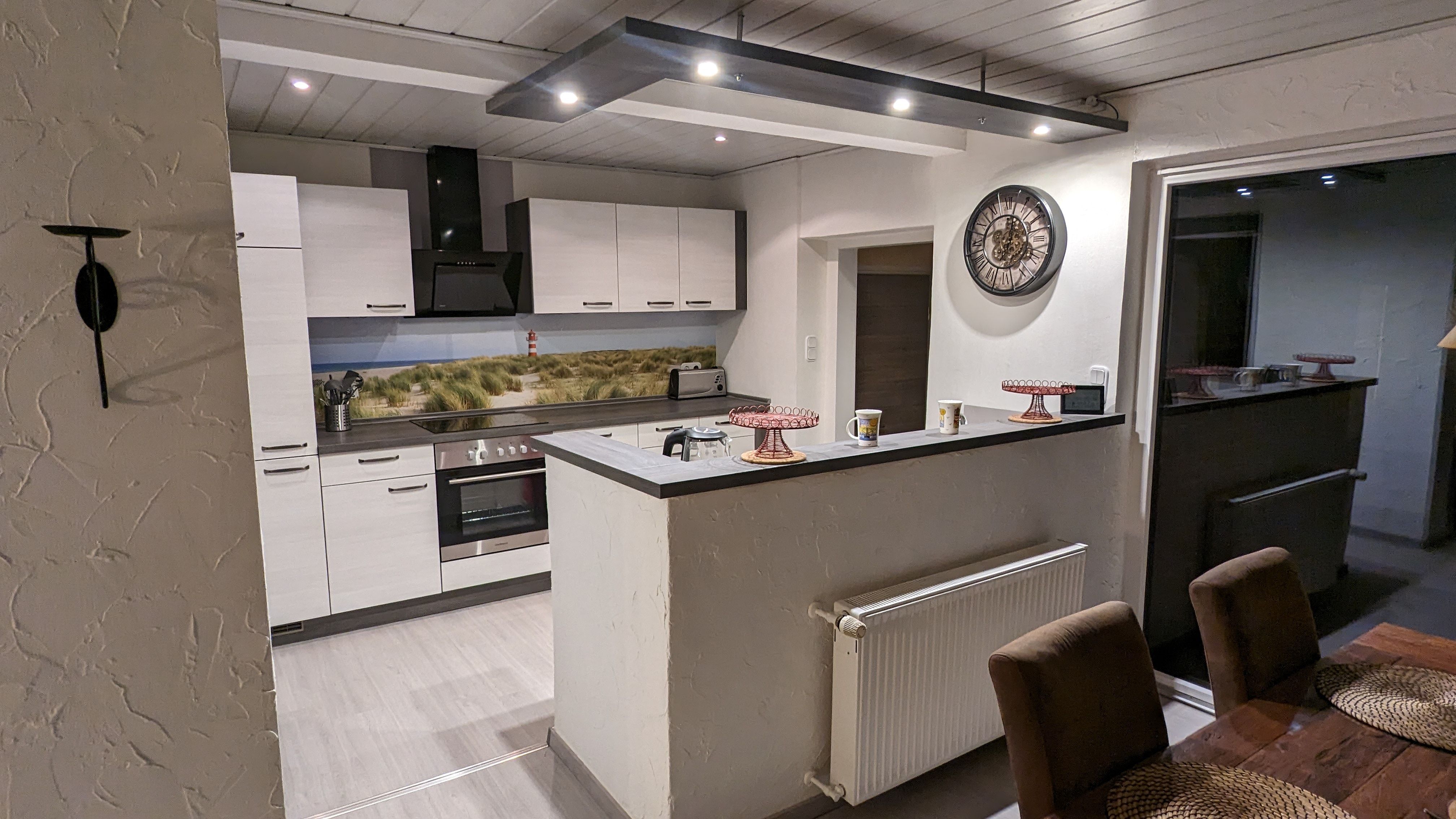 Die Küche ist komplett ausgestattet mit Kaffeemaschine, Wasserkocher, Toaster, Kühlschrank und Mikrowelle.
