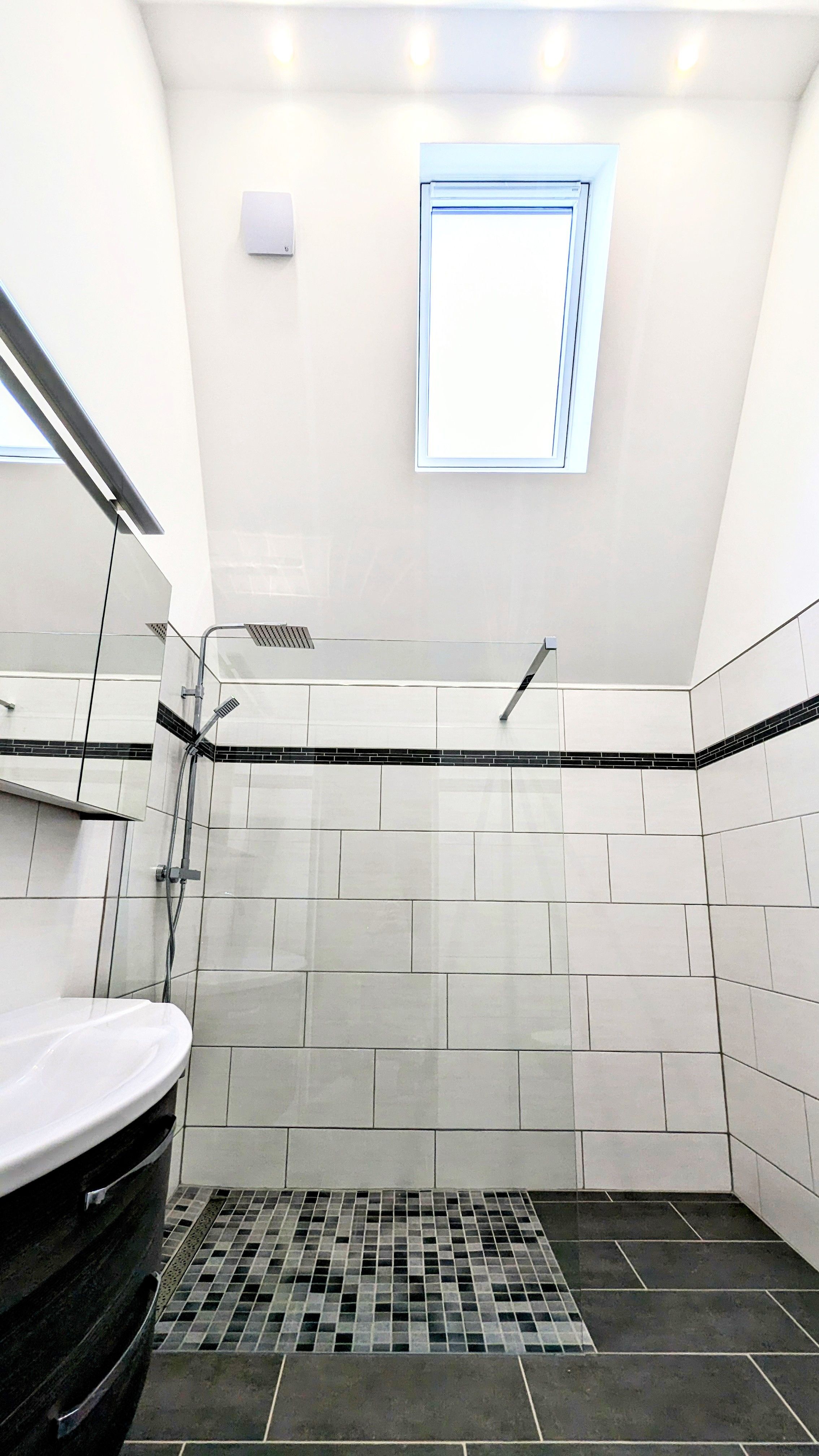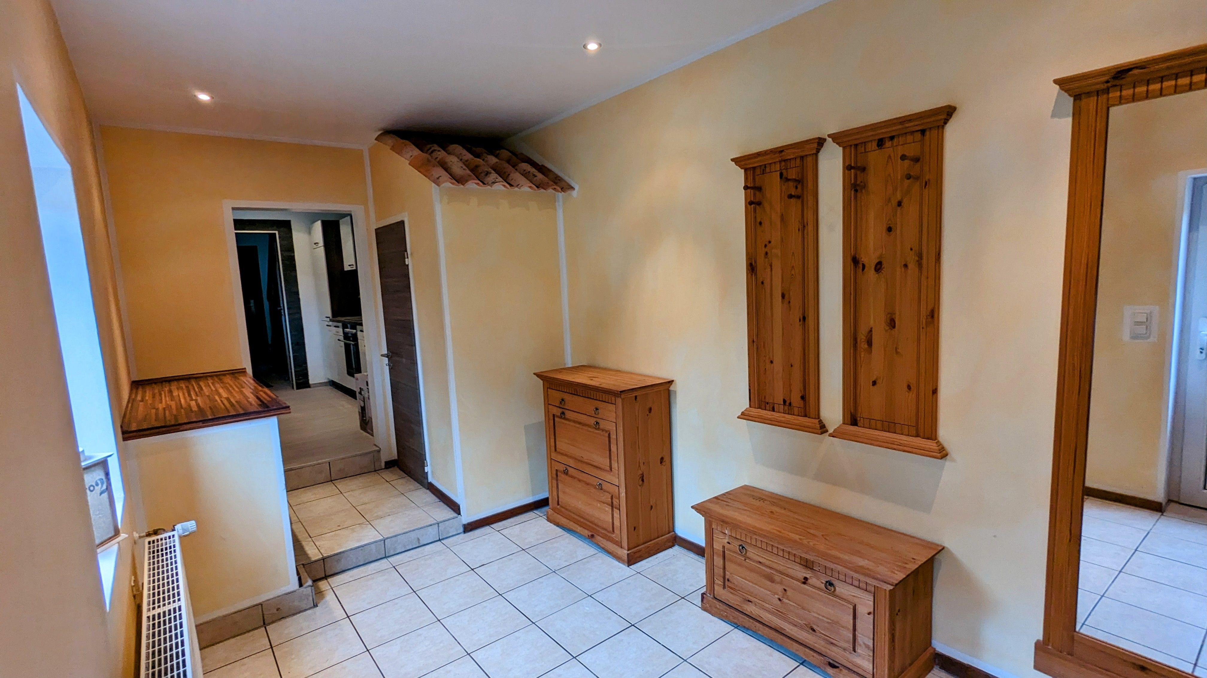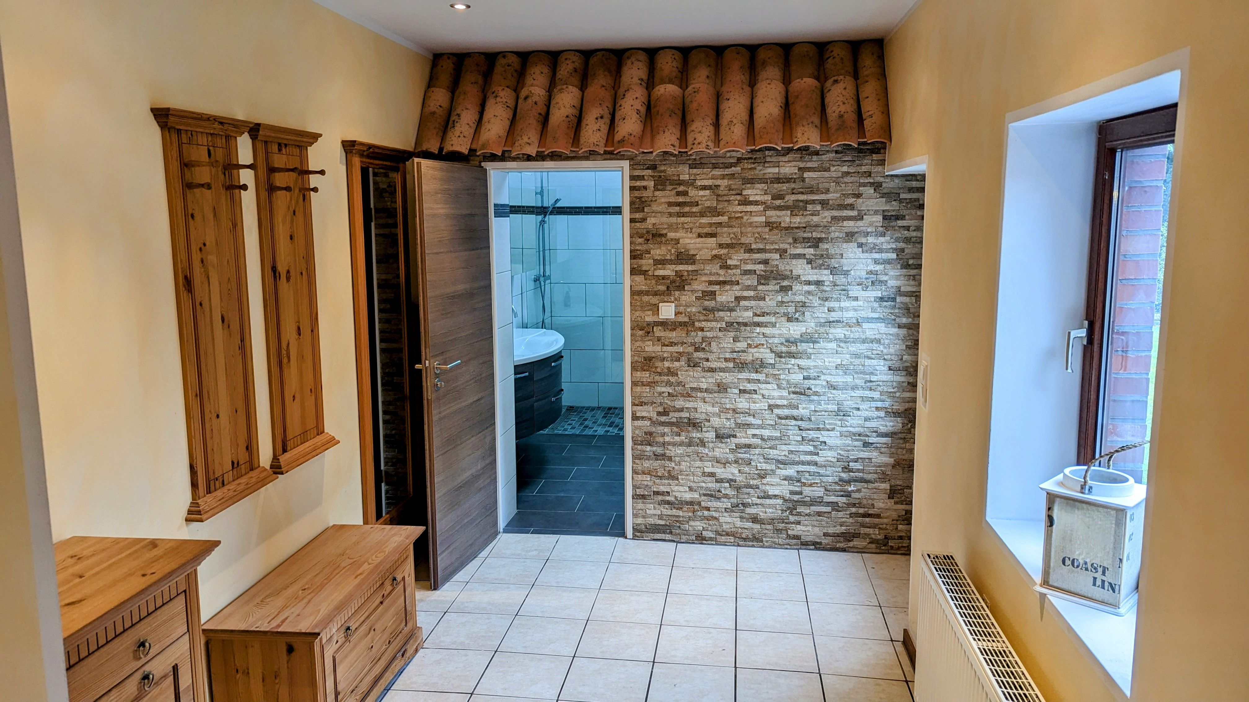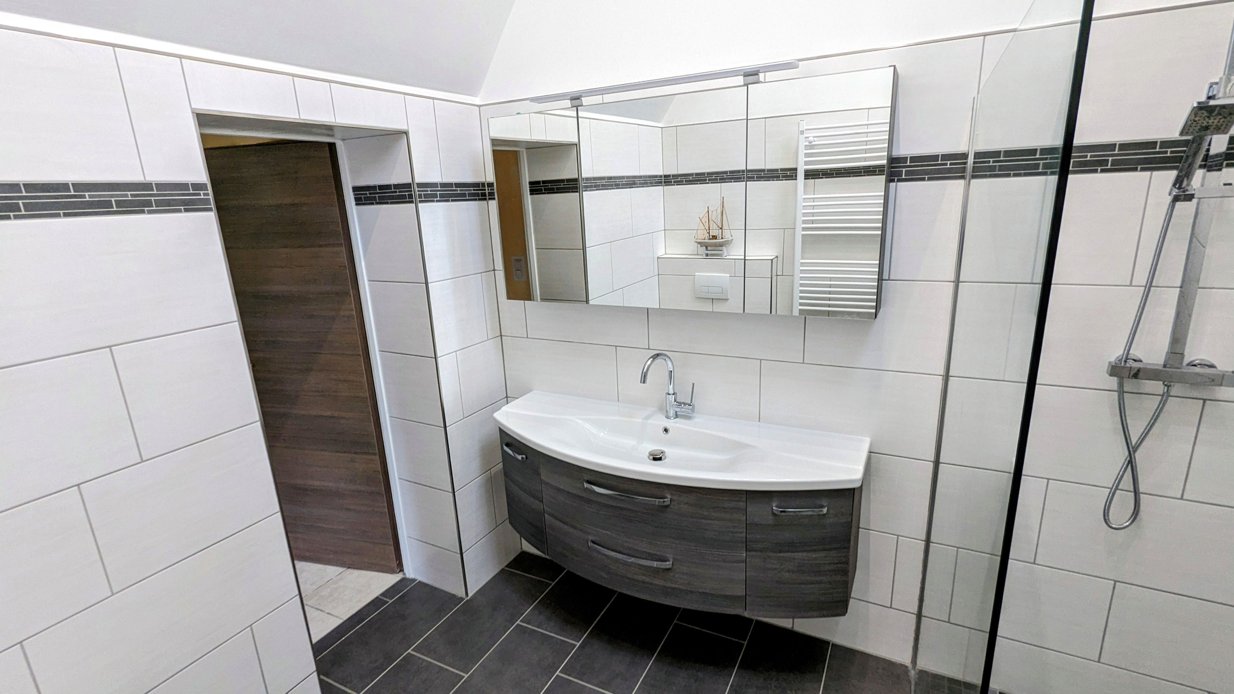 Des Weiteren liegt im Erdgeschoss das helle, neu gestaltete Bad mit WC und begehbarer Dusche.
