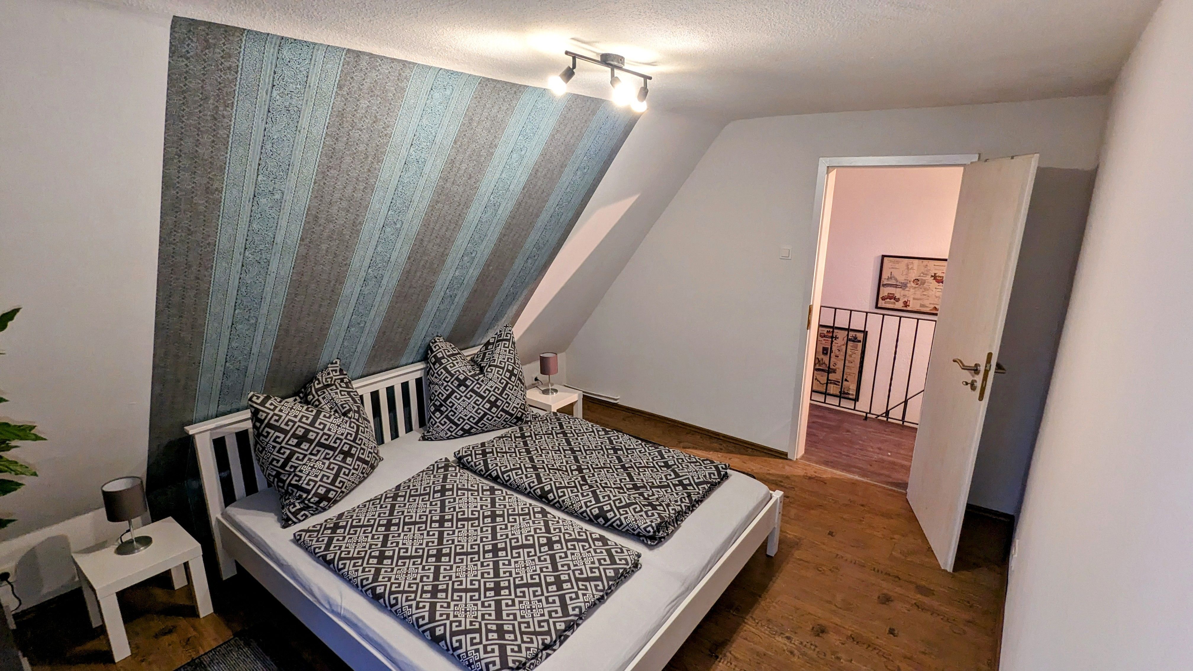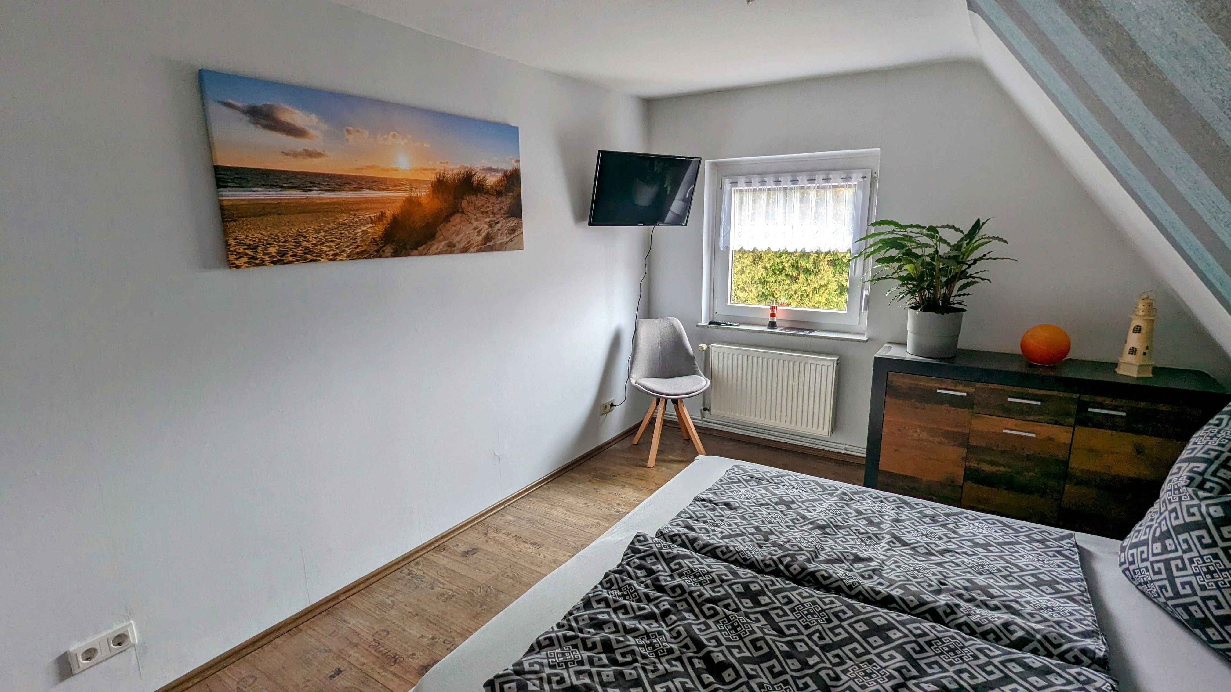 Im Obergeschoss befinden sich die beiden weiteren Schlafzimmer, eines mit einem gemütlichen 1,80m x 2,0m Bett einer Kommode und Flachbild TV.