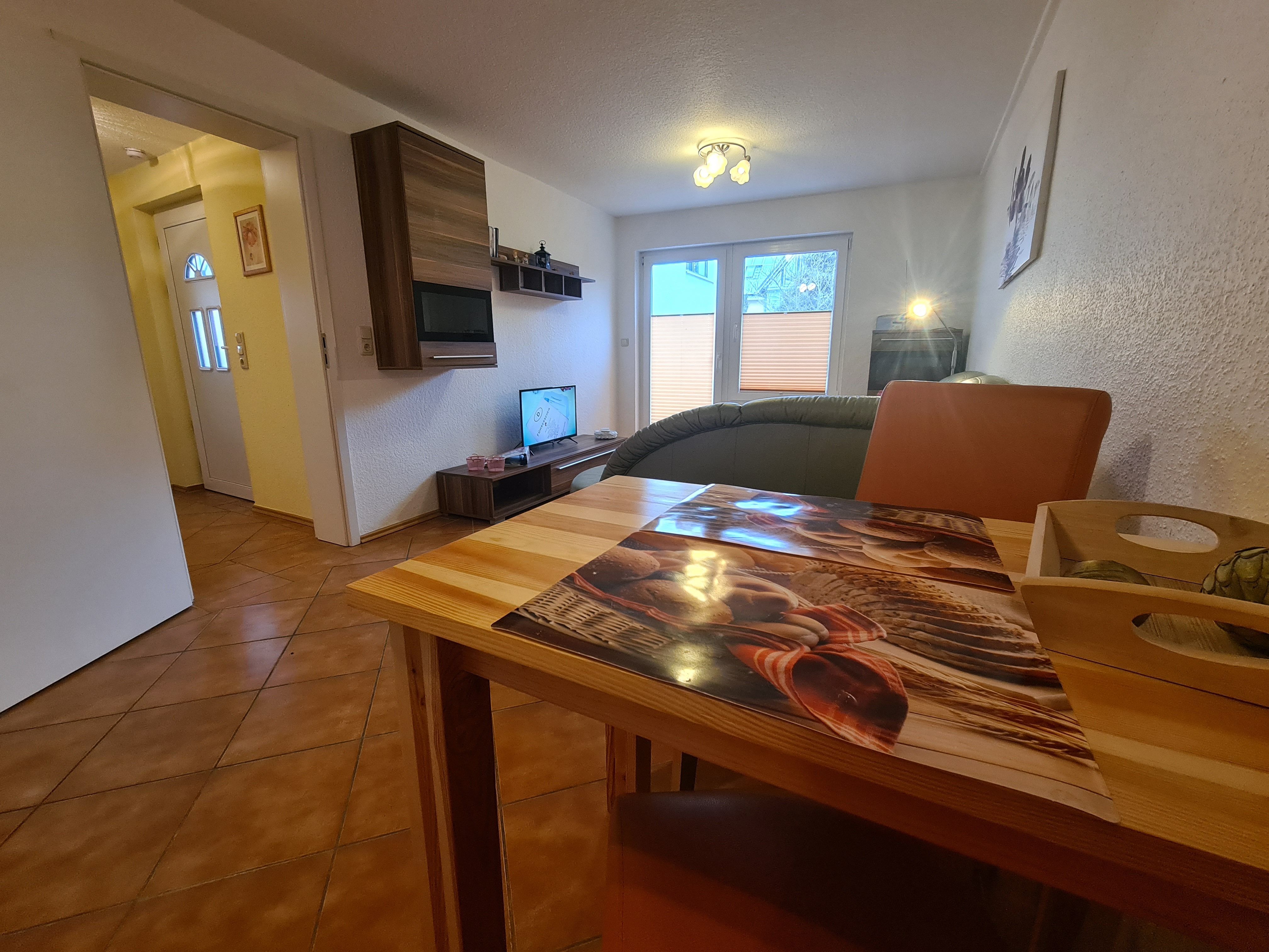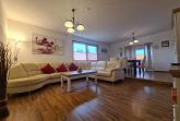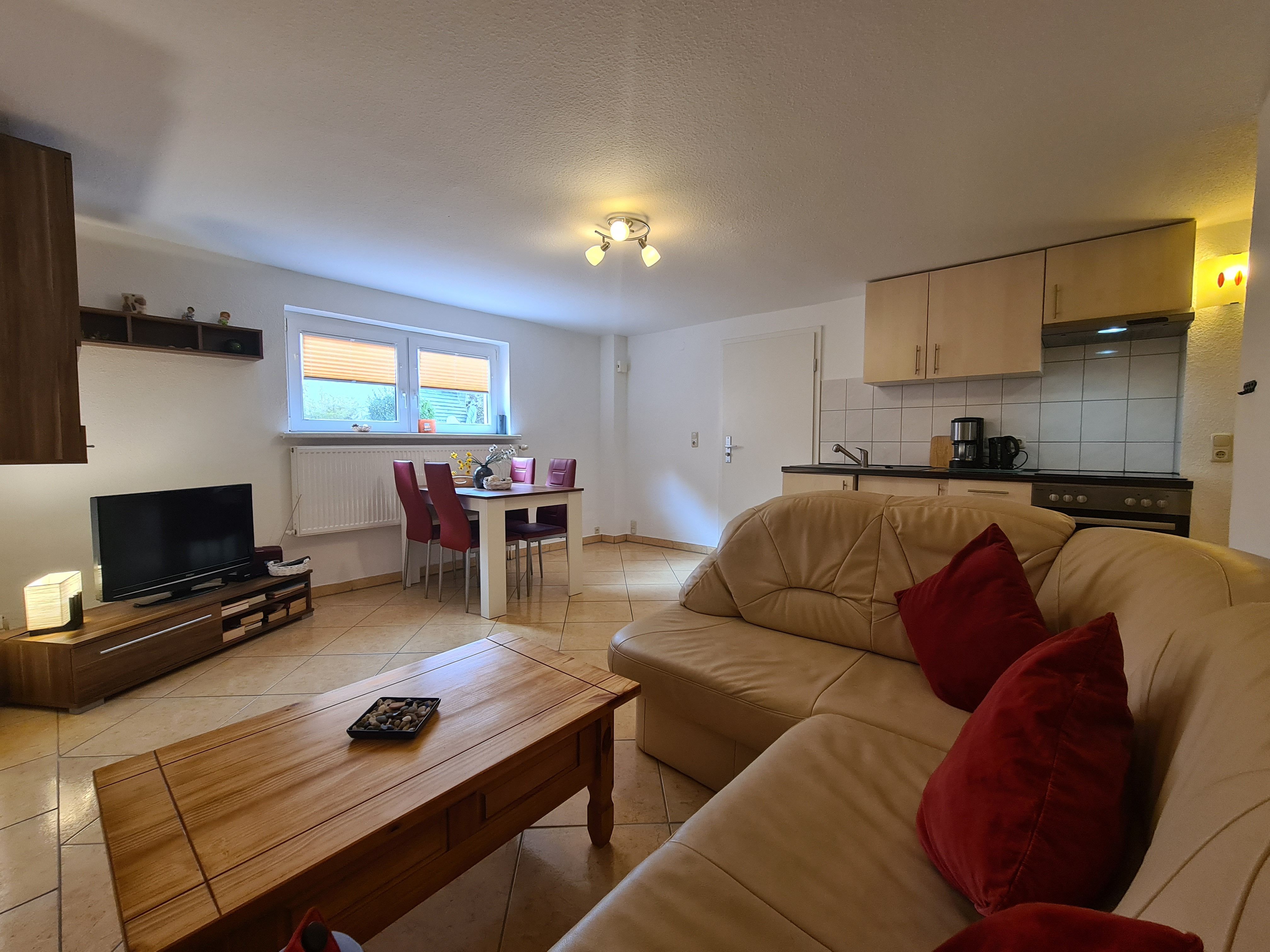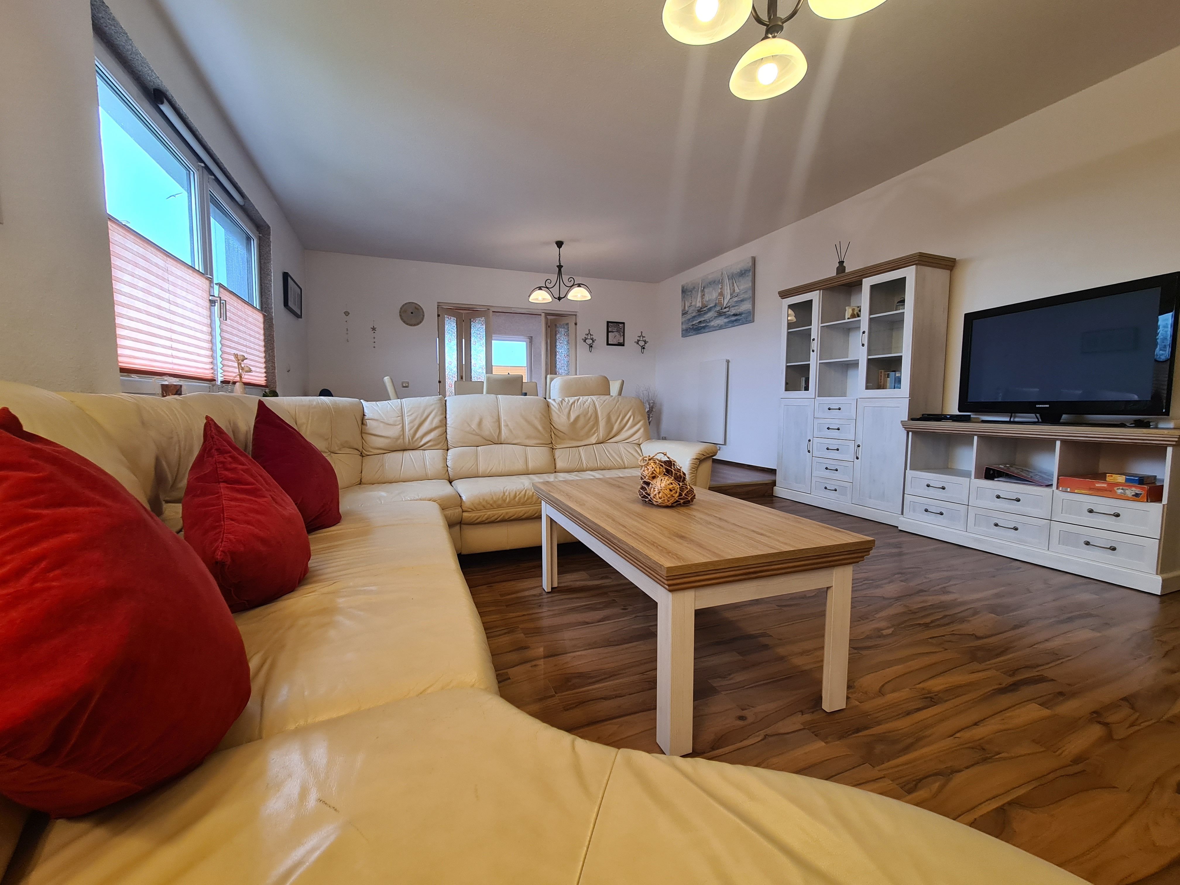 • Großes Wohnzimmer (30m²) zur Südseite mit großem Fenster und gemütlicher Sitzecke, Flachbildschirm, Radio und Esstisch.