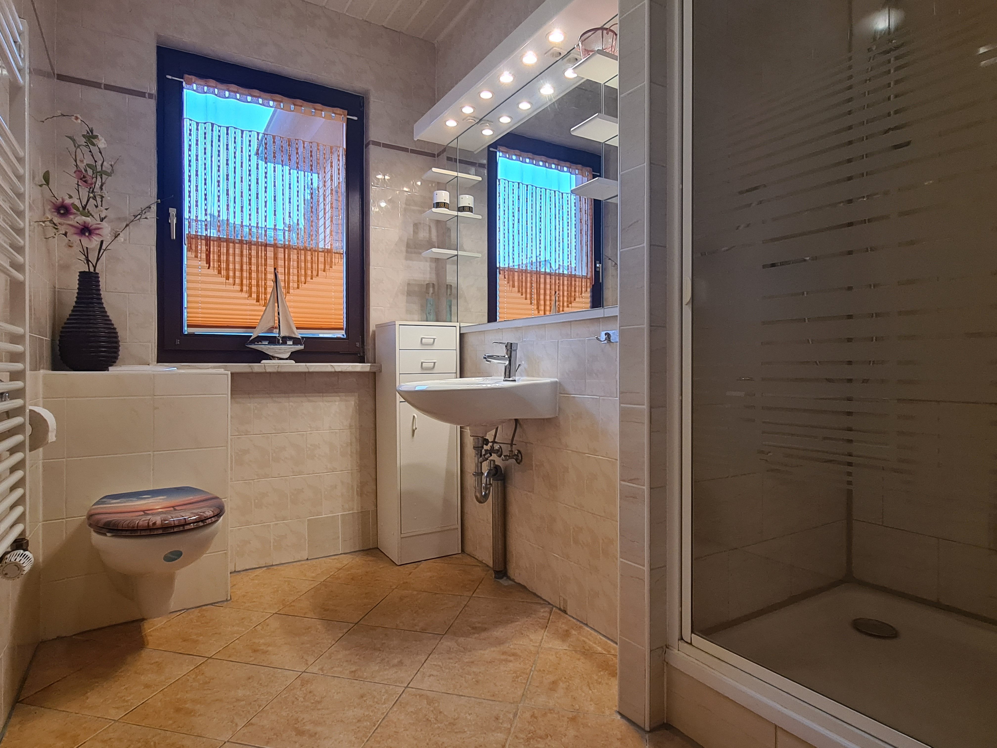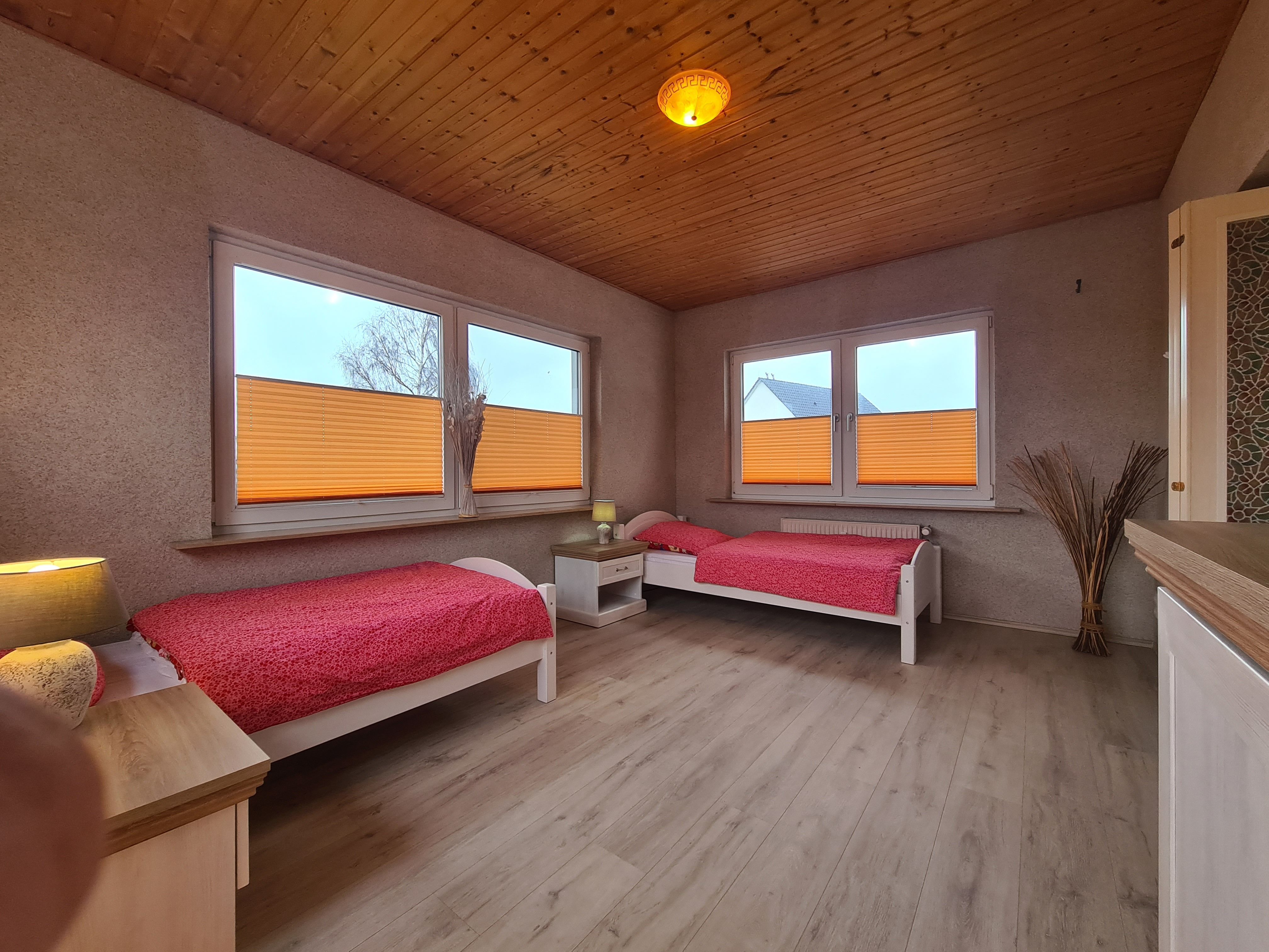Komplette obere Etage -Hochpaterre- des Ferienhauses mit eigenem Eingang. Insgesamt 3 Schlafräume, 1 Duschbad/WC. 1 Wohnraum mit Zugang zum Wintergarten (Schlafraum).