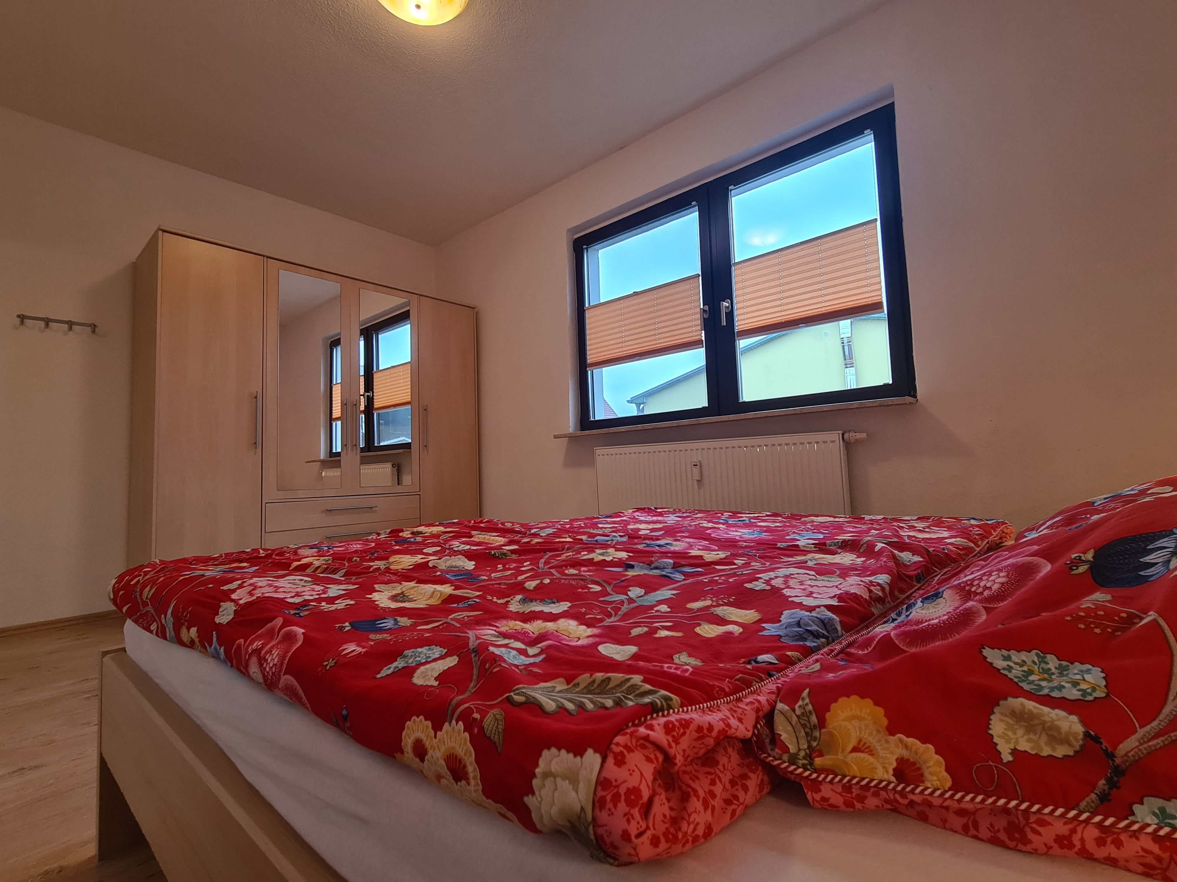2. Schlafzimmer mit Doppelbett (1,80m x 2,00m) und Kleiderschrank, 1 Babybett stellbar.