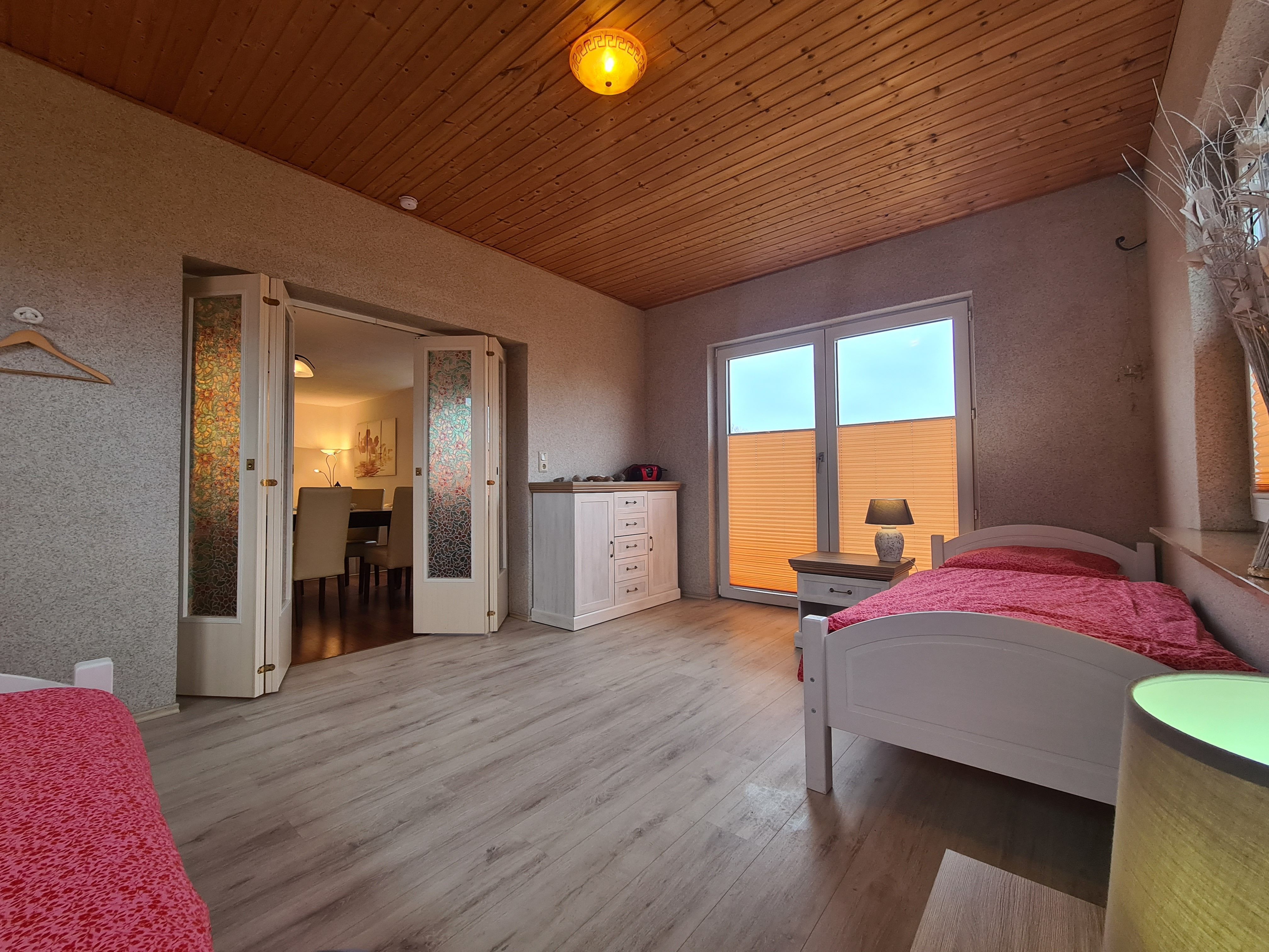 3. Schlafzimmer mit zwei Einzelbetten im Wintergarten, mit einer Falttür vom Wohnraum abgetrennt, 1 Babybett stellbar.