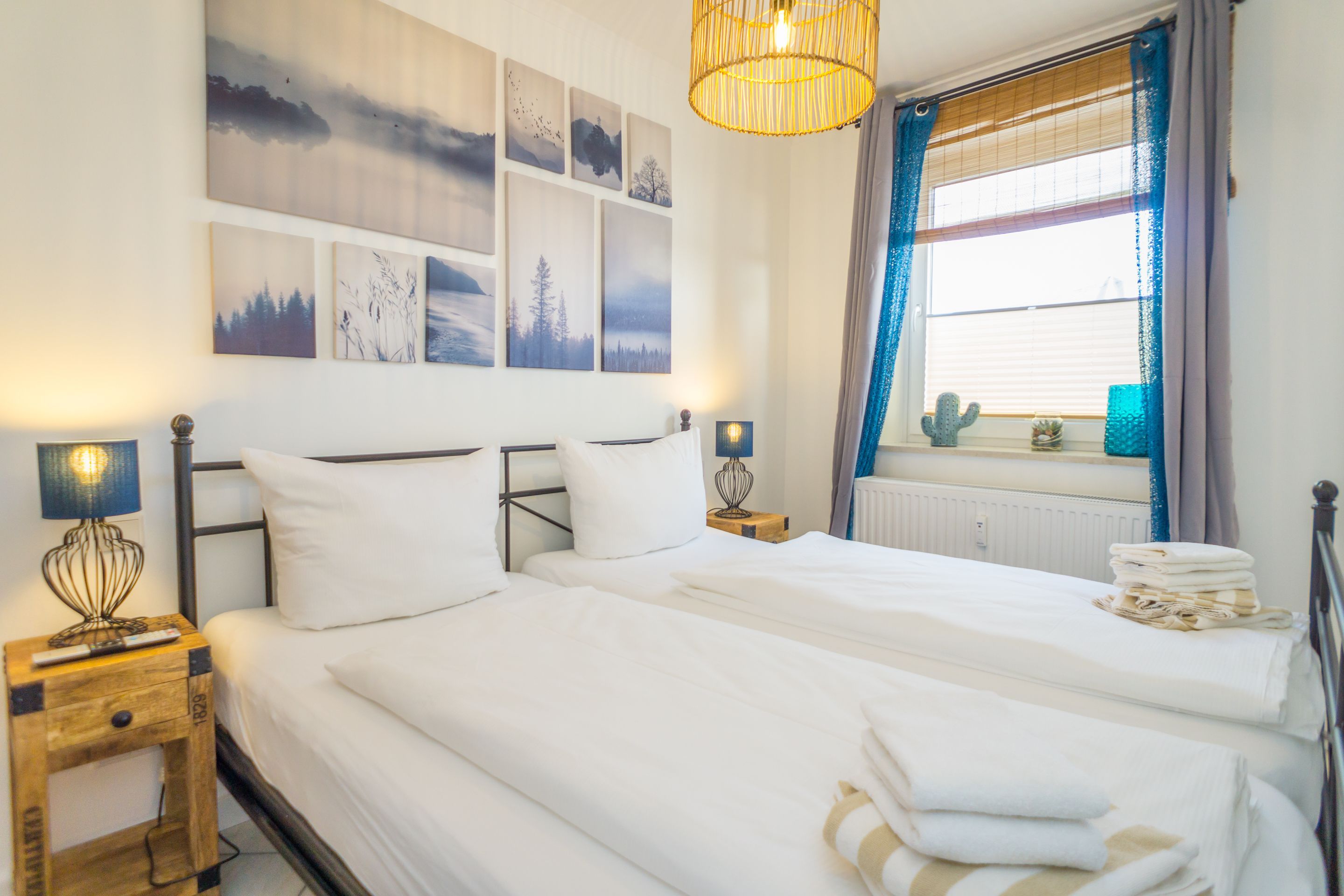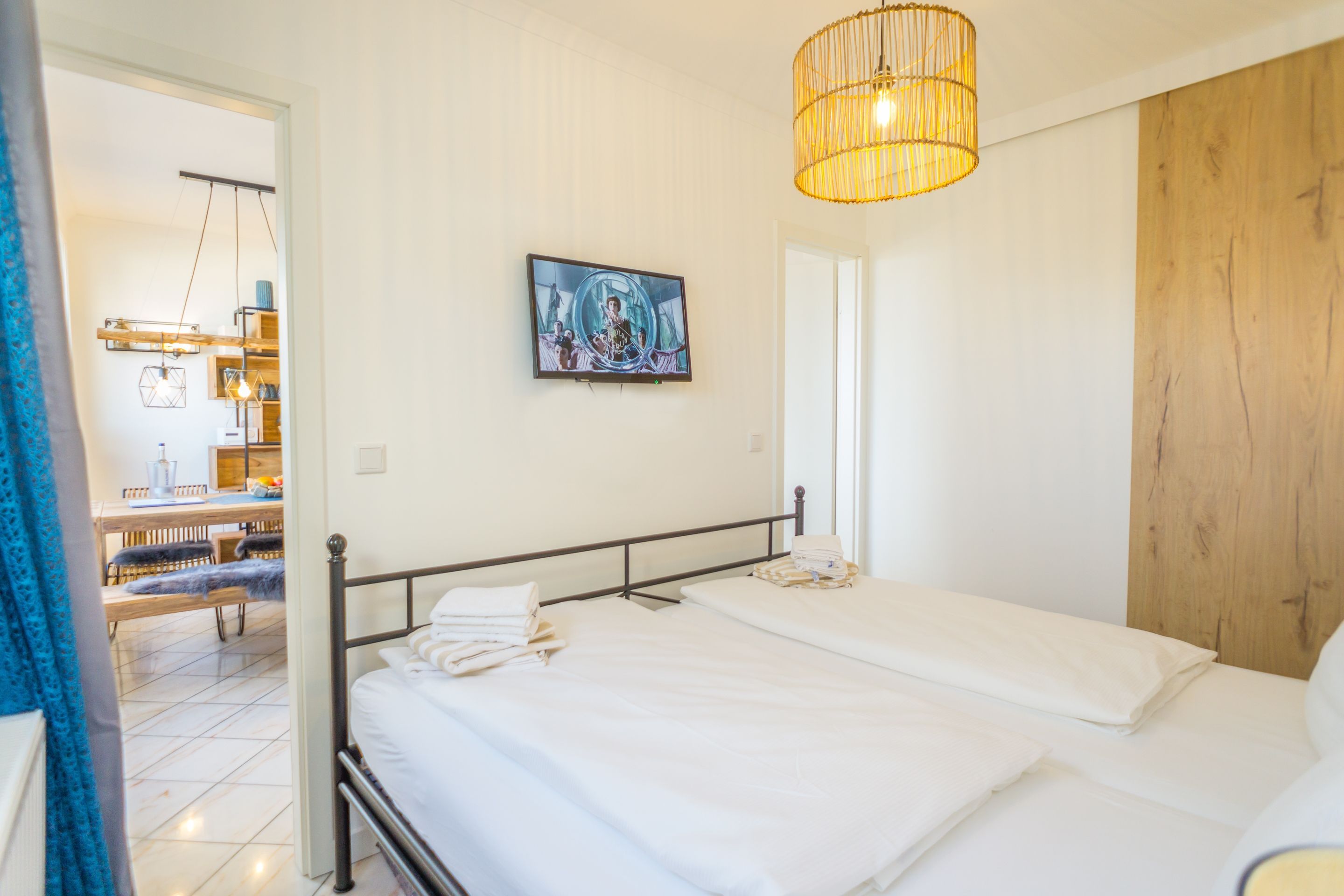 Diese einzigartige 3-Zimmer-Ferienwohnung (ca. 50 qm, max. 4 Personen und Haustier) in der 4. Etage verfügt über einen modernen Aufzug und einen frisch renovierten Laubengang. Nach einem Blick nach Westen auf die Nordsee und dem Öffnen der Haustüre gelangen Sie durch den Flur, an der hochwertigen Küche (4-er Ceran-Kochfeld, Geschirrspüler, Kühl-/Gefrierkombination, Kaffee- & Espressomaschine, Wasserkocher, Toaster, Mikrowelle), dem ersten Schlafzimmer (TV und komfortables Boxspring-Doppelbett mit 2 Matratzen je 2,0m x 0,80m mit durchgehendem Topper und 0,60m Komfortliegehöhe ) und dem Bad (Sitzbadewanne, WC, Waschtisch & Handtuchheizkörper) vorbei in das gemütliche Wohn- & Esszimmer (TV, Audio-Anlage, Sitzgruppe & Essgarnitur). Von hier aus gelangen Sie in das zweite Schlafzimmer (TV, großes Doppelbett mit 2 Matratzen je 2,0m x 0,90m) und auf den Balkon.