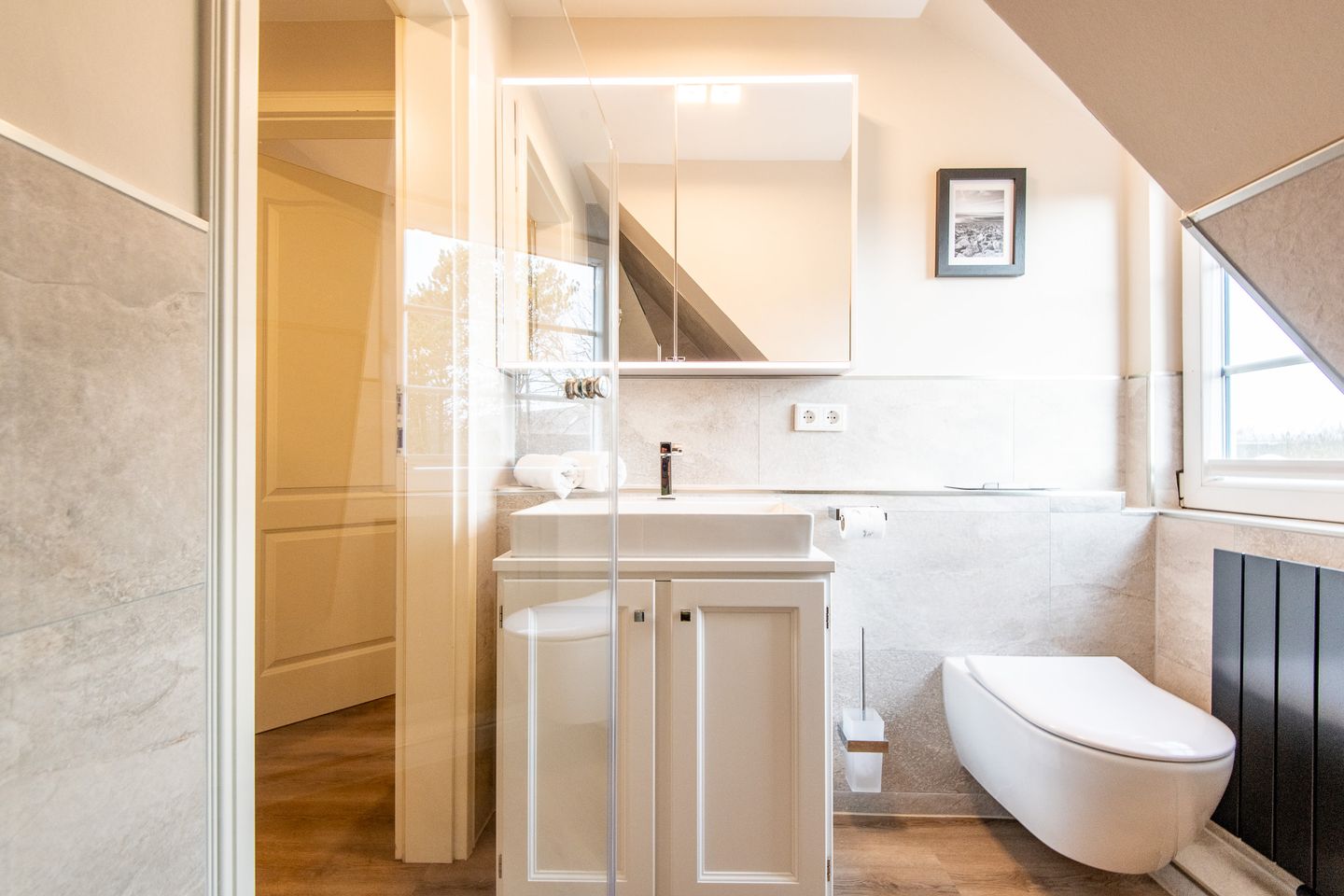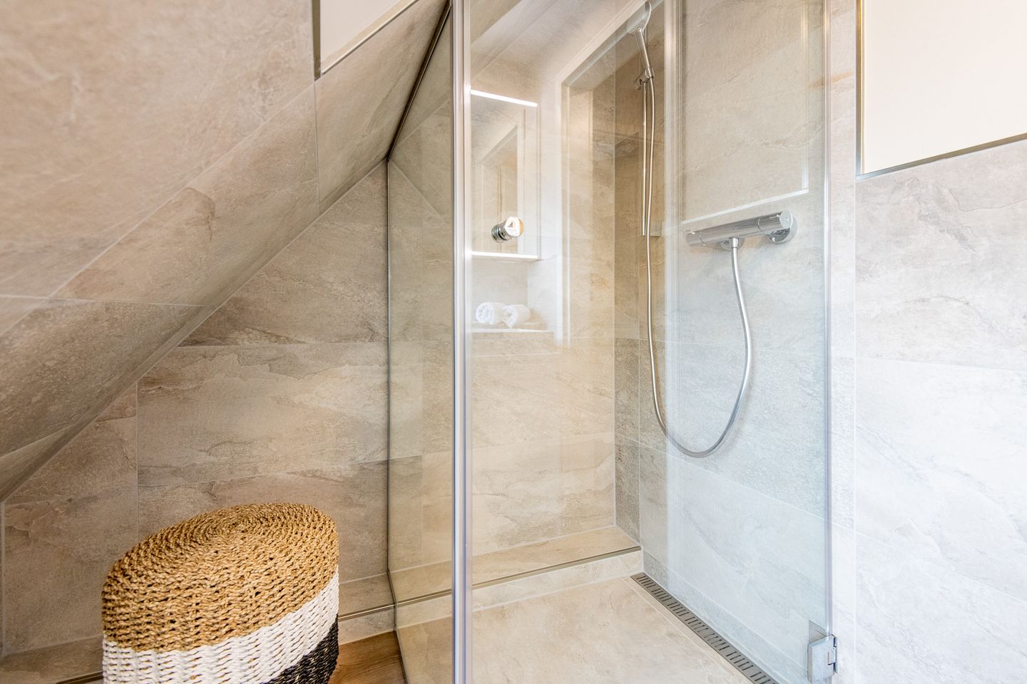 Es gibt zwei moderne Badezimmer: Das erste Badezimmer bietet eine ebenerdige Regendusche und WC, während das zweite Badezimmer ebenfalls eine ebenerdige Dusche und WC umfasst. Beide Badezimmer sind mit hochwertigen Materialien ausgestattet und bieten ein modernes Design für erfrischende Momente.