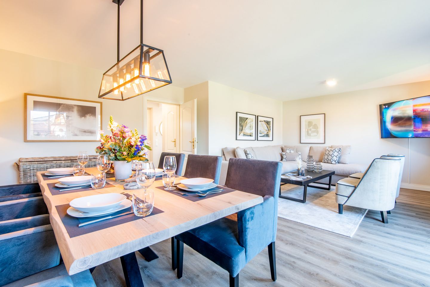 Das großzügige Wohnzimmer lädt mit einem bequemen Ecksofa und Smart TV zu erholsamen Stunden ein. Von hier aus haben Sie direkten Zugang zur möblierten Terrasse und zum gepflegten Garten, beide nach Westen ausgerichtet und ideal, um die Abendsonne zu genießen. Der offene Essbereich ist stilvoll gestaltet und bietet einen großen Esstisch für gesellige Abende und gemeinsame Mahlzeiten.