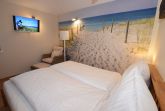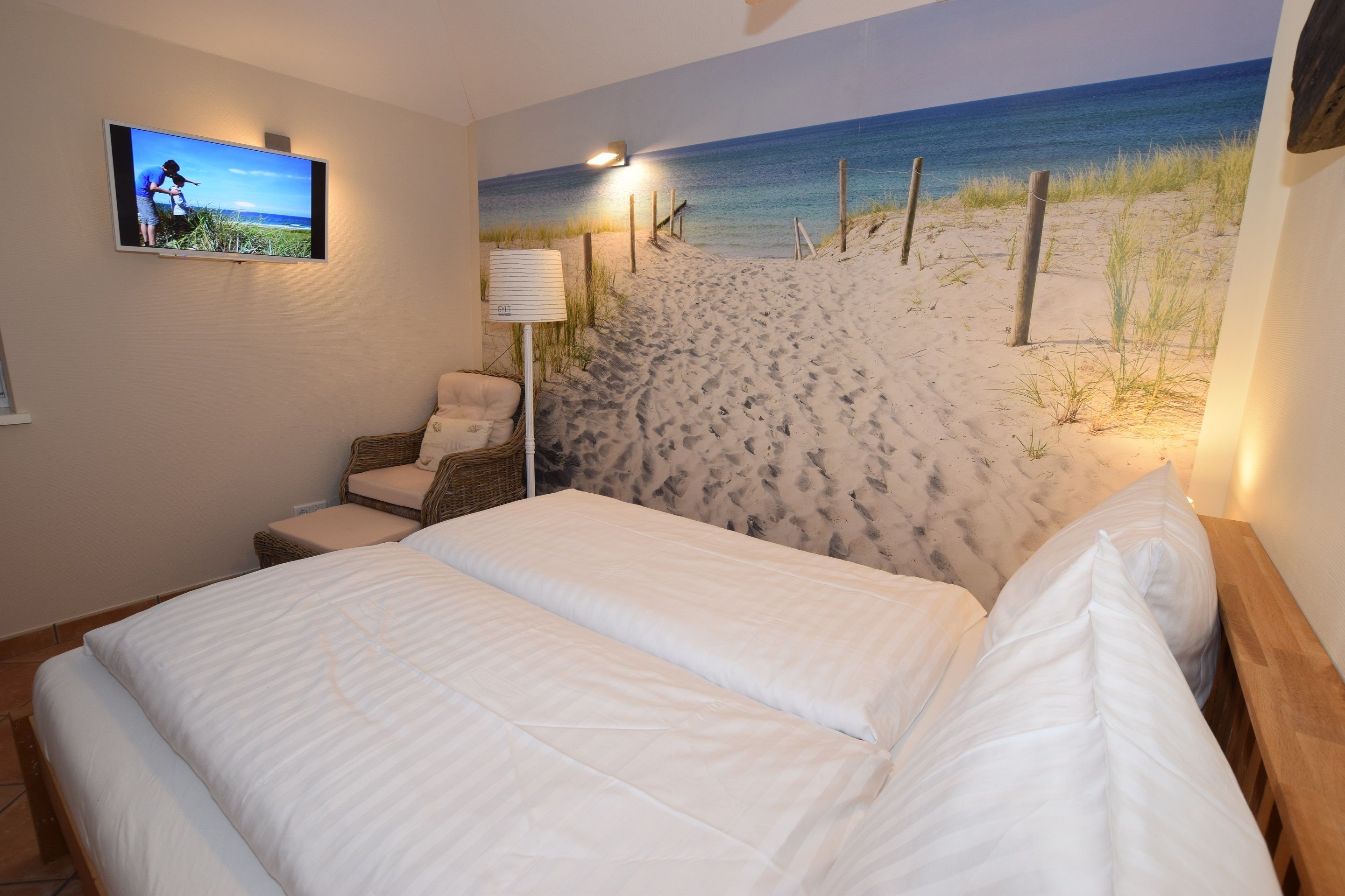 Der Wohn- und Schlafbereich ist durchdacht gestaltet: Ein komfortables Doppelbett (1,60 m x 2,00 m) mit zwei Einzelmatratzen und Bettdecken in Übergröße sorgt für erholsamen Schlaf. Ein an der Wand montierter Flachbild-TV (Kabelanschluss) sowie kostenfreies WLAN stehen für entspannte Stunden bereit.
