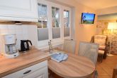 Die moderne Küchenzeile mit Essplatz ist bestens ausgestattet mit einem 2-Platten-Ceranfeld, Mikrowelle, Kühlschrank samt 3-Sterne-Gefrierfach sowie Kaffeemaschine, Wasserkocher und Toaster.
