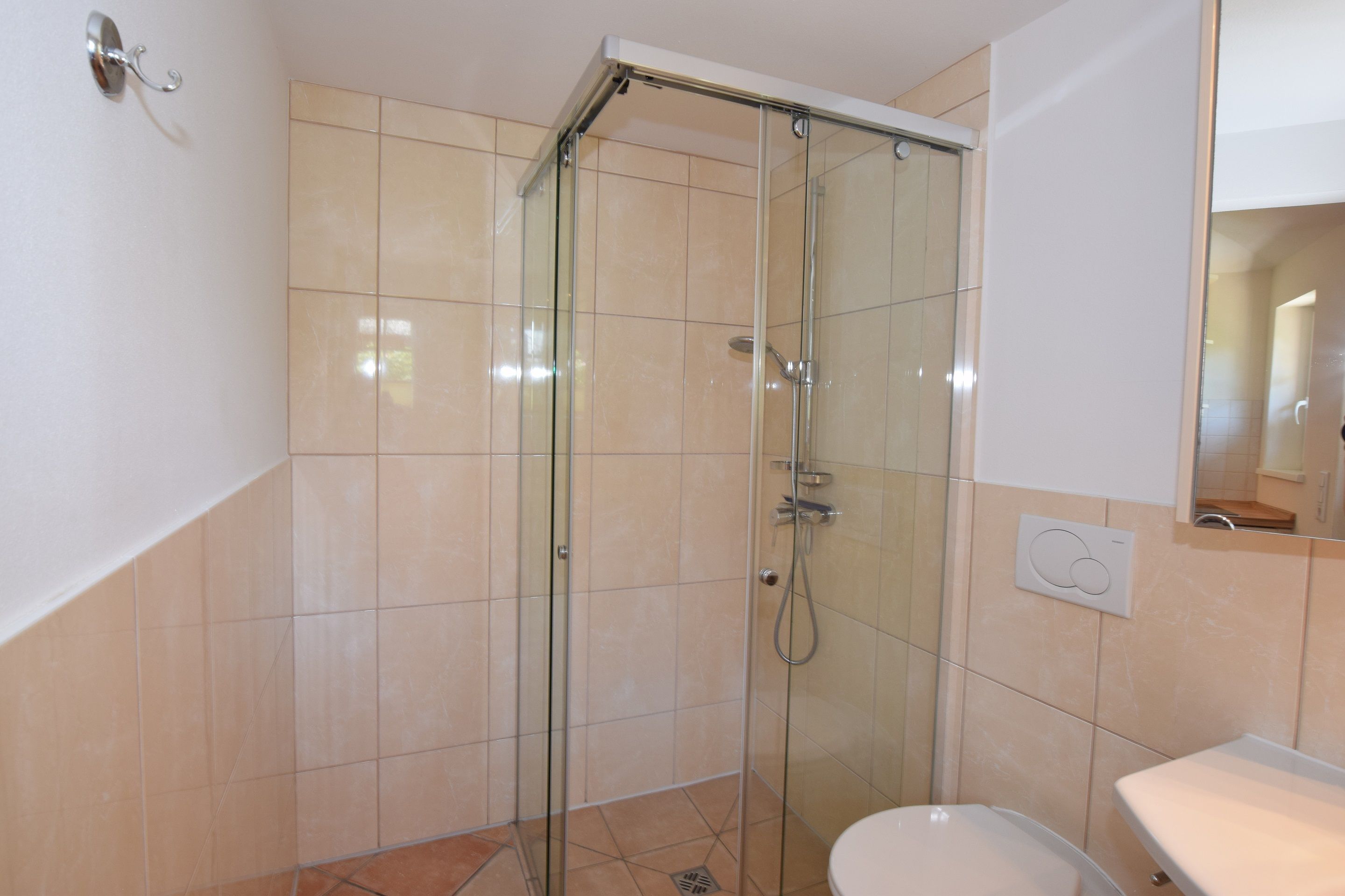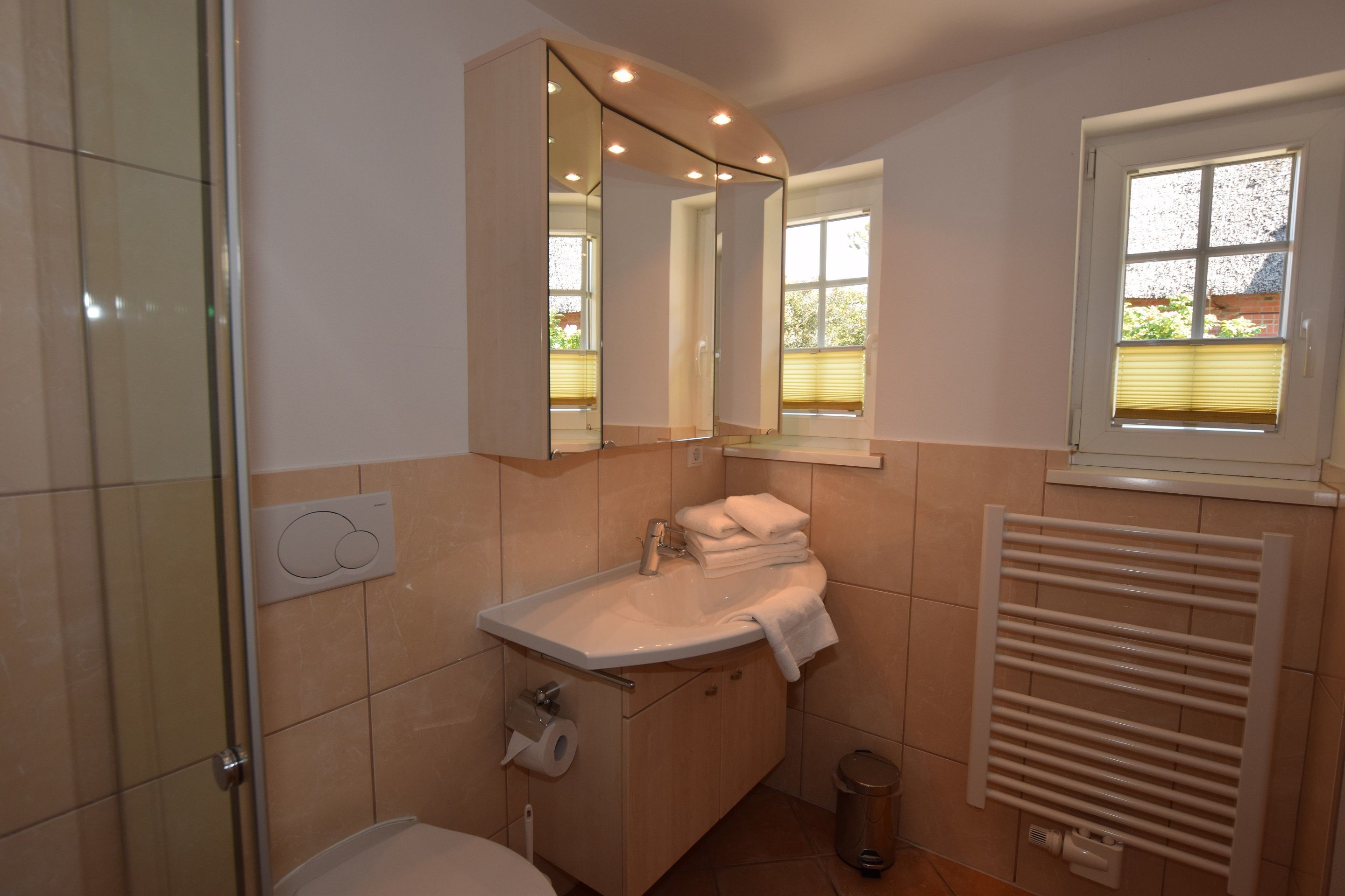 Das helle Badezimmer verfügt über eine ebenerdige Dusche, ein Fenster, einen Handtuchtrockner sowie einen Waschtisch mit Föhn.