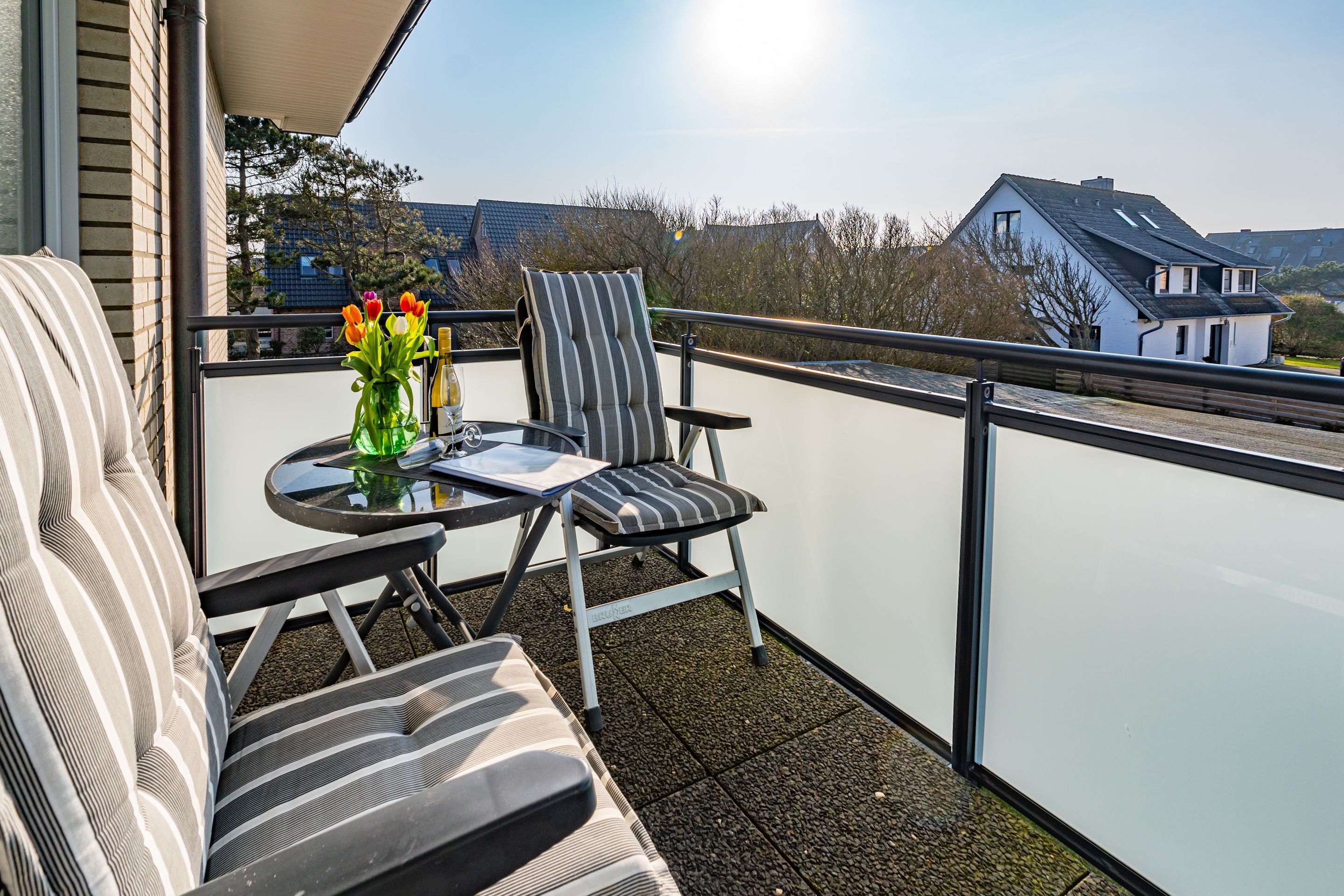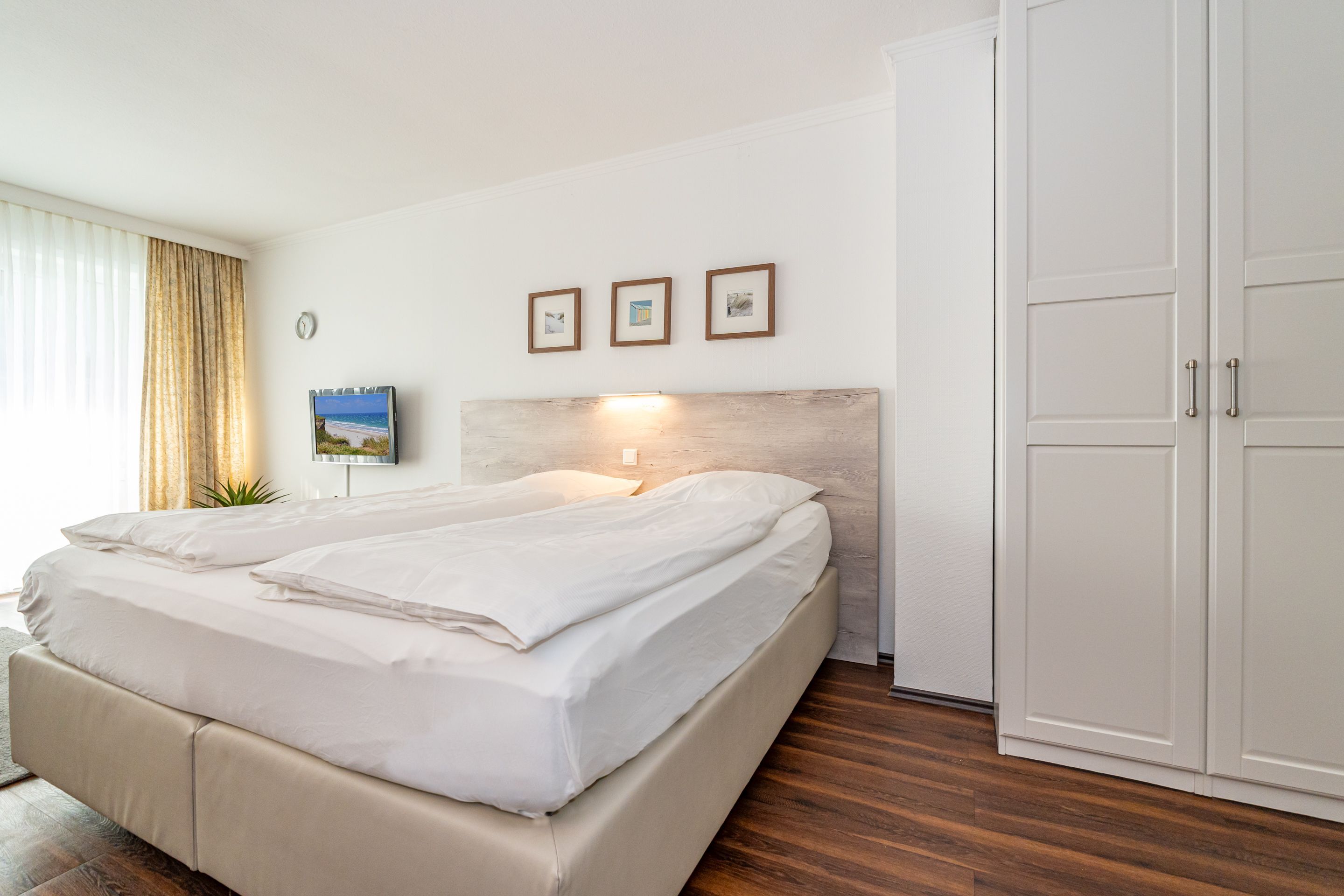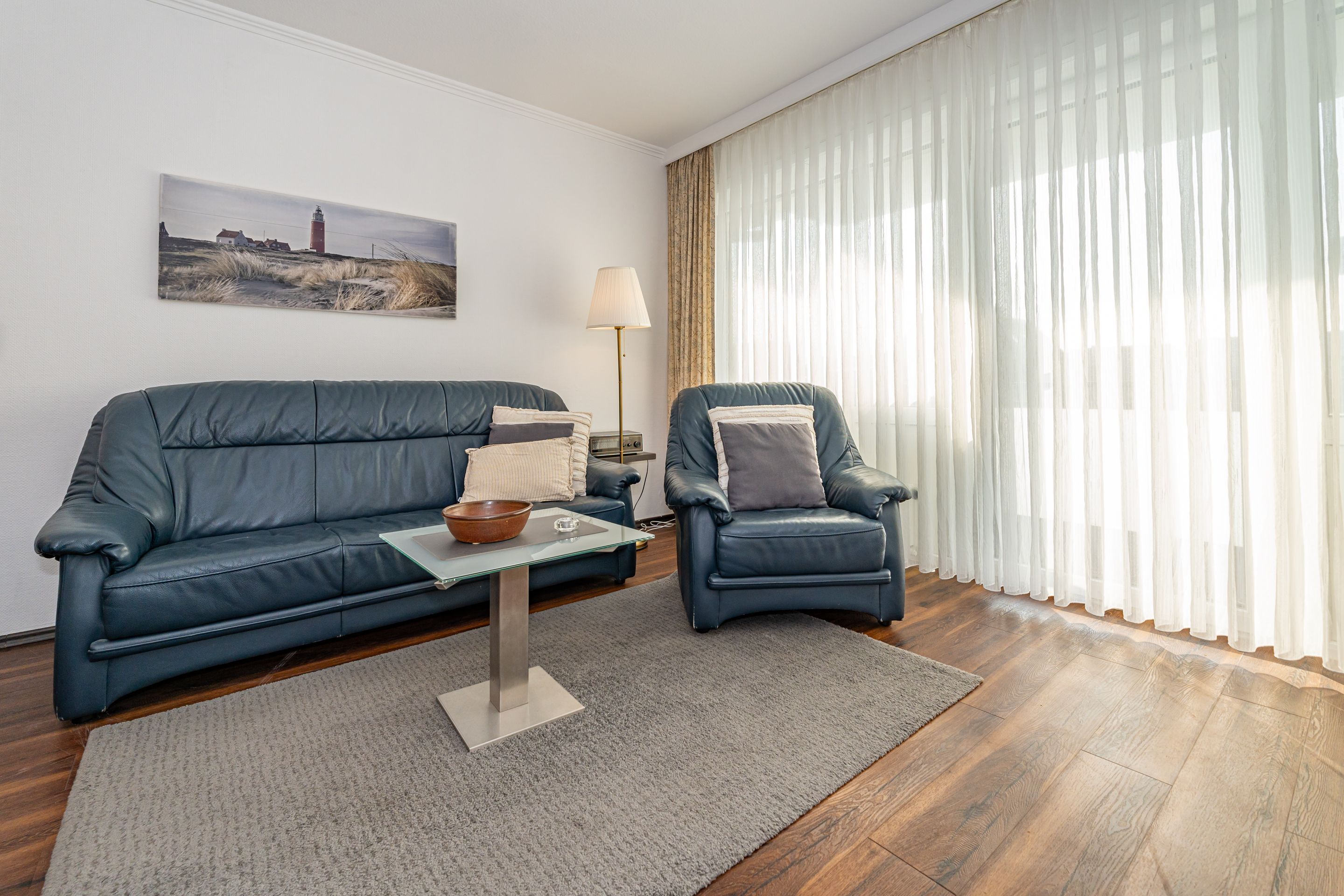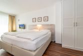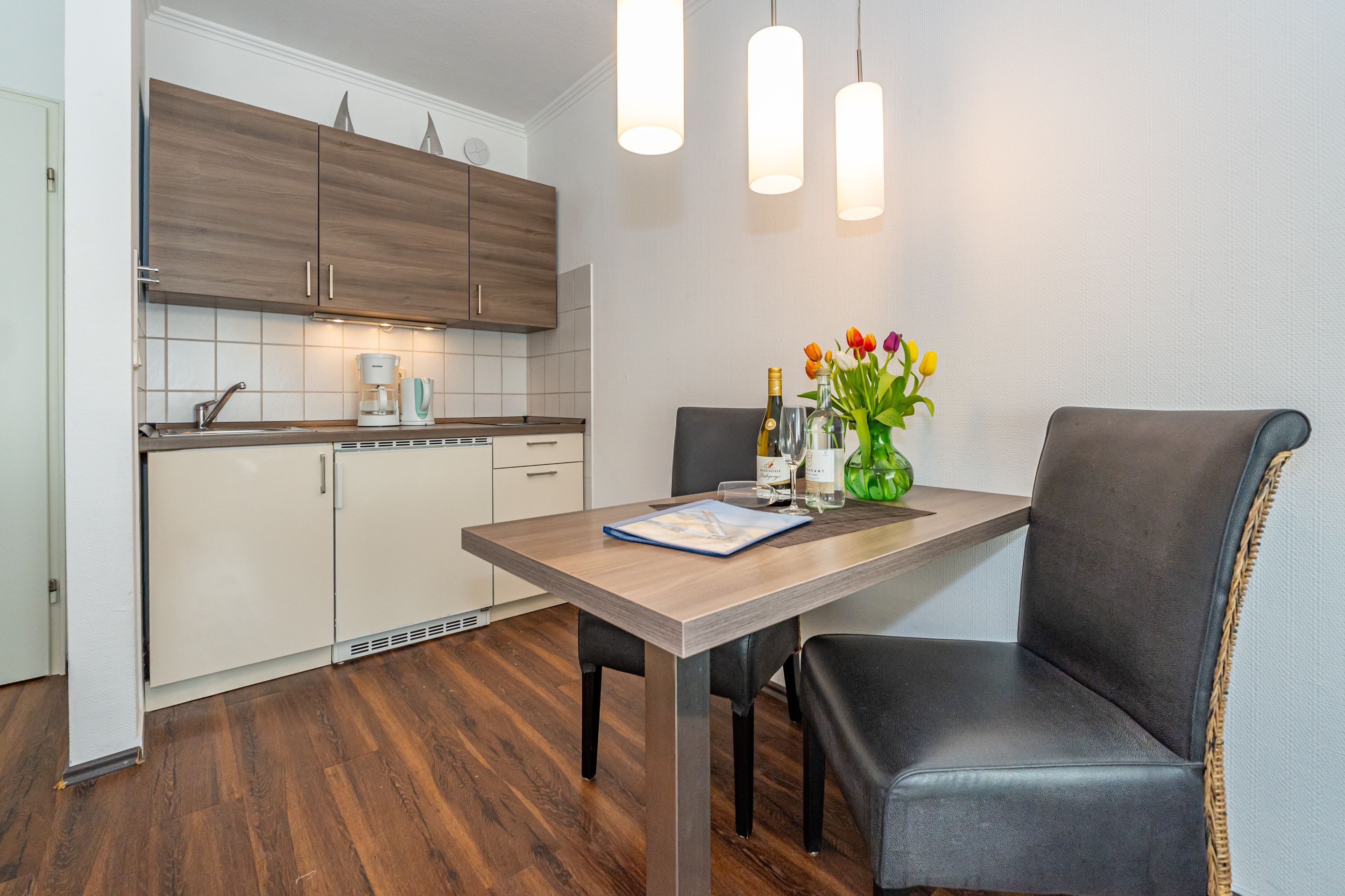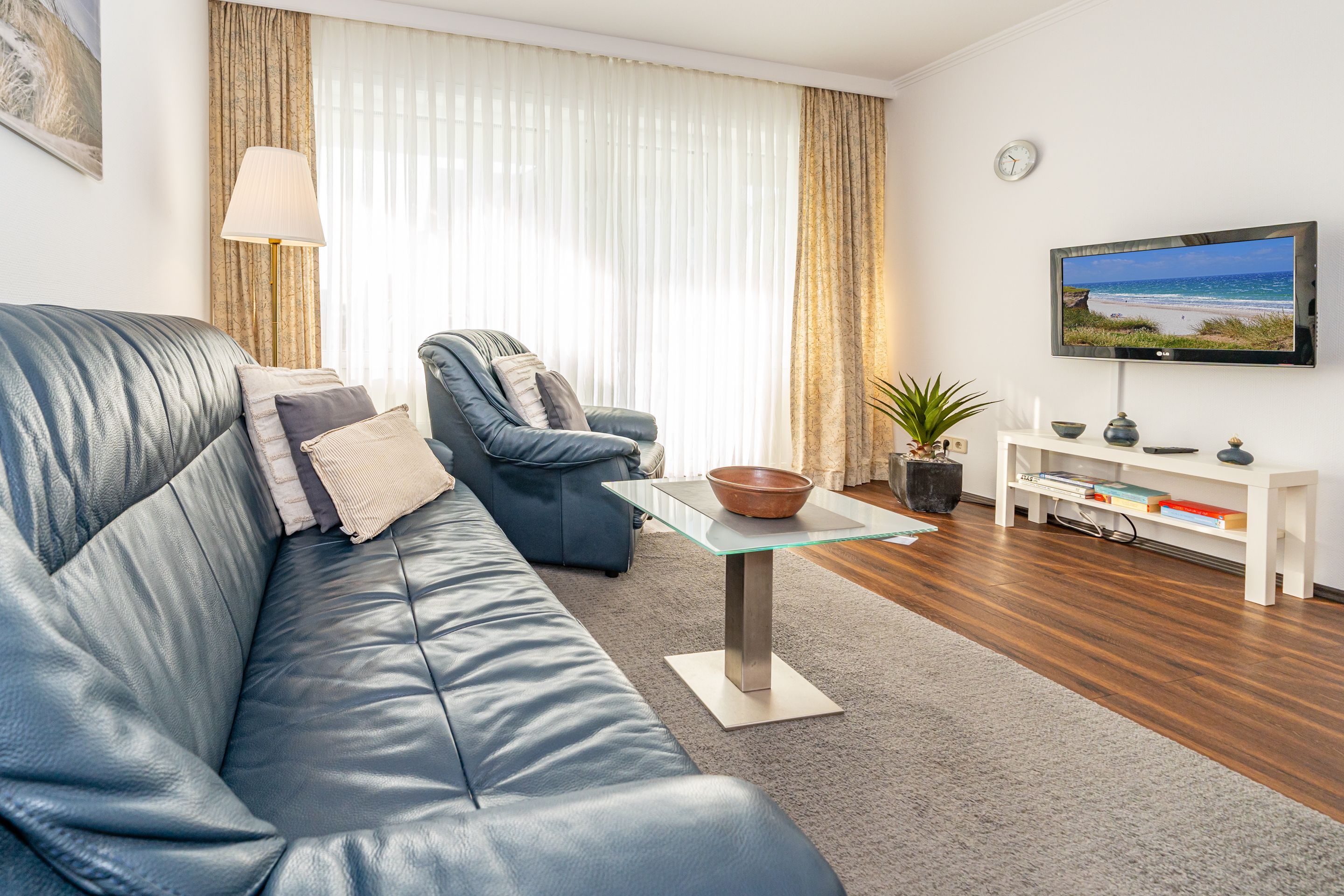 Gepflegte 1-Zimmer-Nichtraucher-Ferienwohnung (ca. 40 qm) mit optimalem Grundriss in der 1.Etage für 2 Personen mit großzügigem, sonnigen Westbalkon (mit Balkonmöbeln und Auflagen) und eigenem PKW-Stellplatz in der Tiefgarage. Vom Vorflur mit Garderobe gelangt man in den kombinierten Wohn-/Schlafraum mit Austritt zum Balkon und in das moderne, neuwertige Duschbad/WC. Der Wohn-/Schlafraum besteht aus einer gemütlichen Ledersitzgarnitur (ein Zweisitzer und ein Sessel), einer separaten Essecke und gutem Doppelbett (Boxspringbett (1,80 x 2 m) mit Einzelmatratzen + Topper, Komfortliegehöhe), Kabel-Flachbild-TV, Radio, Wlan und offener Küchenzeile. Kaffeemaschine, Wasserkocher und Toaster gehören zur Grundausstattung.