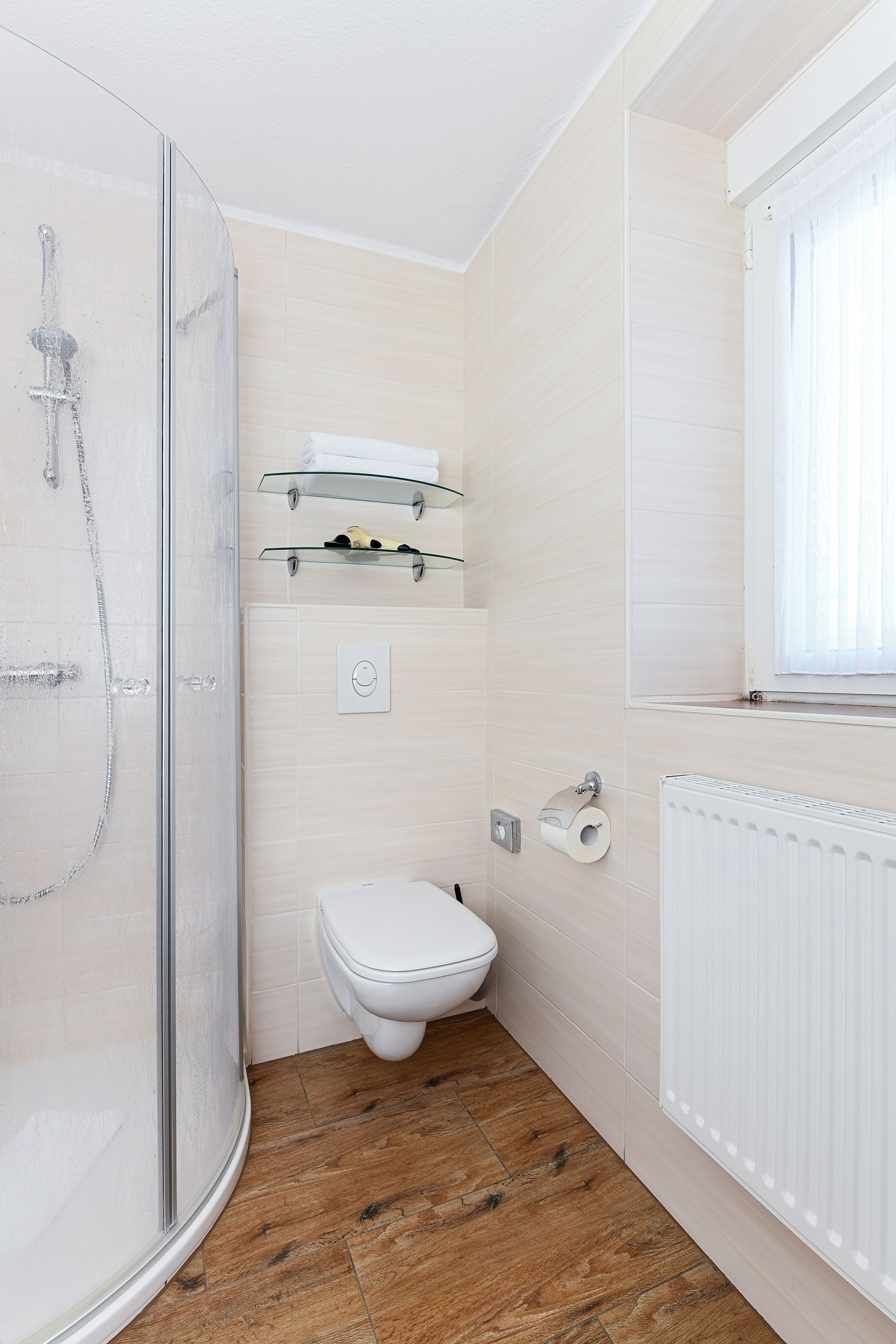 Größe ca. 16 Quadratmeter, Zimmer, Badezimmer mit Dusche, Waschtisch und WC, 1. Obergeschoss, optimal für 1 bis 2 Personen.