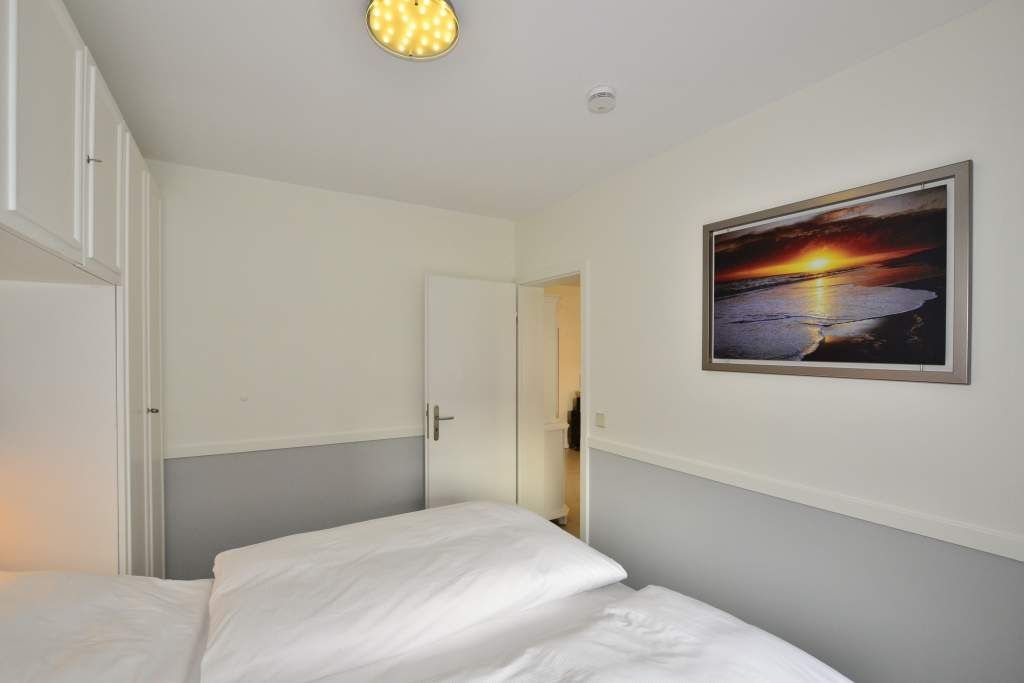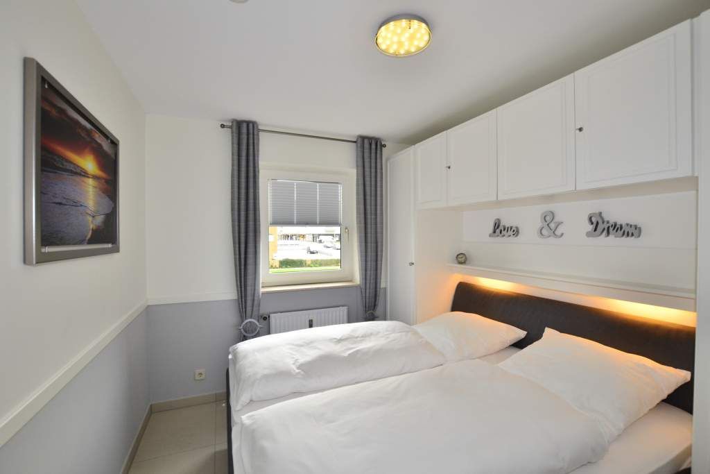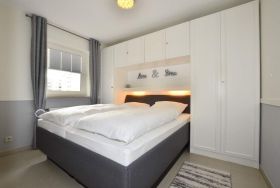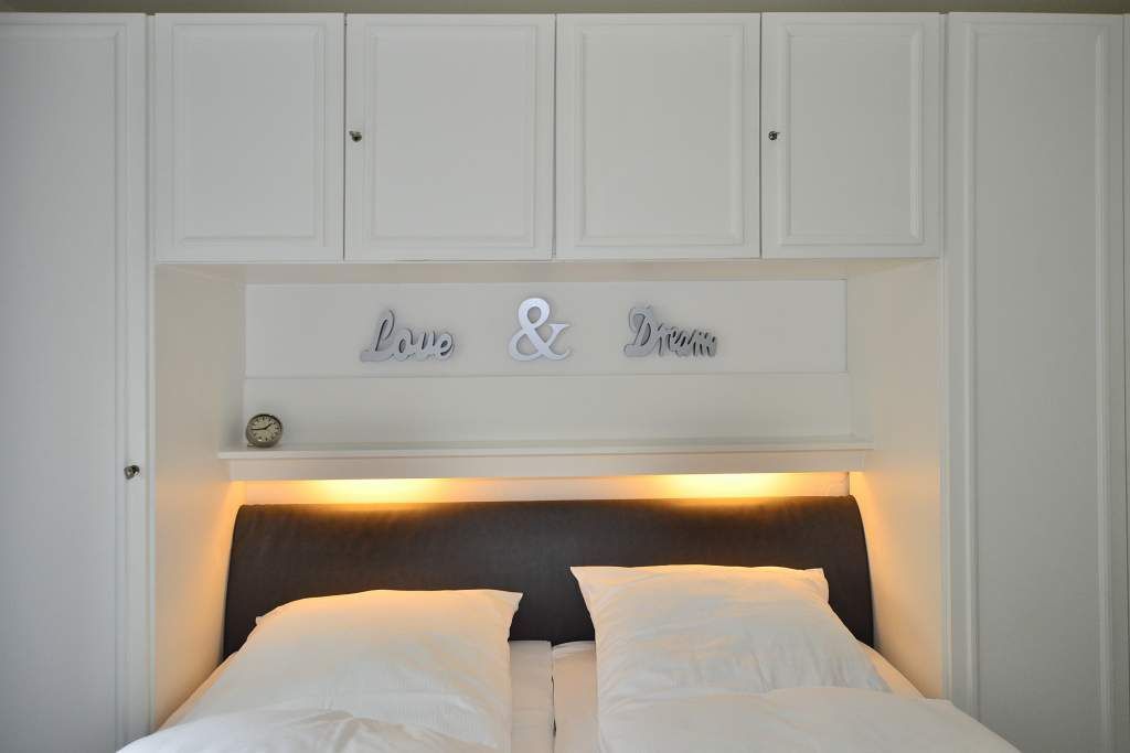 Das qualitativ hochwertigen Doppelpolsterbett von RUF (Liegefläche 1,80 x 2 m, mit 2 Einzelmatratzen, Komfort-Liegehöhe ca. 60 cm) im angrenzenden Schlafzimmer garantiert erholsamen Schlaf von Anfang an. Die beidseitigen Kleider- und Oberschränke bieten viel Stauraum für mitgebrachtes Gepäck.