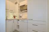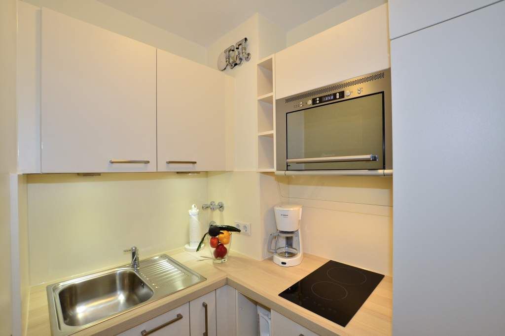 Die hochwertige zum Wohnraum hin offene Einbauküche ist mit Geschirrspüler, 2-Platten-Ceranfeld, Mikrowelle und Kühlschrank mit 3-Sterne-Gefrierfach vollumfänglich ausgestattet. Kaffeemaschine, Wasserkocher und Toaster gehören dabei zur Grundausstattung.
