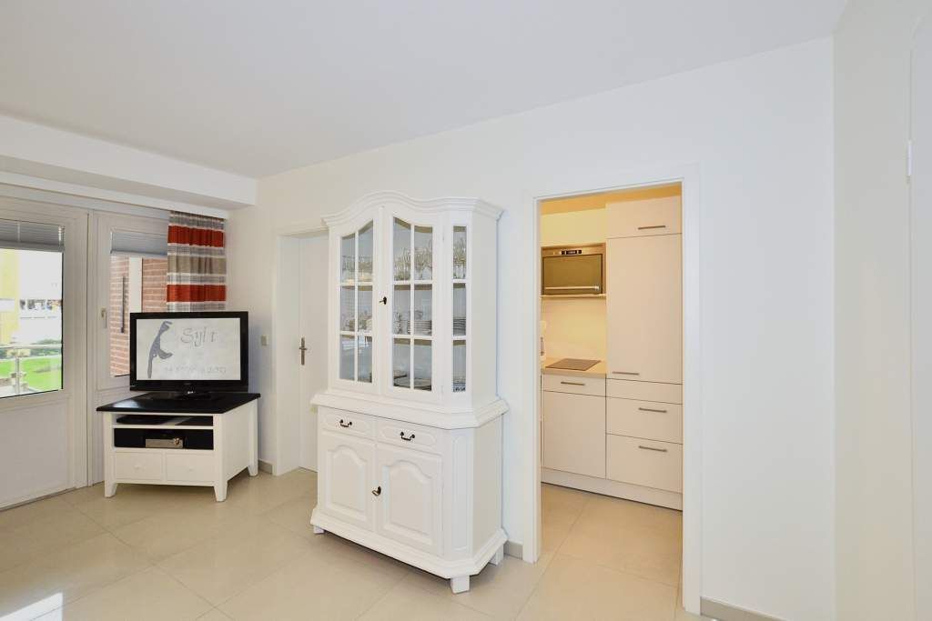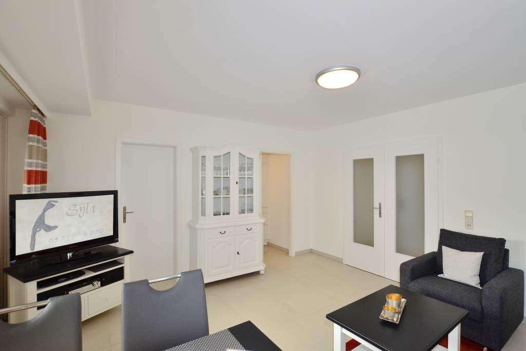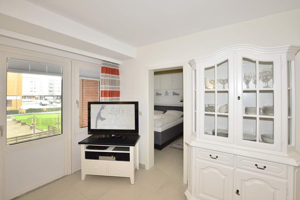 Der Wohnraum ist mit einem gemütlichen Schlafsofa (mit ausklappbarer separater Matratze, Liegefläche 1,80 x 2,00, Komfort-Liegehöhe ca. 60 cm), einen bequemen Sessel und einem separaten Essplatz ausgestattet. An Technik steht ein Kabel-Flachbild-TV, Radio, DVD-Player sowie ein Telefon zur Verfügung.