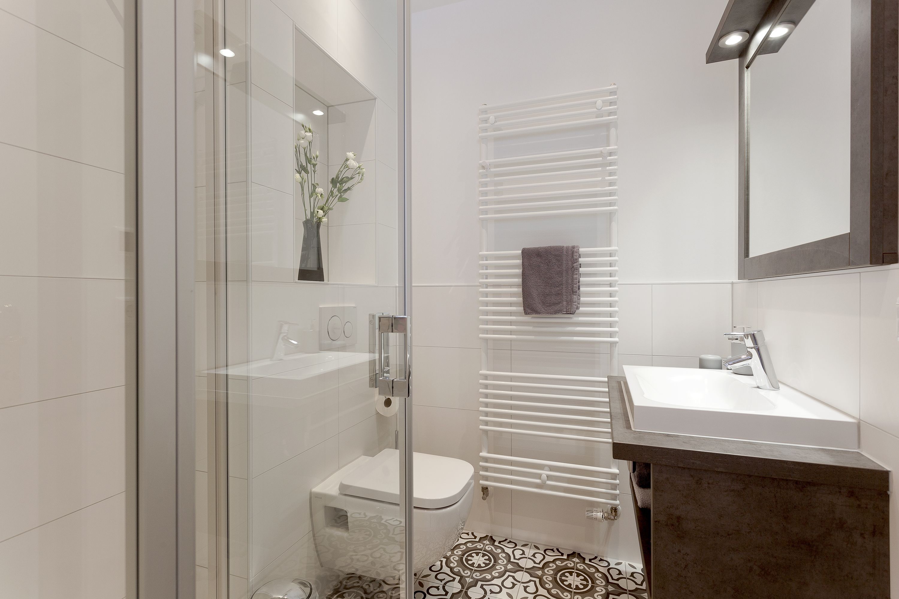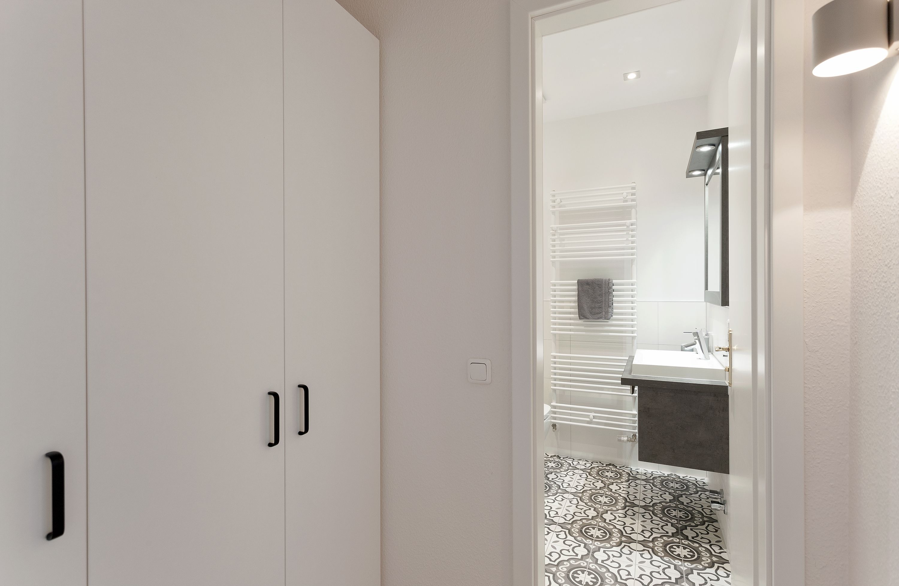 Das innenliegende Bad, ebenfalls frisch renoviert, verfügt über eine Dusche, WC, Waschbecken, Handtuchheizkörper und einen Haartrockner ideal, für einen guten Start in den Tag.