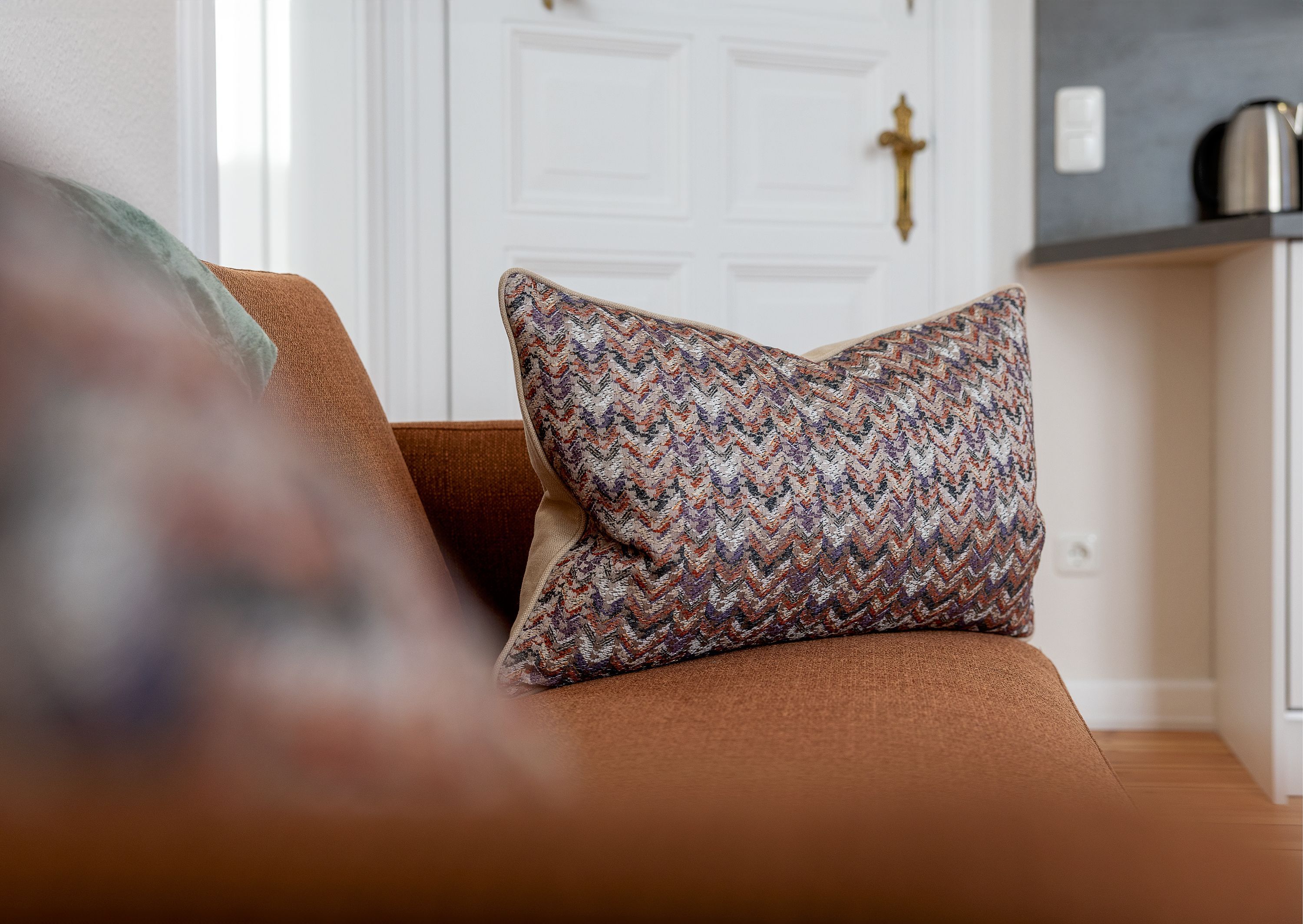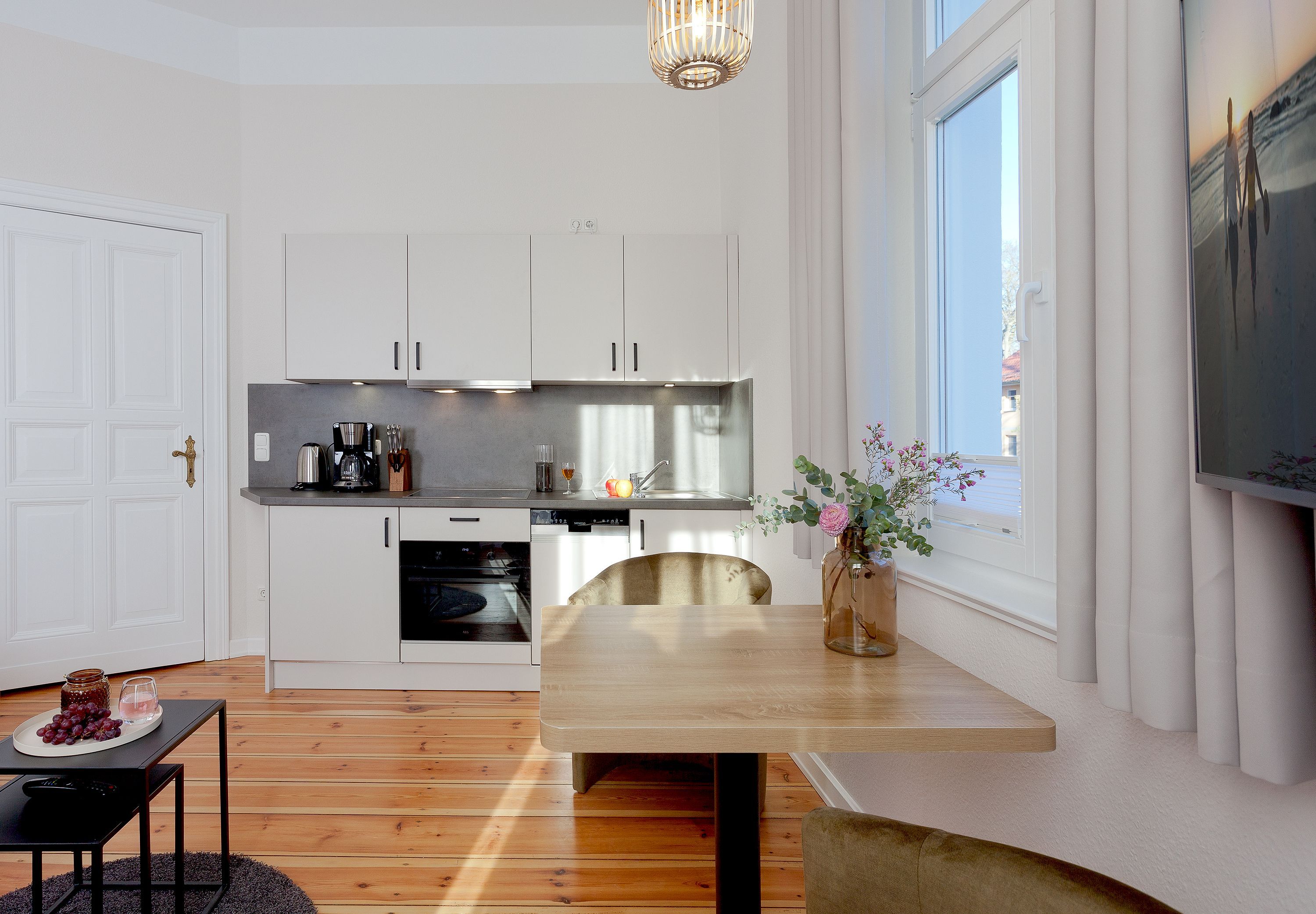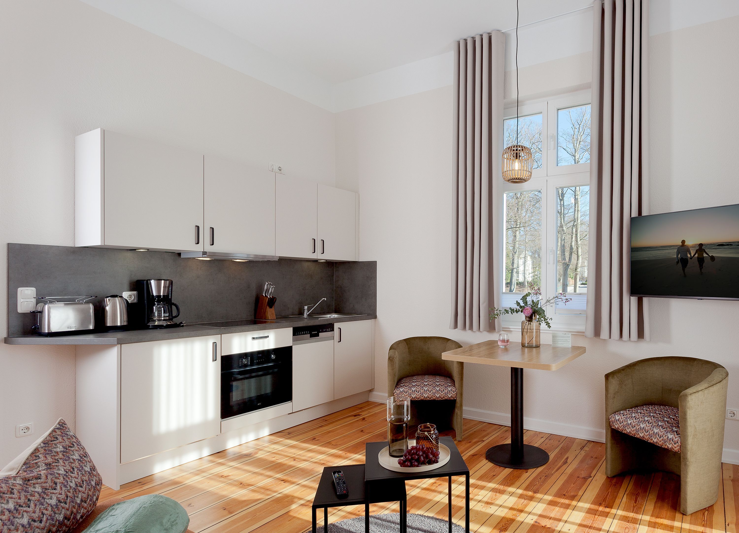 Unser Appartement 12 im 2. Obergeschoss wurde im Winter 2024 - 25 renoviert und erstrahlt nun in neuem Glanz. Mit ca. 38 qm bietet das Appartement alles, was es für einen erholsamen Aufenthalt mit bis zu 2 Personen benötigt. Die neue, moderne Single-Küchenzeile ist vollausgestattet mit einem Cerankochfeld, Kühlschrank mit Gefrierfach, Backofen mit integrierter Mikrowelle, Spülmaschine sowie Kaffeemaschine, Wasserkocher und Toaster.