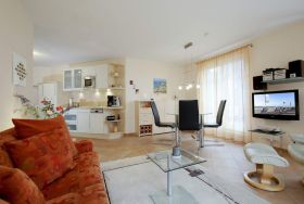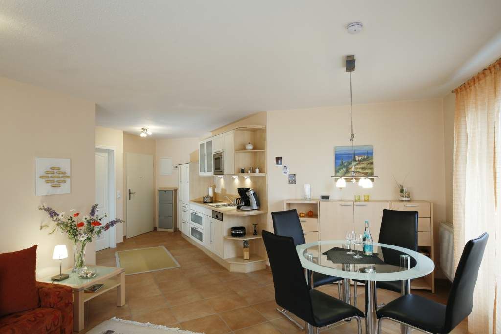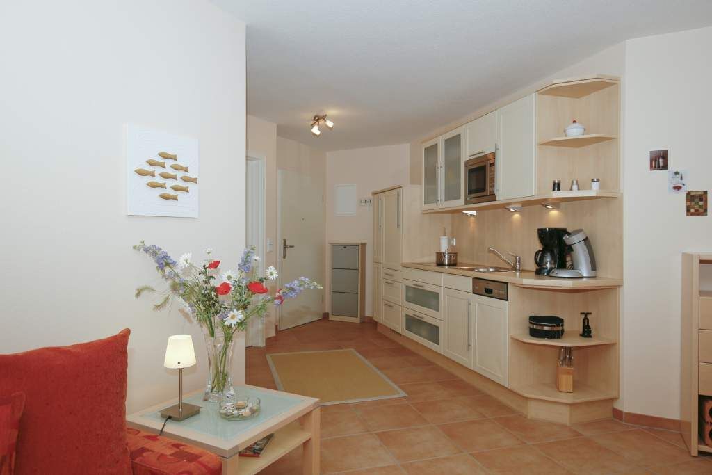 Das geräumige mit Fliesen ausgelegte Wohnzimmer ist mit einer gemütlichen Sitzecke mit Sofa (mit Schlaffunktion, 1,50 x 2,00m), Stressless-Sessel und dazugehörigem Fußhocker, Essplatz, moderner, offener Küchenzeile, Flachbildfernseher mit Kabelanschluss sowie Garderobe ausgestattet. Vom Wohnraum erreicht man den sonnigen Südwestbalkon (mit Balkonmöbeln), das großzügige Schlafzimmer und das Badezimmer.