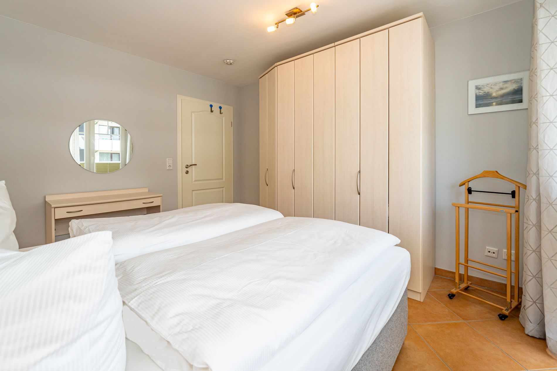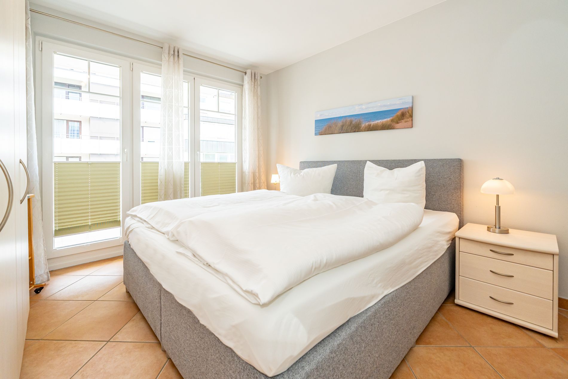 Das Schlafzimmer hat ein Doppelbett mit durchgängiger Matratze (1,80 x 2,00m) mit Austritt zum separaten, zweiten Balkon (Westseite).