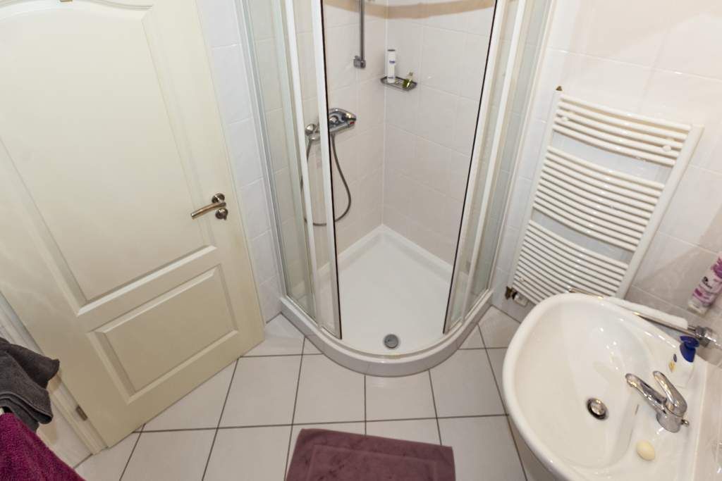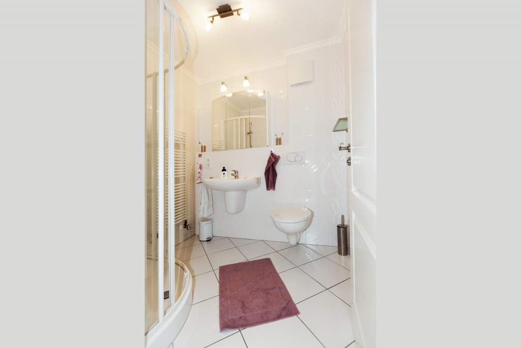 Im modernen Badezimmer befinden sich eine Dusche mit flachem Einstieg, ein Waschtisch, ein Handtuchtrockner, ein Fön sowie das WC.