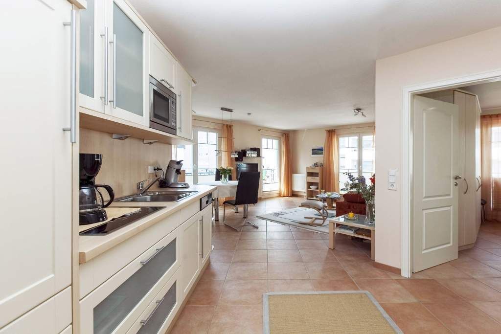 Die Küchenzeile ist mit Geschirrspüler, Mikrowelle, 2-Platten-Ceranfeld und Kühlschrank mit 3-Sterne-Gefrierfach ausgestattet. Kaffeemaschine, Wasserkocher und Toaster gehören zur Grundausstattung.
