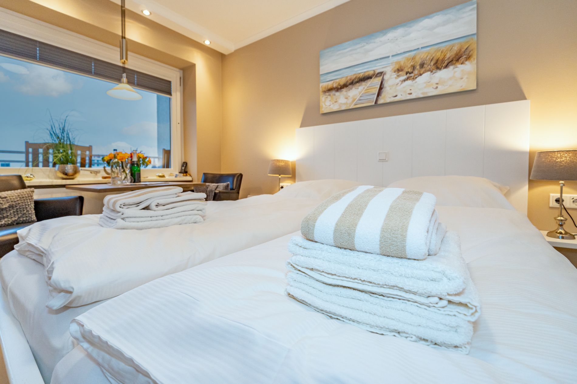 Aufwendig renovierte 1-Zimmer-Nichtraucher-Ferienwohnung mit modernem Designerboden in Holzoptik, ca. 24 qm in der 4. Etage (Fahrstuhl im Haus) zur Ostseite mit weitem Blick über Westerland. Kombinieter Wohn/Schlafraum mit feststehendem Tischler-Doppelbett (Liegefläche 1,60 x 2m, mit guten Einzelmatratzen), großer Flachbild-TV, Kleiderschrank, Essplatz am Fenster mit 2 bequemen Stühlen, WLAN und kostenlose Telefonie ins deutsche Festnetz (Handynummern gesperrt), offene neue Einbau-Küchenzeile mit Mikrowelle, Nespresso-Maschine, Ceranfeld (2 Kochfelder) und Spülmaschine. Kaffeemaschine, Wasserkocher und Toaster gehören zur Grundausstattung, Neues Duschbad/WC, Ostbalkon mit Balkonmöbeln (Hochlehner) und Auflagen (Morgensonne).