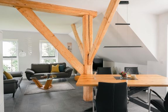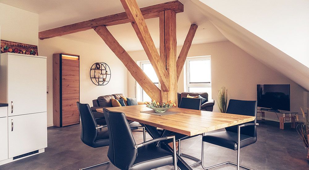 Besonderes Flair entsteht auch hier durch das offene Gebälk des alten Bauernhauses, welches optische Akzente setzt und zur gemütlichen Atmosphäre der Wohnung beiträgt. Bis zu 4 Personen können in dieser Wohnung den Urlaub genießen. Hierfür steht neben einem Schlafzimmer mit einem Doppelbett noch ein kleines Zimmer mit zwei Einzelbetten zur Verfügung. Ebenfalls gehört zu dieser Wohnung auch ein Balkon der Ihnen z. B. in den Abendstunden einen herrlichen Rückzugsort mit Blick auf die Weser bietet.