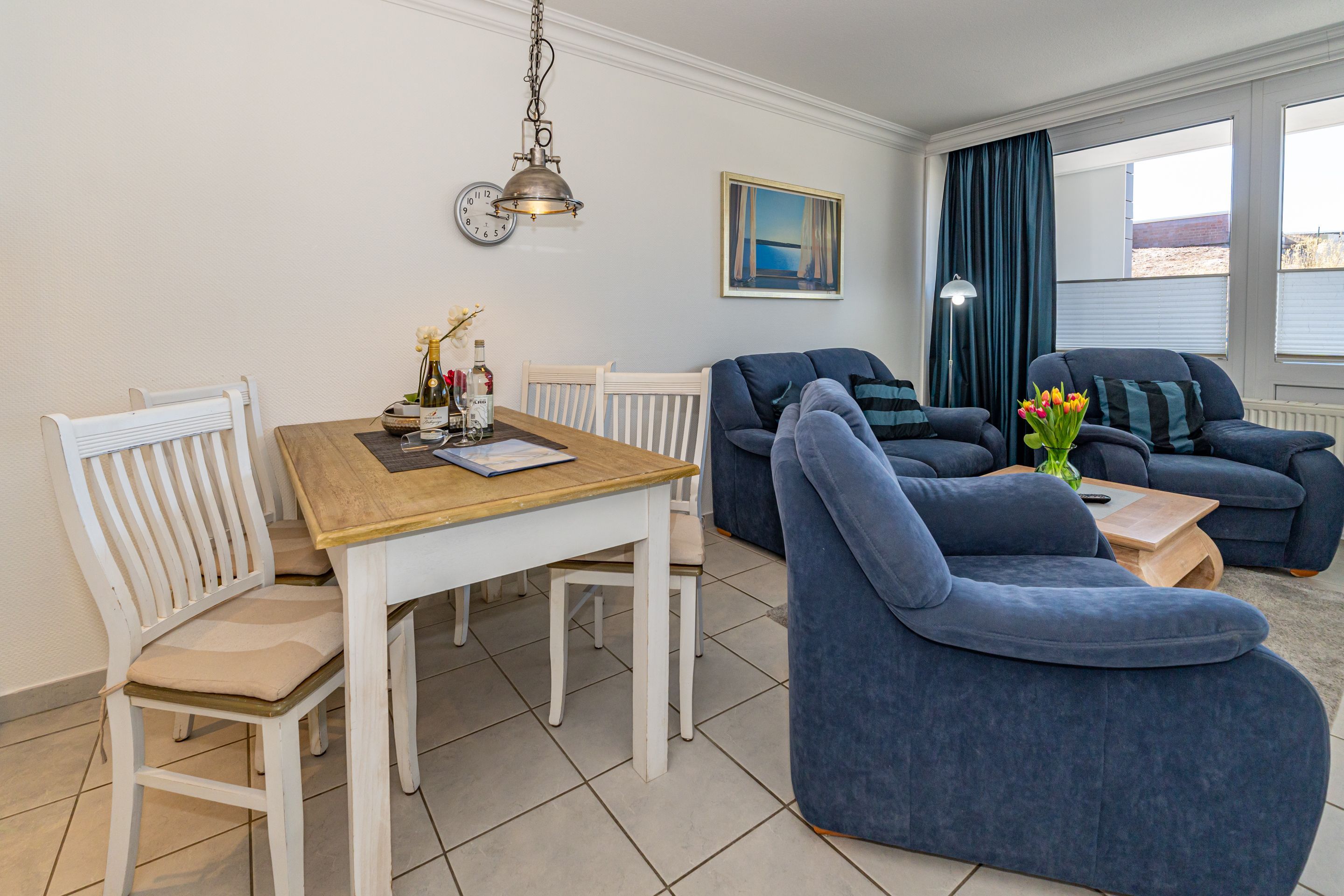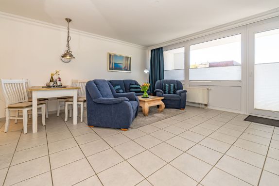 Komplett mit Fliesen ausgelegte 2-Zimmer-Nichtraucher-Ferienwohnung, ca. 51 qm im Hochparterre zur Seeseite mit Westloggia (Nachmittagssonne, mit Balkonmöbeln und Auflagen) für max. 4 Personen.