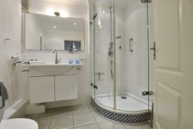 Im neuen Bad befinden sich eine Runddusche, ein WC, ein Waschtisch, ein Handtuchtrockner und ein Fön.