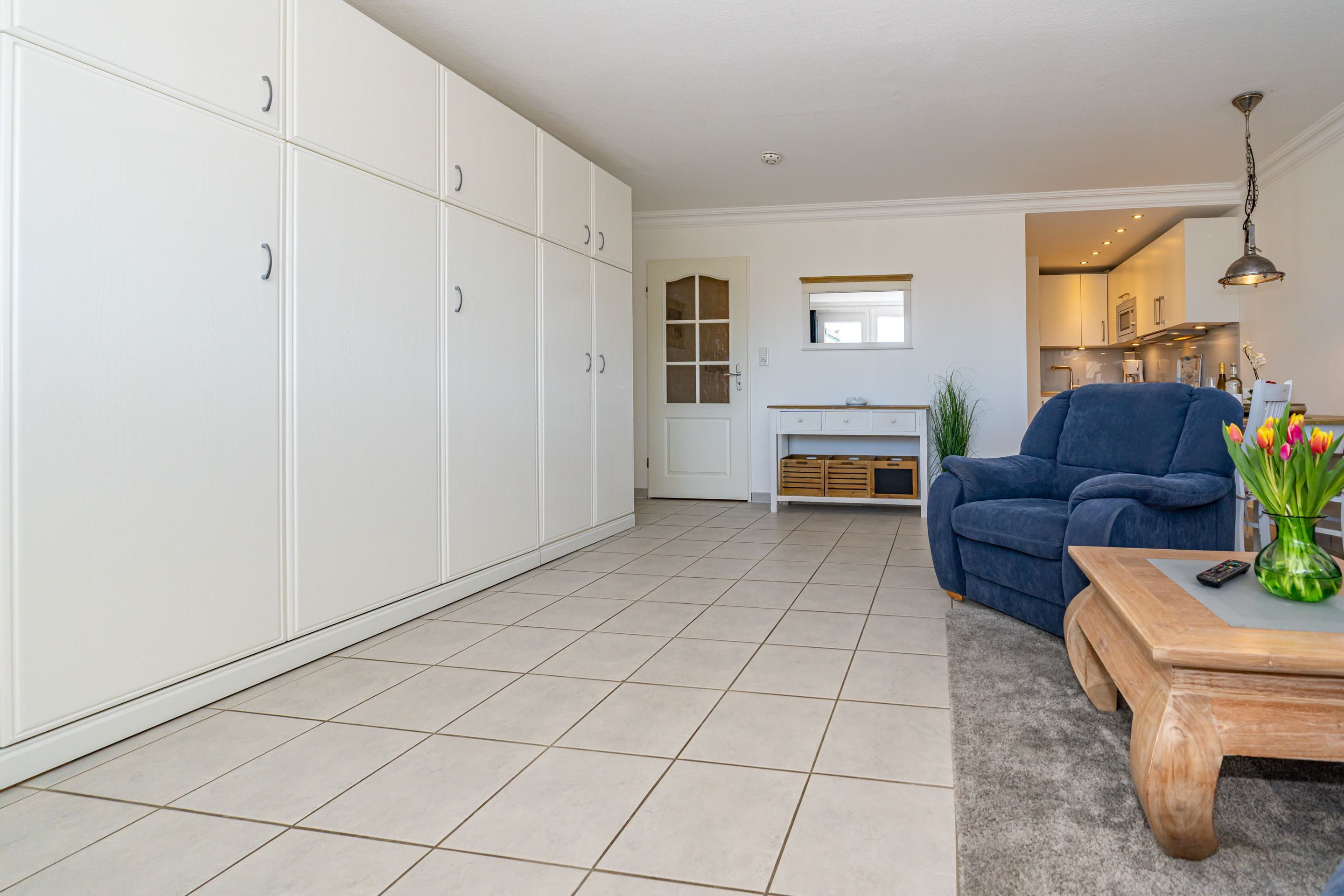 Der Wohnraum besteht aus einer bequemen Sitzgarnitur (2-Sitzer-Couch und zwei Sessel), einem Essplatz, einem Doppelschrankbett, Kabel-Flachbild-TV, HiFi-Anlage, und einer offenen Küche.
