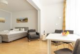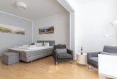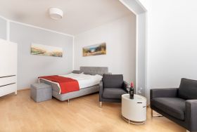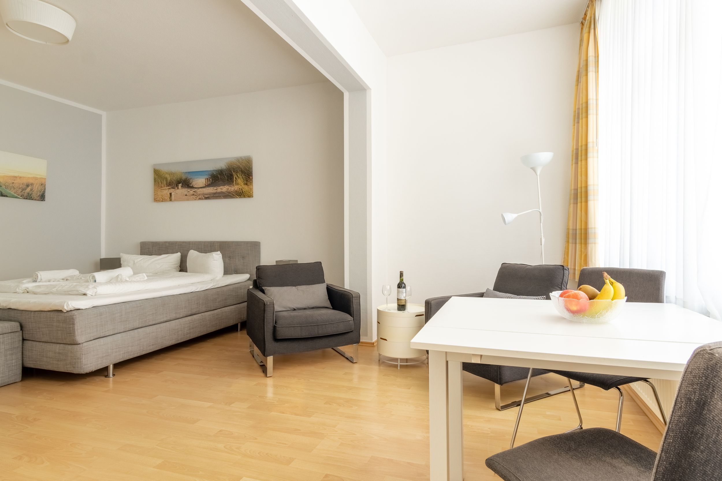 Unsere 35 qm großes 1- Raum Apartments bieten Ihnen gemütliche und moderne Wohnqualität. Es ist für 2 Personen geeignet. Eine Aufbettung mit einem Babyreisebett ist möglich.
