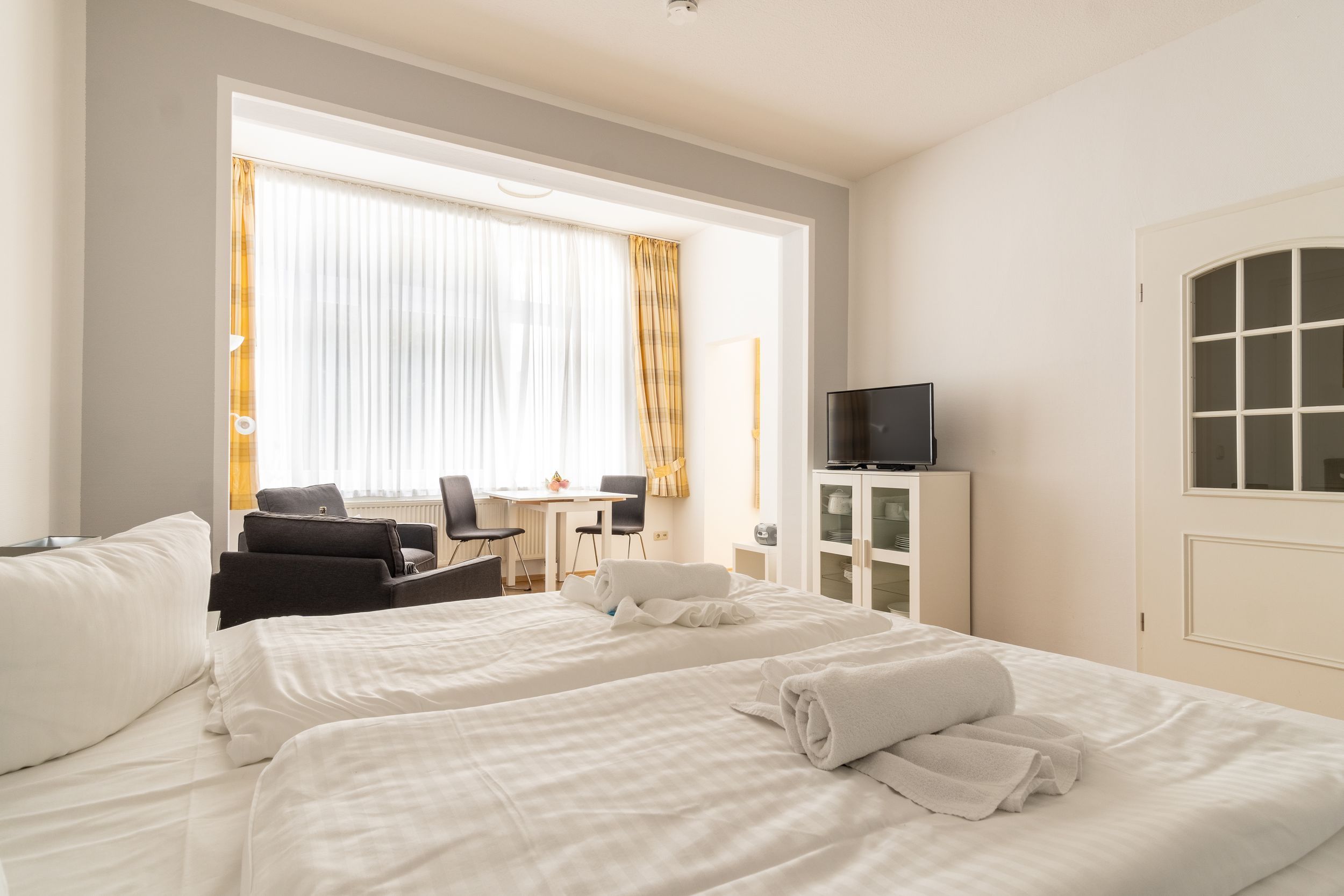 Im modern eingerichteten Wohn- Schlafzimmer steht Ihnen ein Doppelbett, eine gemütliche Sitzecke, ein Essbereich und TV zur Verfügung.,