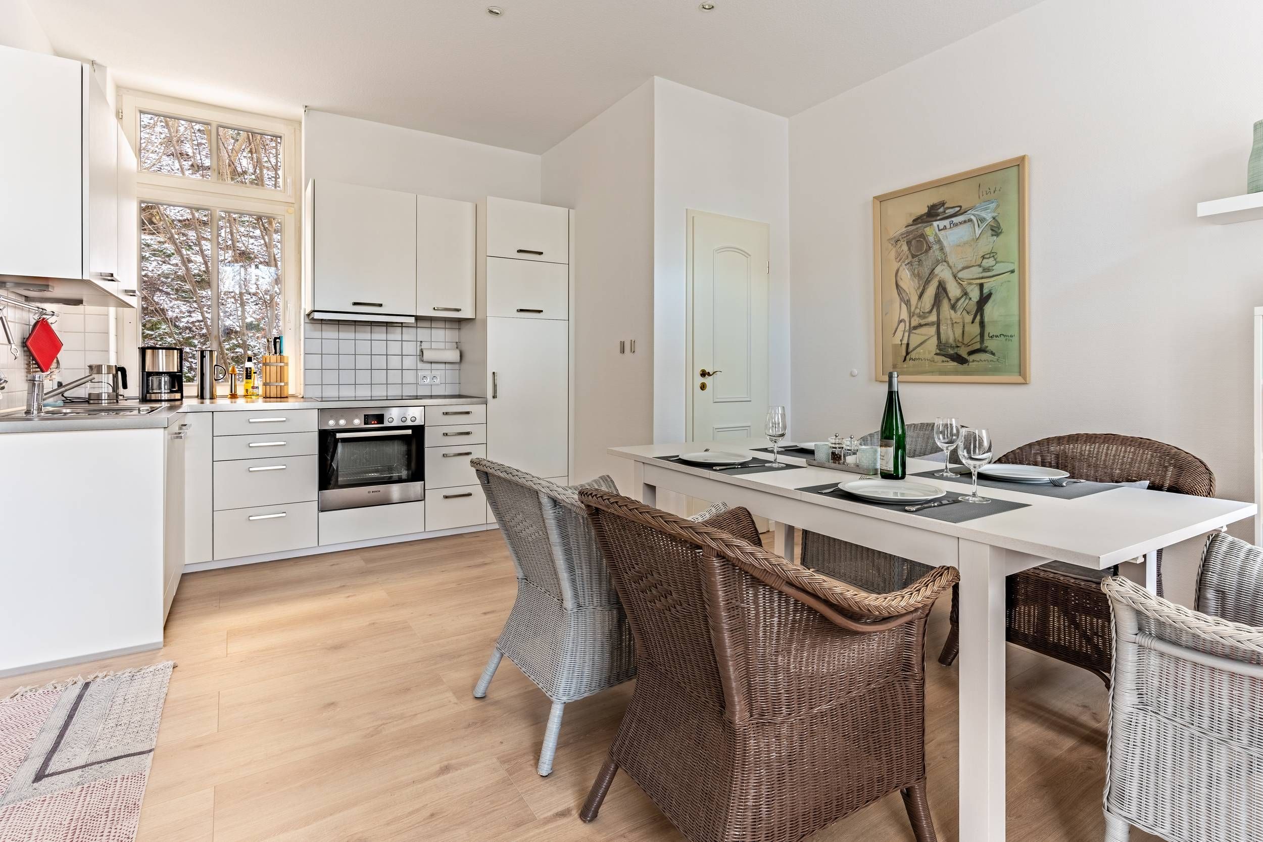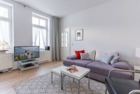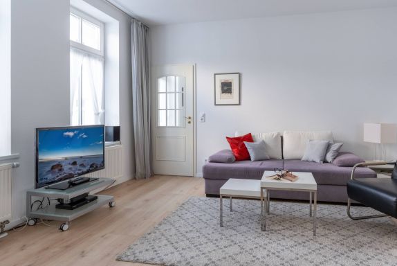 An dem großzügigen und gemütlichen Wohnbereich schließt sich eine offene Küche an, in der das Kochen Spaß macht. Neben Backofen, Geschirrspüler und Gefriermöglichkeit sind natürlich auch Gläser, Besteck und Elektrogeräte vorhanden. Der großzügige Essbereich befindet sich auch im Wohnbereich. Über diesen haben Sie Zugang zum möblierten Balkon. Die funktionale Couch im Wohnbereich bietet in kürzester Zeit eine Schlafmöglichkeit für 2 weitere Personen.