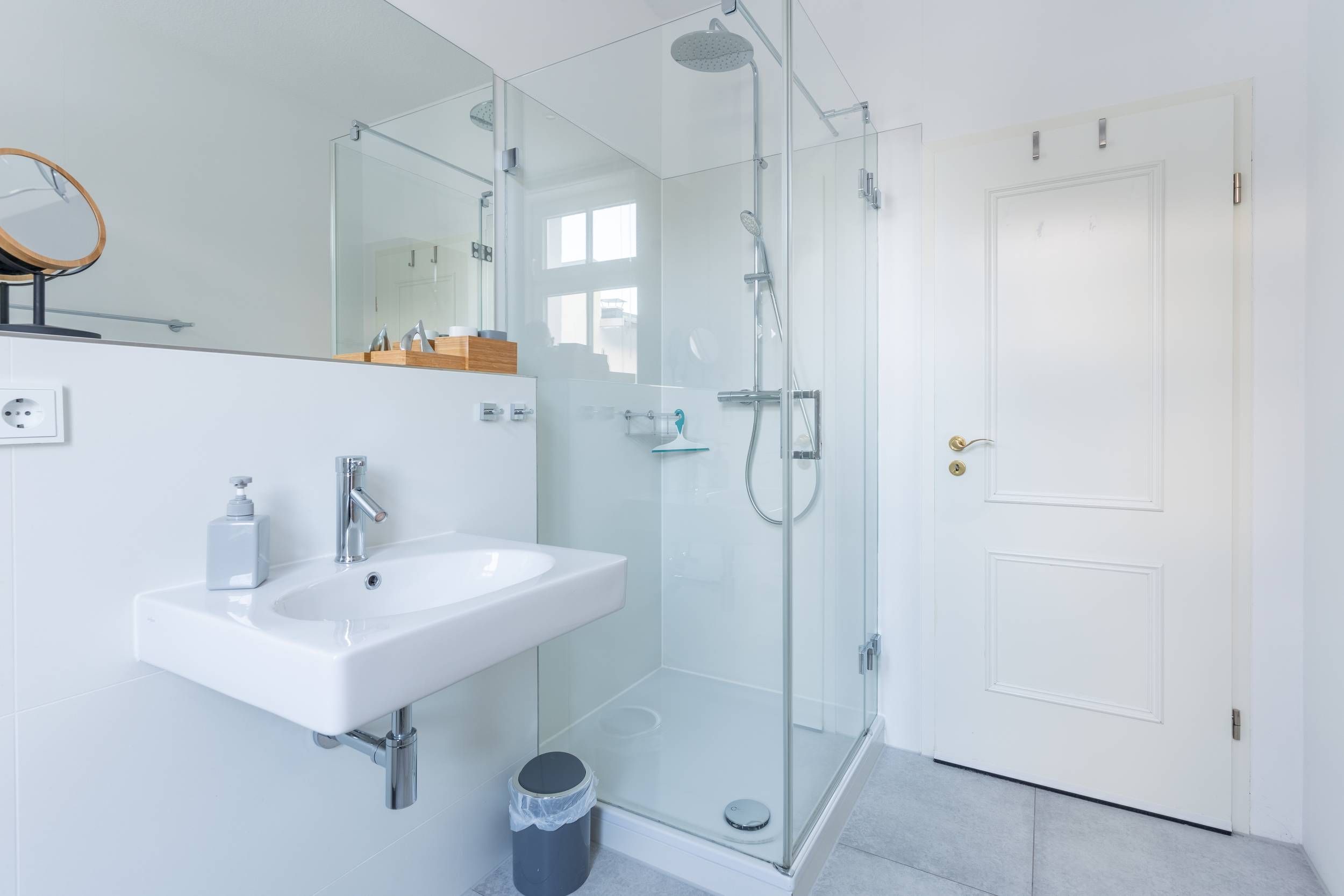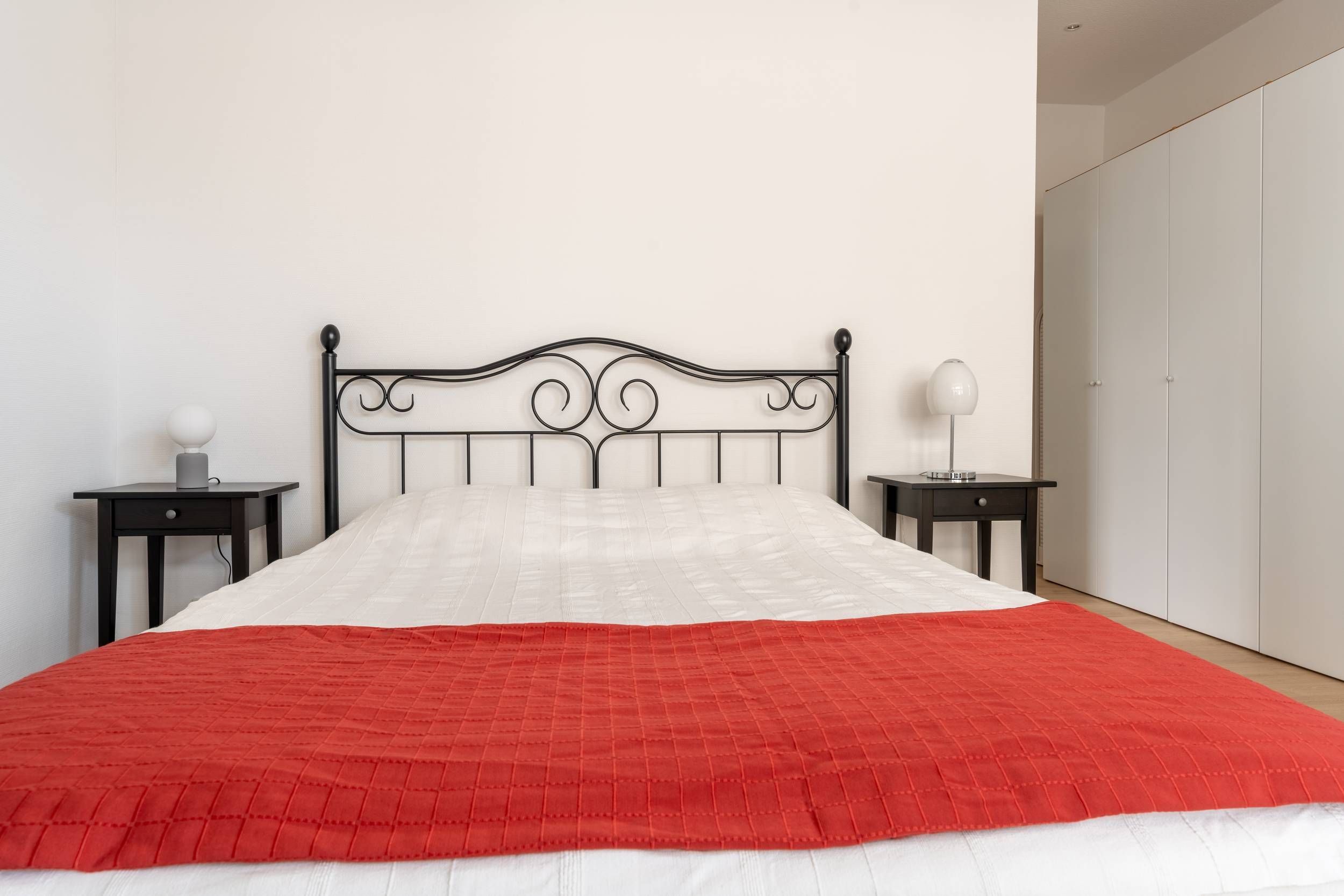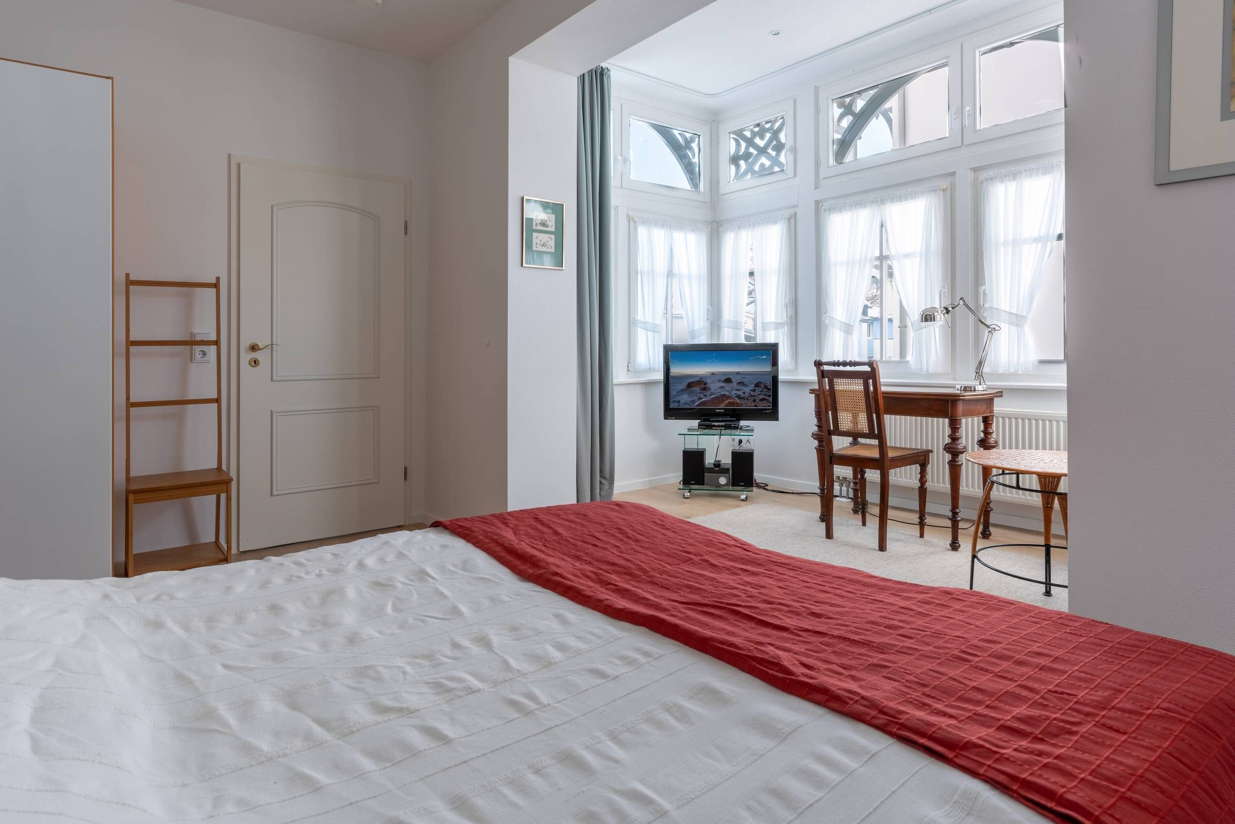 Im Schlafzimmer befindet sich ein Doppelbett, ein Kleiderschrank und ein kleiner Arbeitsplatz sowie ein zusätzliches Fernsehgerät. Daran an schließt sich das komplett neu sanierte Duschbad.