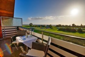 Die Ferienwohnung Typ Seepferdchen V verfügt über einen Balkon zur Seeseite und Nordseeblick. Die Wohnung teilt sich in ein Wohnzimmer mit gemütlicher Couch, TV, einer offenen Küche, sowie einem Schlafzimmer mit Doppelbett und einem Bad mit Dusche/WC auf. Hier sind keine Haustiere erlaubt. Diese Wohnung befindet sich in der 4ten Etage ohne Aufzug, dafür den schönsten Blick auf den Jadebusen.