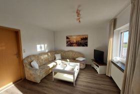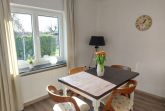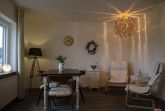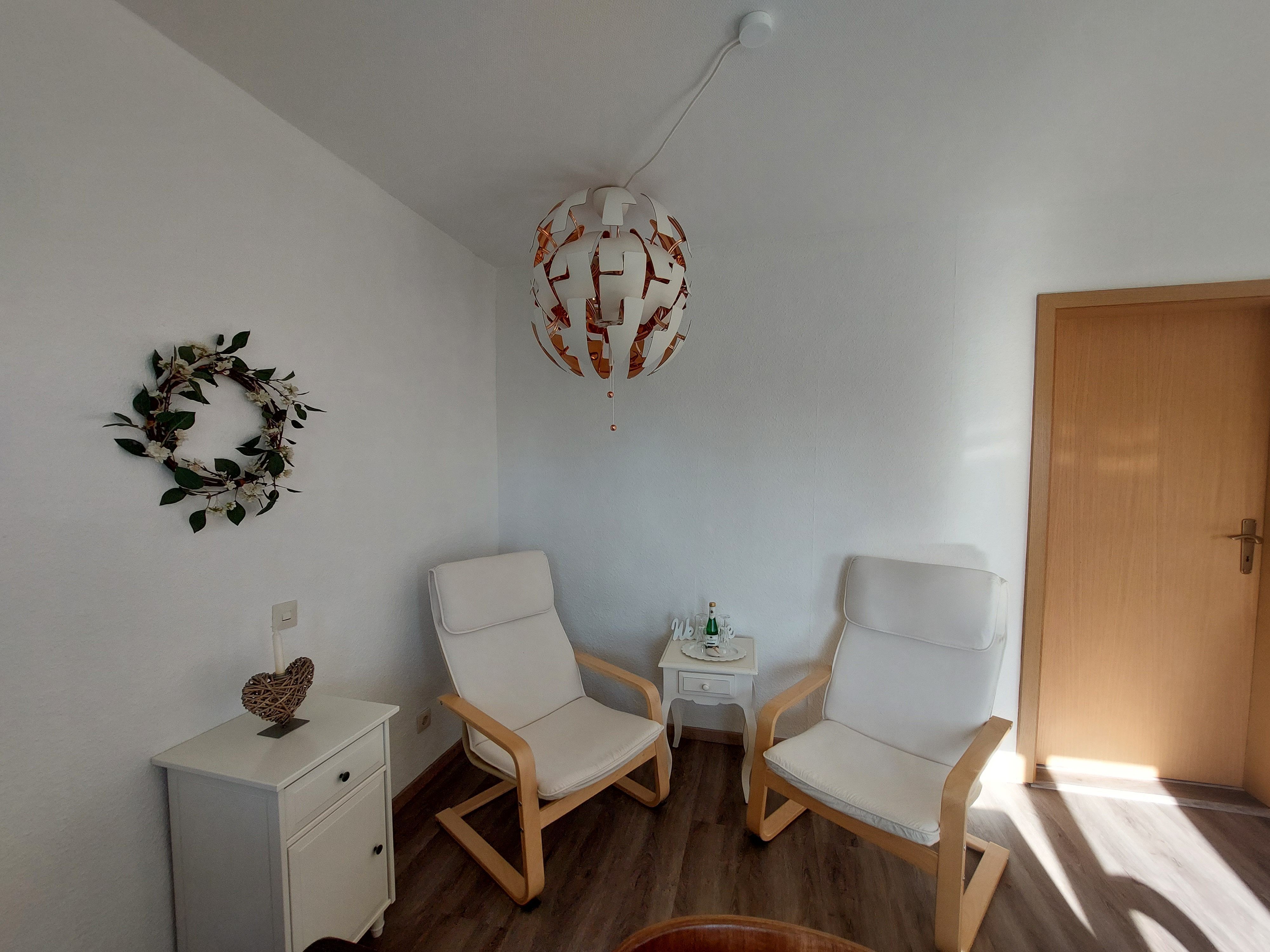 Sie betreten die Wohnung über einen geräumigen Flur mit einer Garderobe. Von hier aus geht es weiter in die Wohnstube mit gemütlicher Sofa Rundecke, einem TV und Couchtisch. Zudem finden Sie hier auch einen Esstisch mit Stühlen. Eine kleine Sitzgruppe mit zwei Wippsesseln, sowie einem Beistelltisch runden den Raum ab.