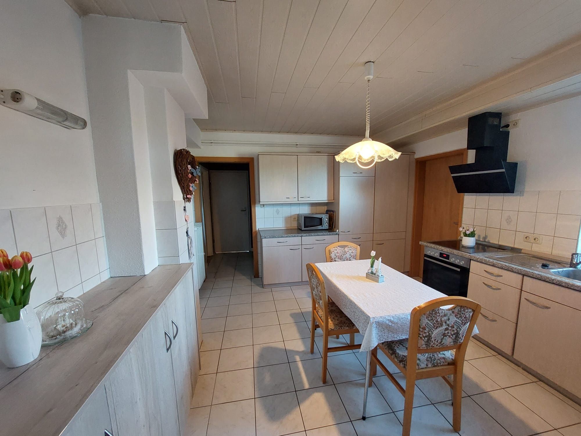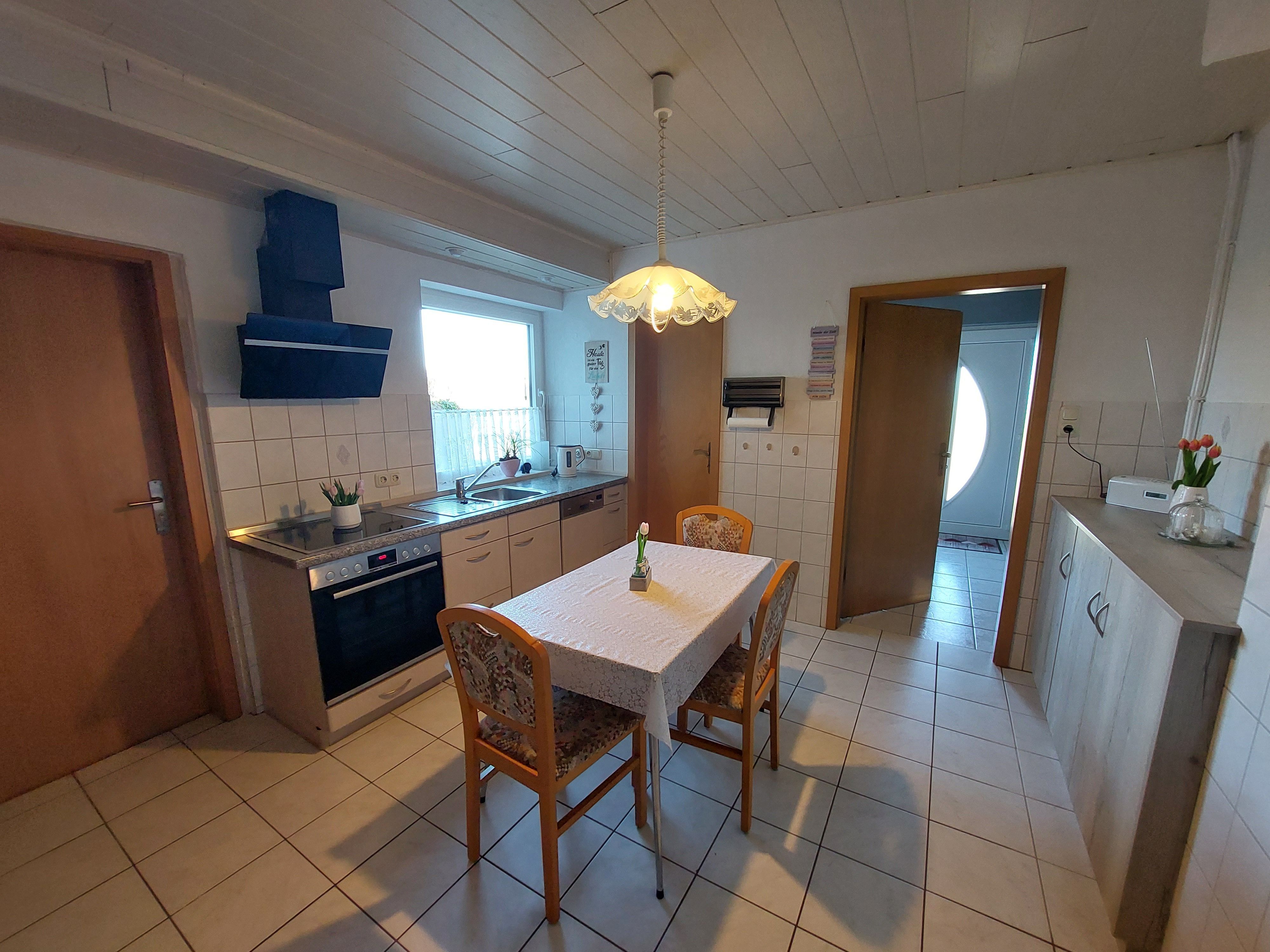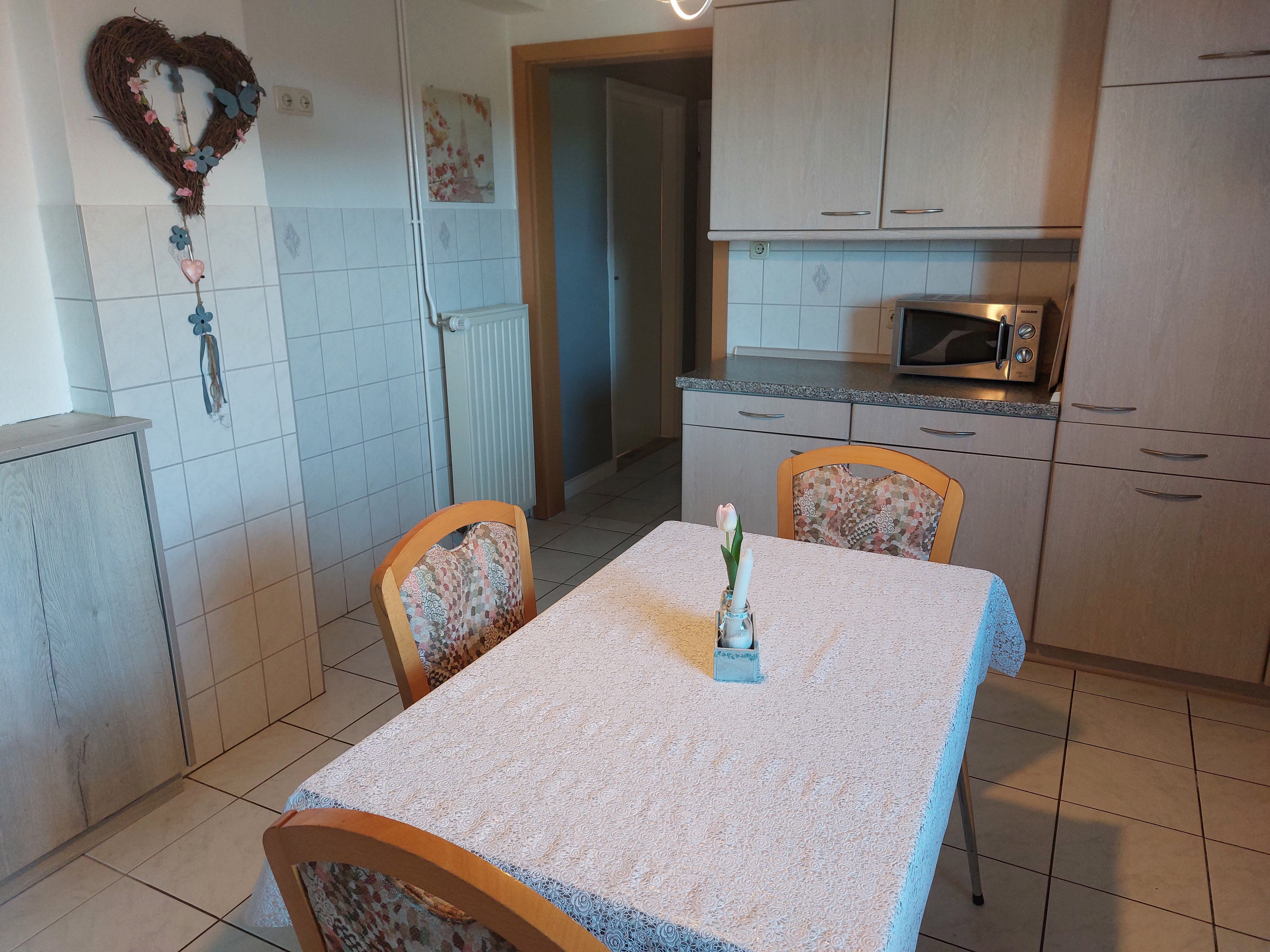 Vom Flur aus gelangt man in die geräumige Küche mit zweigeteilter Küchenzeile. Hier finden Sie alle möglichen Küchenutensilien, um sich zu versorgen. Ceranfeld mit Backofen und Dunstabzugshaube, Spüle sowie Spülmaschine. Ein Wasserkocher, eine Kaffeemaschine sowie ein Kühlschrank und eine Mikrowelle gehören selbstverständlich auch dazu. Ein kleiner Esstisch mit Stühlen lädt zum Frühstücken ein.