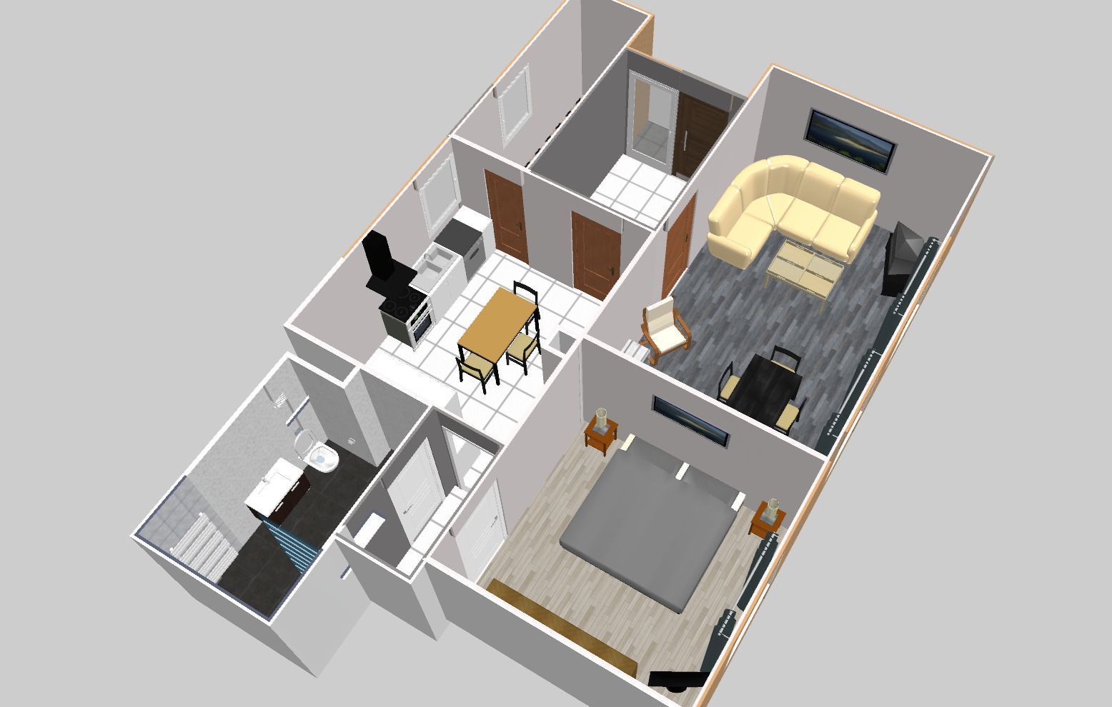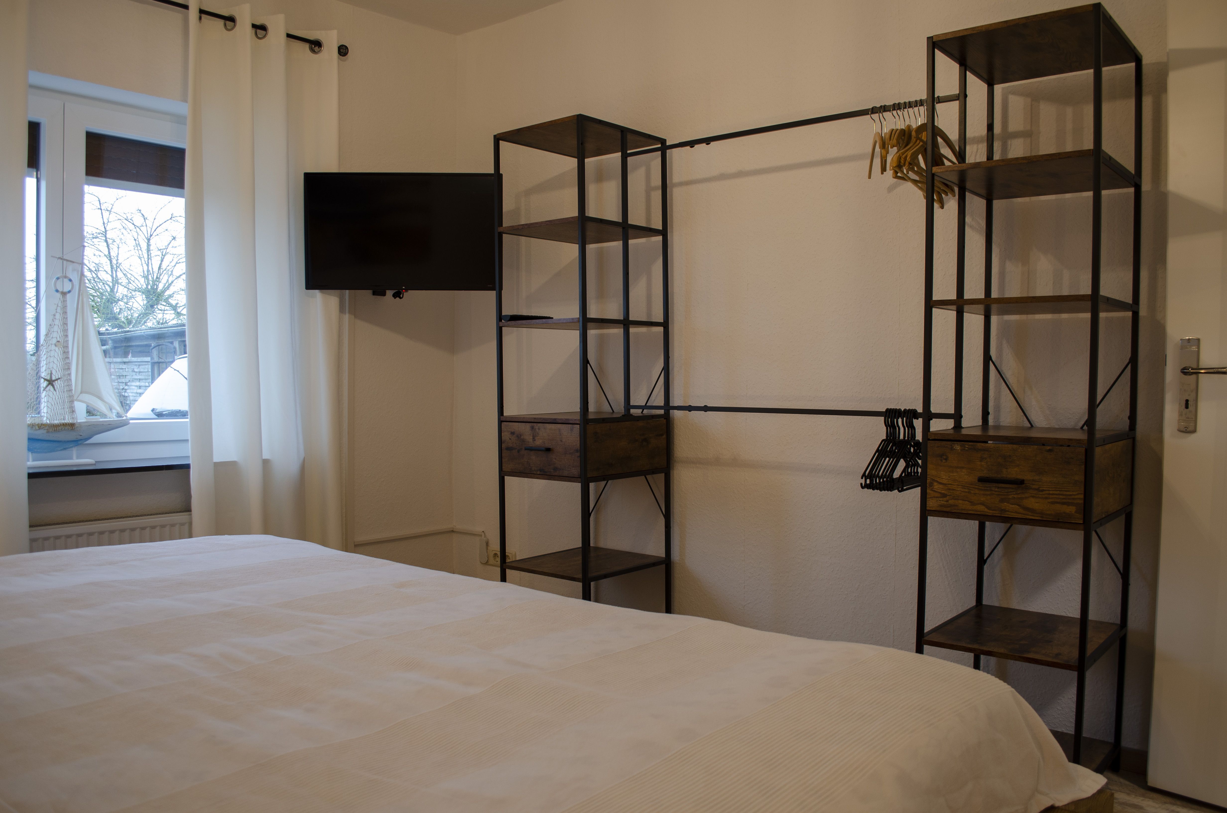 Im Schlafzimmer ist ein offener Kleiderschrank zu finden sowie ein TV an der Wand. Es befindet sich ein sehr bequemes 2x2 Meter Bett darin. Handtücher und Bettwäsche sind im Preis mitinbegriffen.