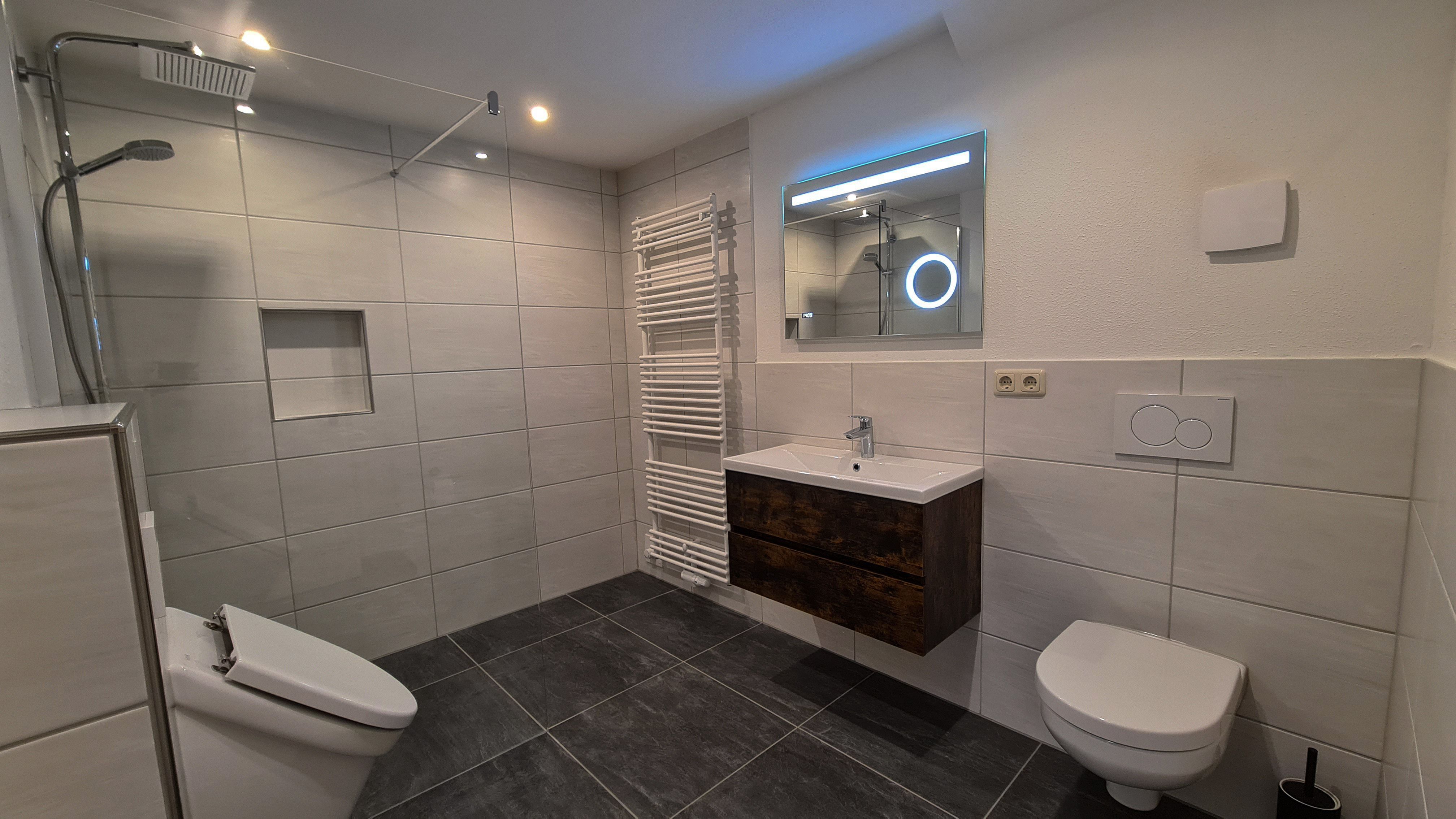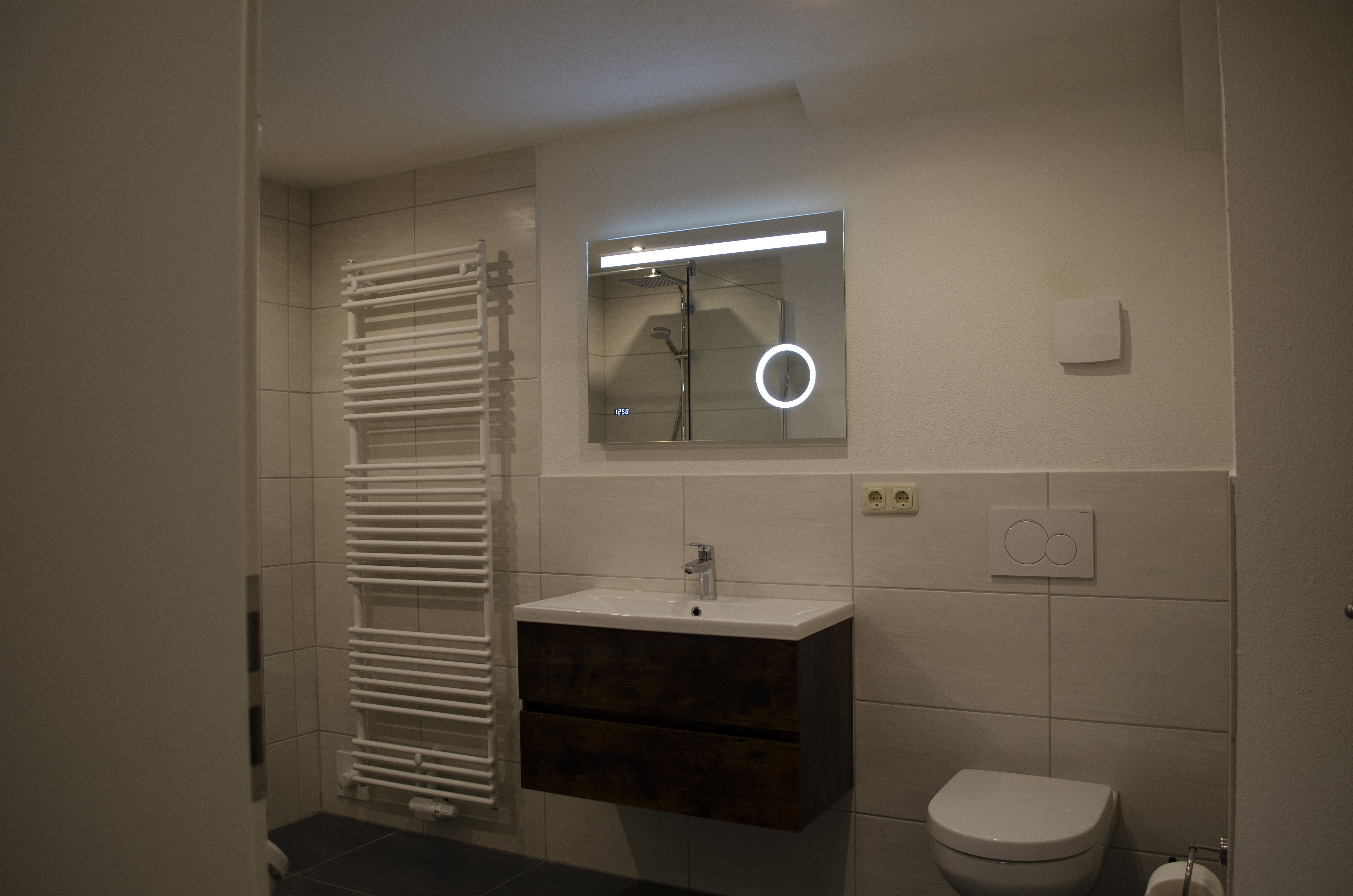 Das frisch sanierte Badezimmer lädt zum Wohlfühlen und Erfrischen für den Tag ein. Hier finden Sie ein Waschbecken mit beleuchtetem Spiegel inkl. Make-up Spiegel, WC, Urinal sowie eine schwellenfrei begehbare Dusche. Die Fußbodenerwärmung rundet das Bild des schönen Badezimmers ab.