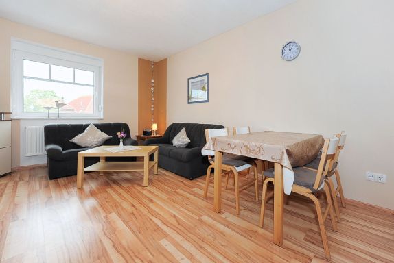 Größe ca. 60 Quadratmeter, Wohnraum mit integrierter Küche, Schlafzimmer, zweites separates, Schlafzimmer/Kinderzimmer, Badezimmer mit Dusche, Waschtisch und WC,Koffer-/Abstellraum, optimal für 2 bis 4 Personen und zusätzlich ein Kleinkind.