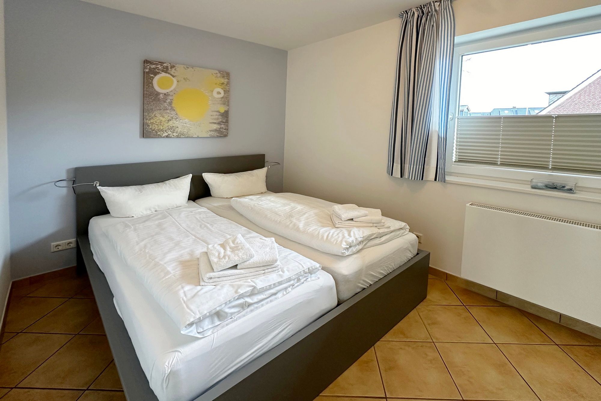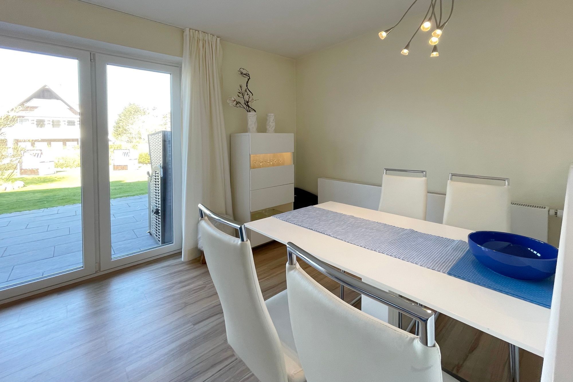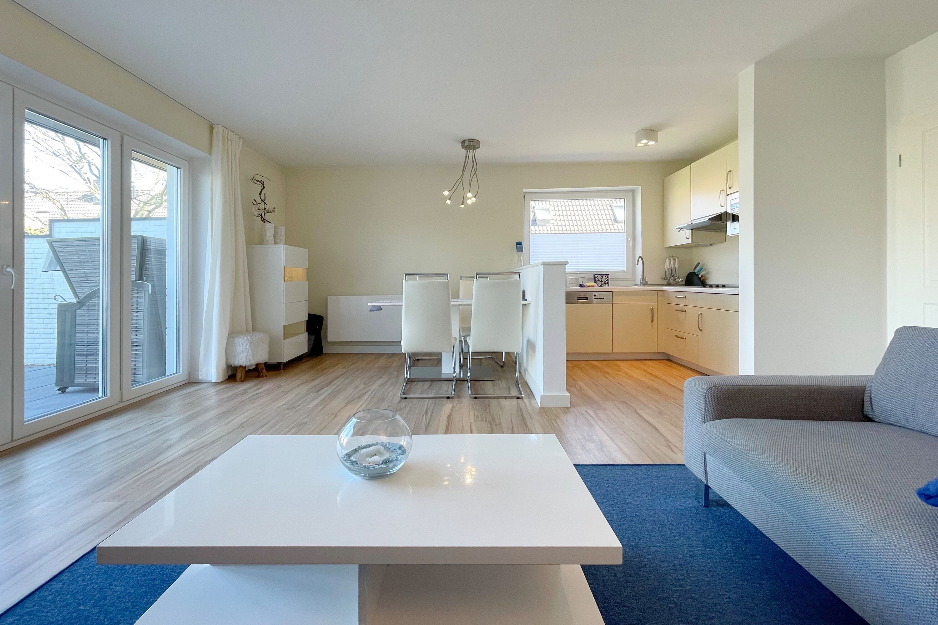 Die 2-Zimmer-Ferienwohnung befindet sich im Erdgeschoss und liegt in einer ruhigen Lage in Westerland. Sie verfügt über ein Wohnzimmer und eine große Terrasse, die nach Westen ausgerichtet ist. Ihnen stehen Gartenmöbel und ein eigener Strandkorb zur Verfügung. Das Wohn-Esszimmer ist mit einer offenen Küche, einer Essecke und einer Couch ausgestattet. Außerdem gehören ein großer Flatscreen-Fernseher mit Blue-Ray-Player und vielen Extras zur Ausstattung. Das Schlafzimmer verfügt über ein Doppelbett und einen zusätzlichen Fernseher.