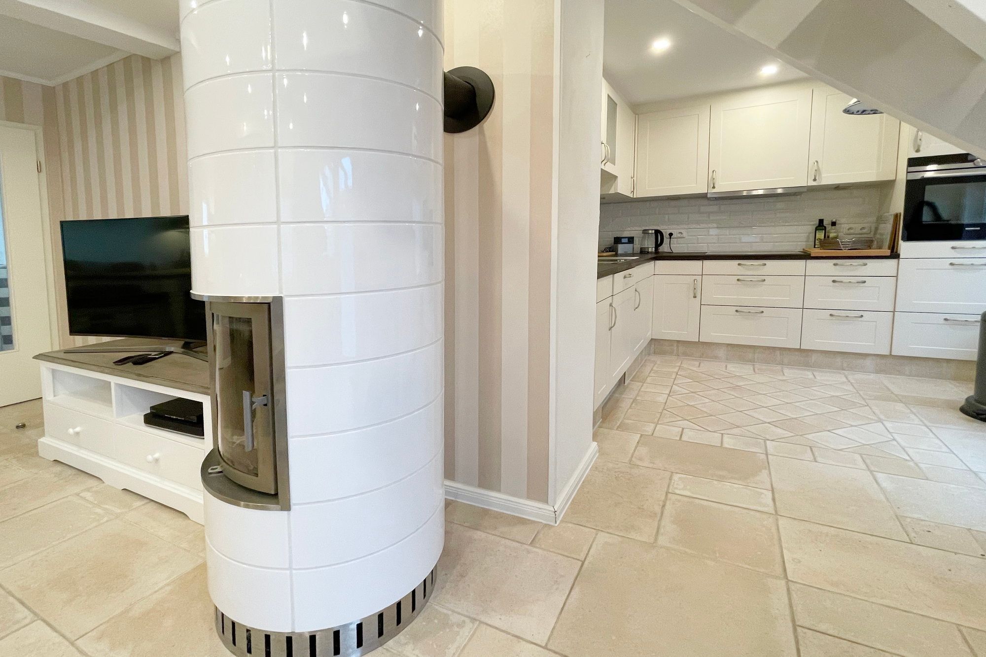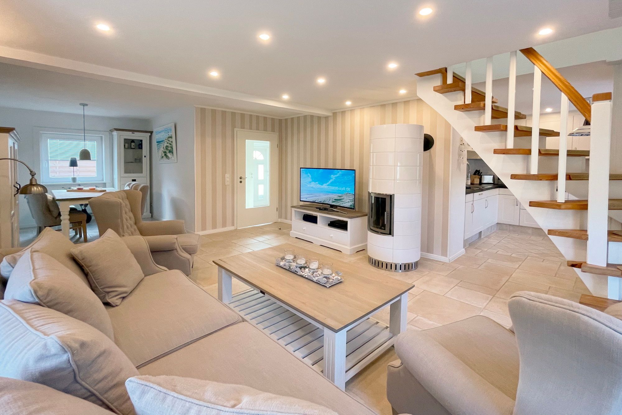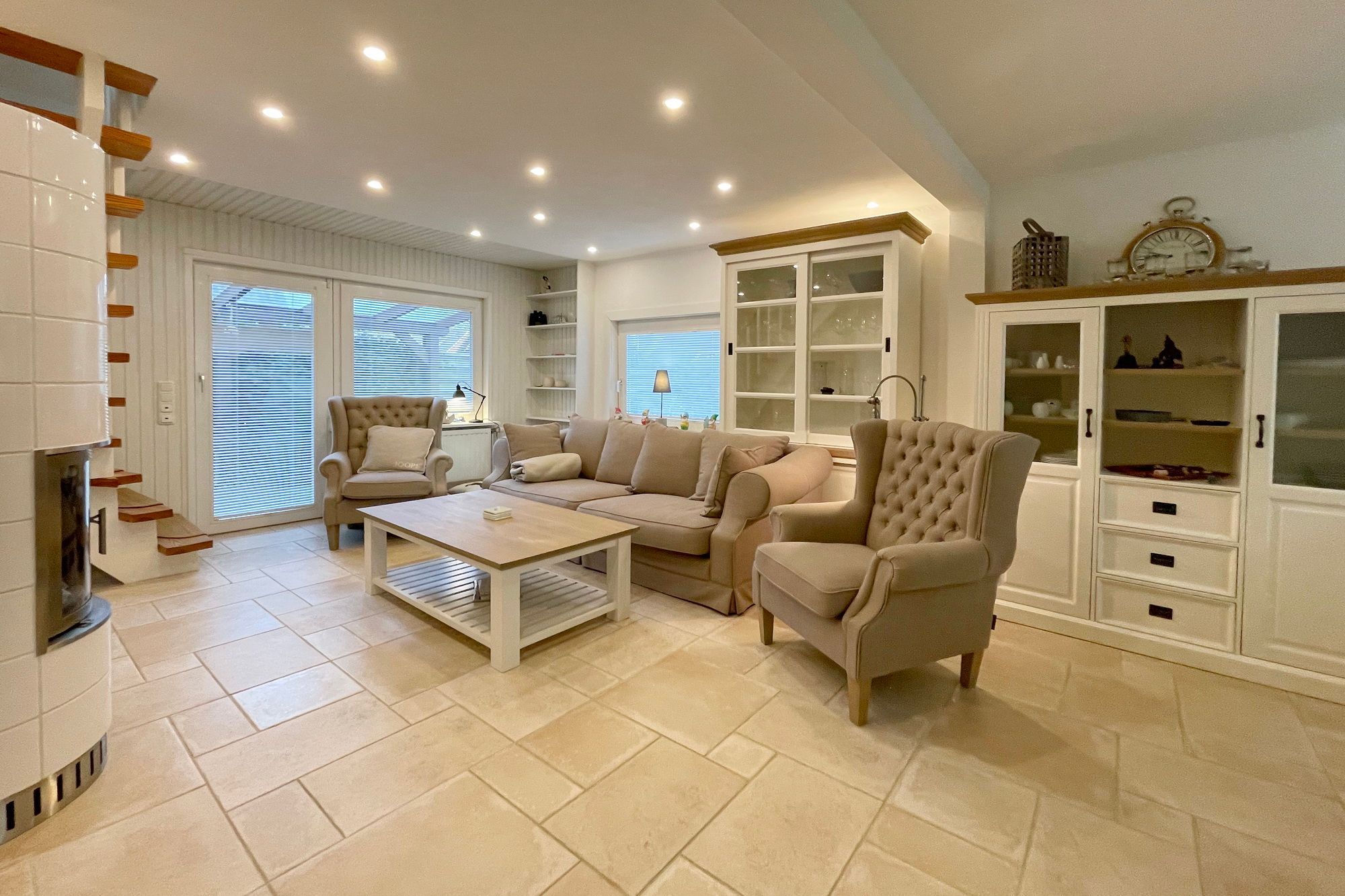 EG: Wohnzimmer mit Kachelofen, Essbereich, Couch, 2 Sessel uns Smart-TV. Flur, Duschbad und Hauswirtschaftsraum mit Wasch-/Trockner Kombigerät und Kleiderschrank.