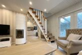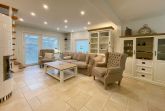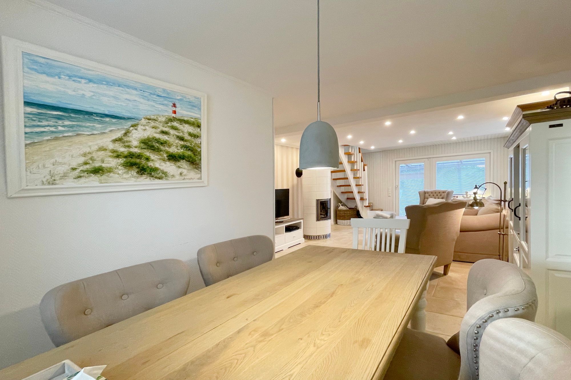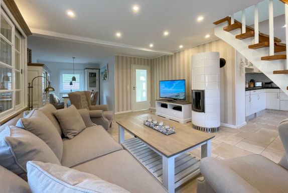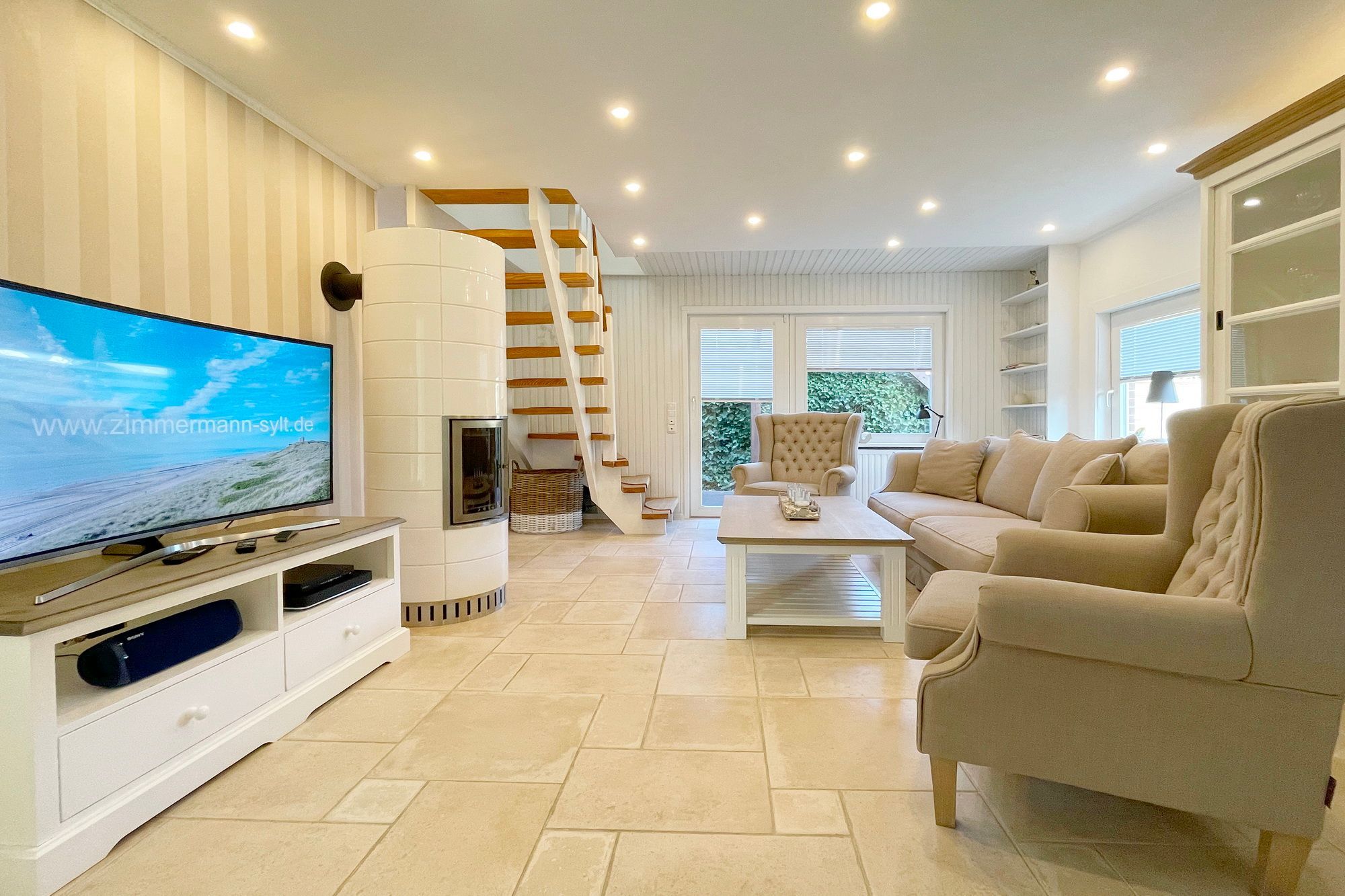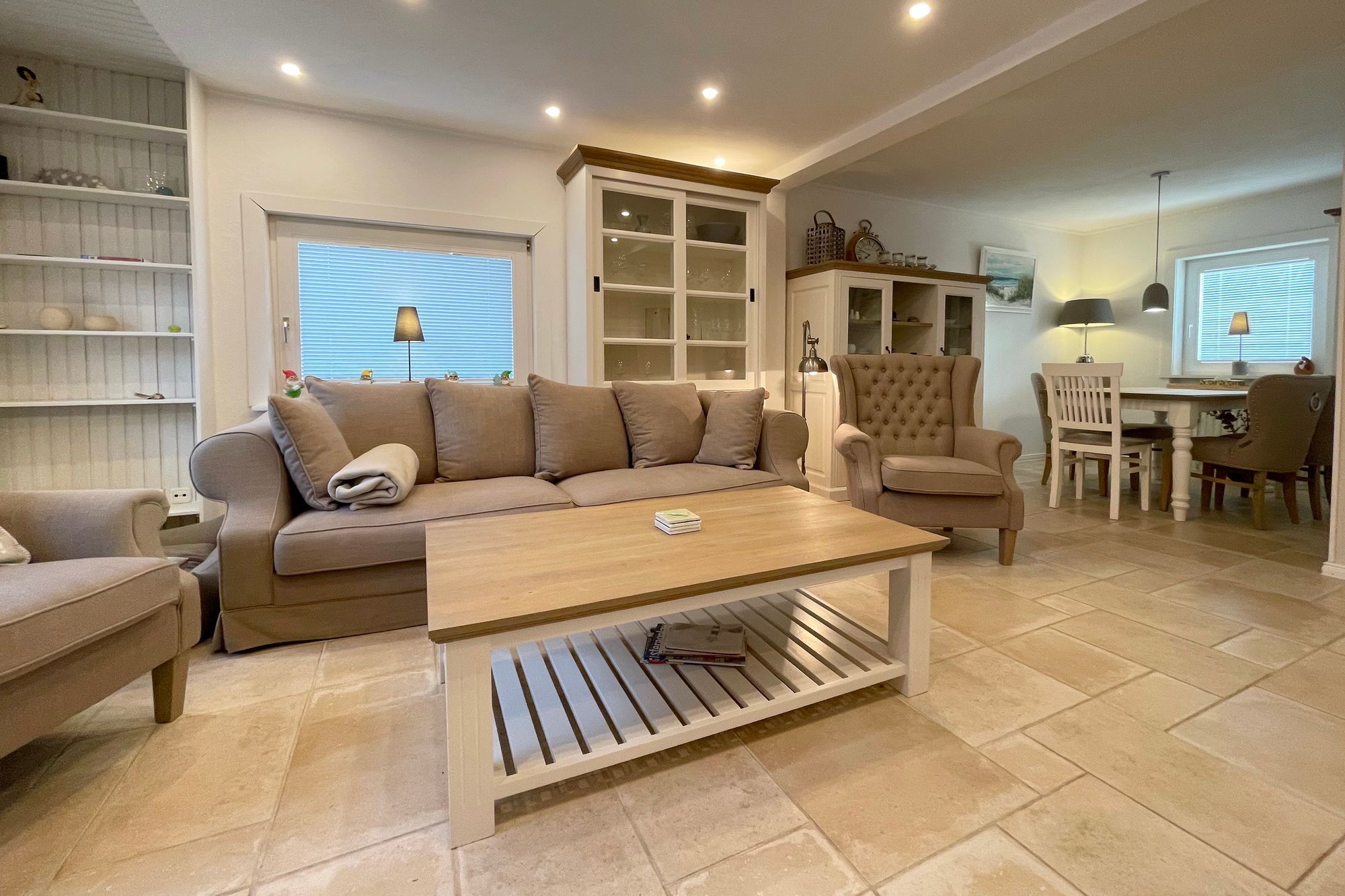 EG: Wohnzimmer mit Kachelofen, Essbereich, Couch, 2 Sessel uns Smart-TV. Flur, Duschbad und Hauswirtschaftsraum mit Wasch-/Trockner Kombigerät und Kleiderschrank.