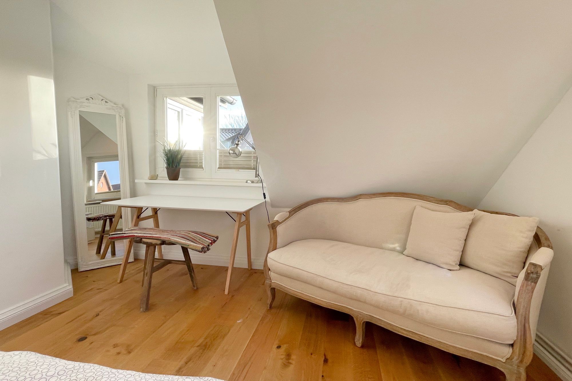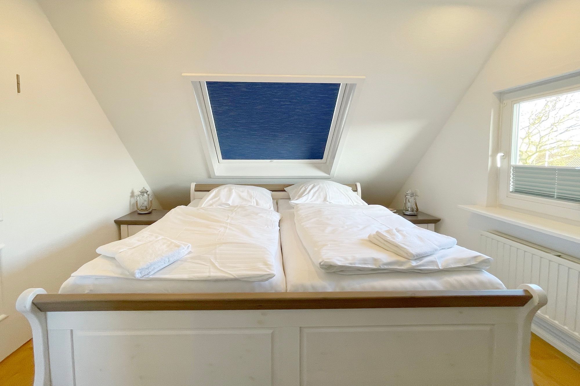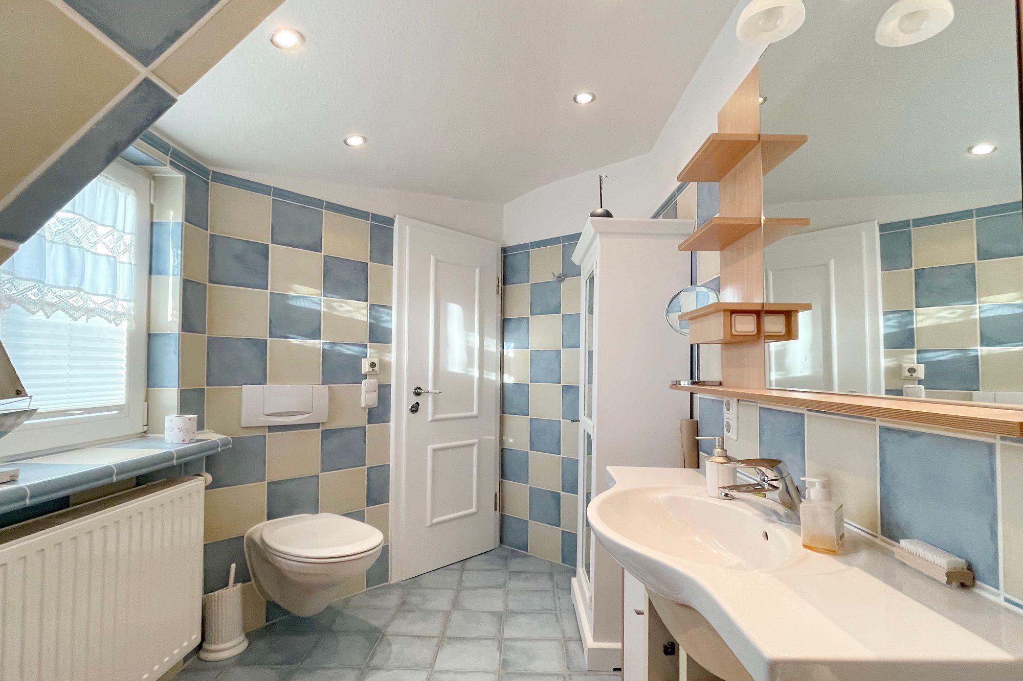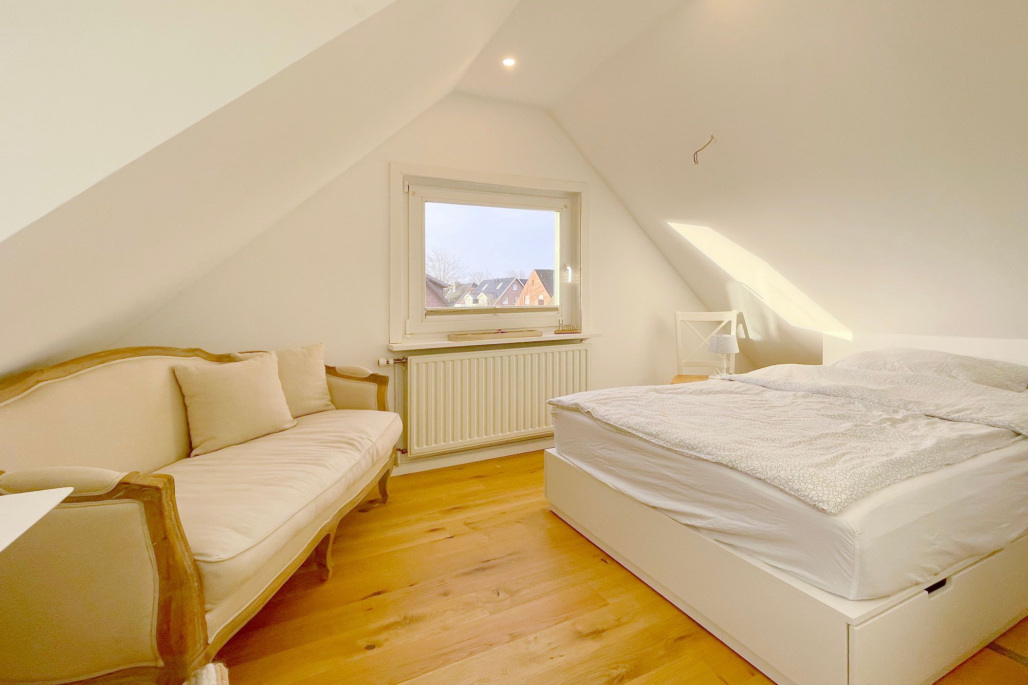 OG: großes Schlafzimmer mit Doppelbett und Kommode, kleines Schlafzimmer mit franz. Bett und ein Badezimmer mit Wanne, WC und Bidet.
