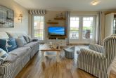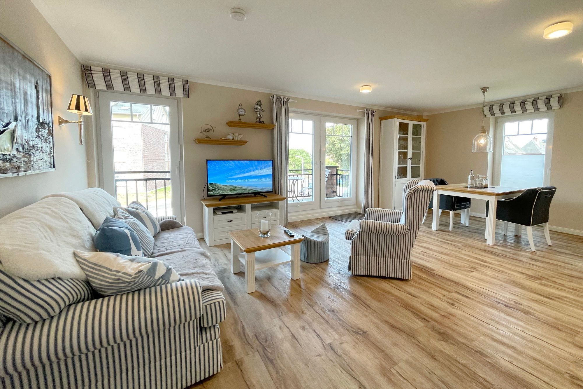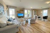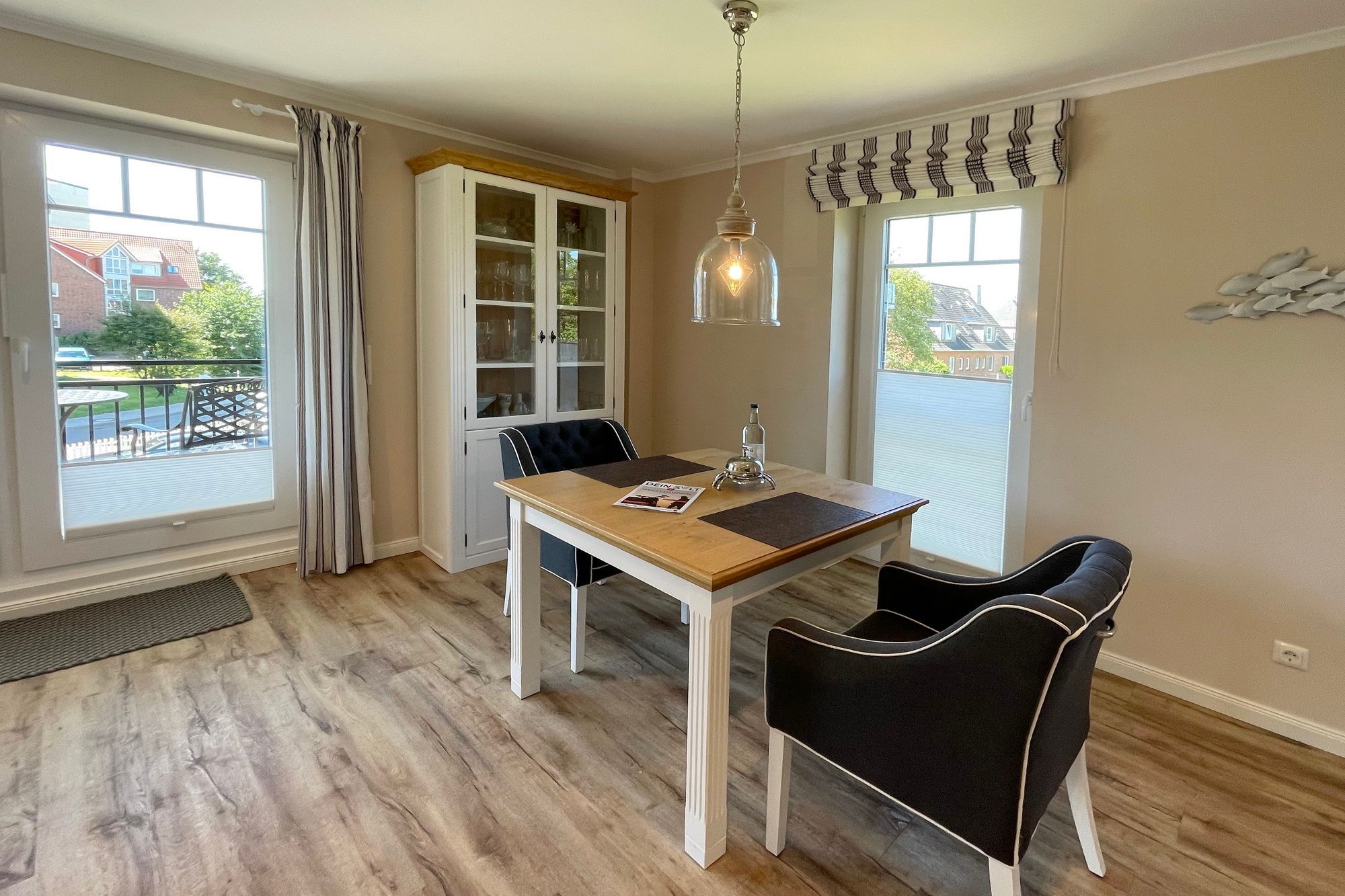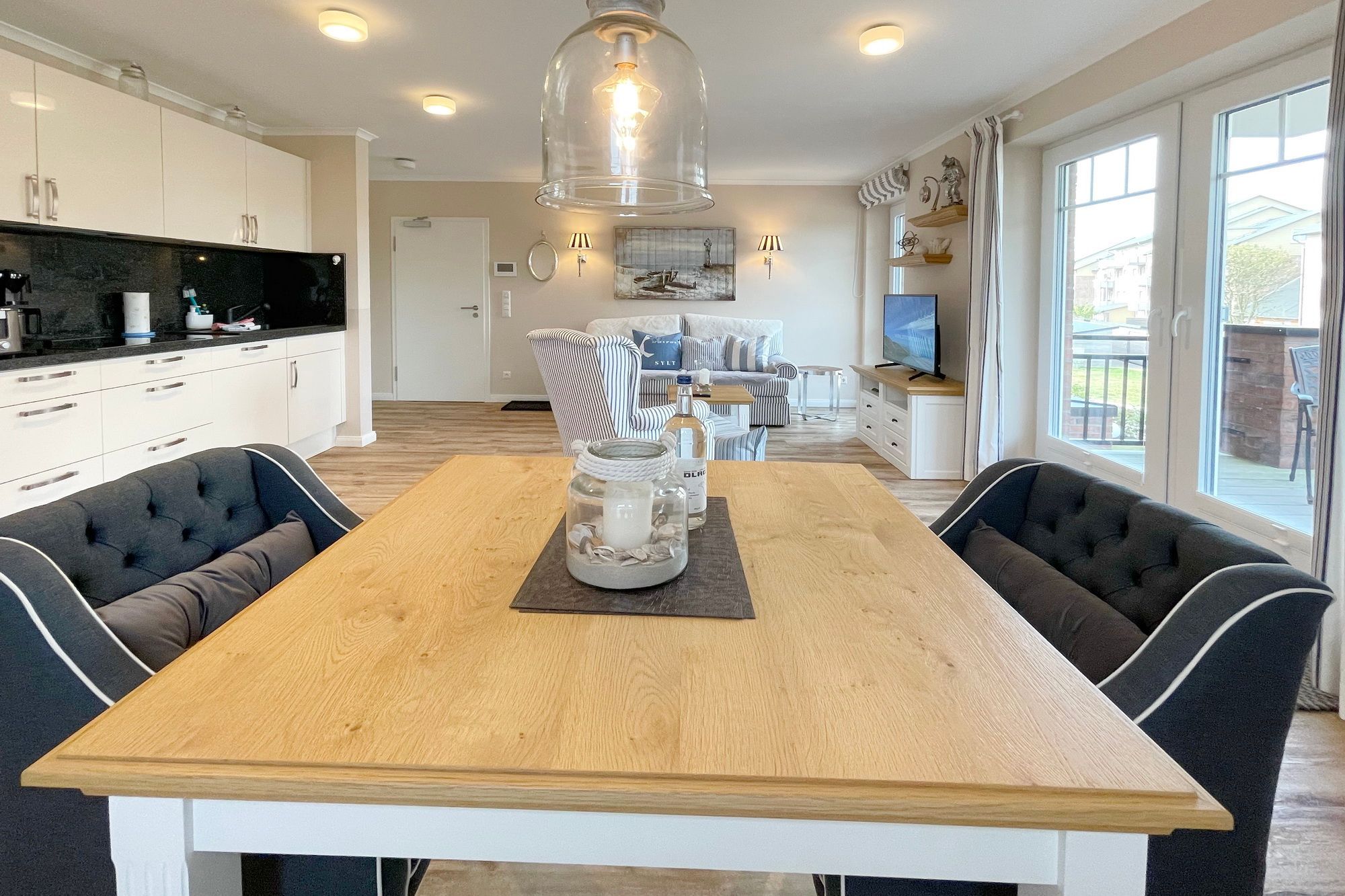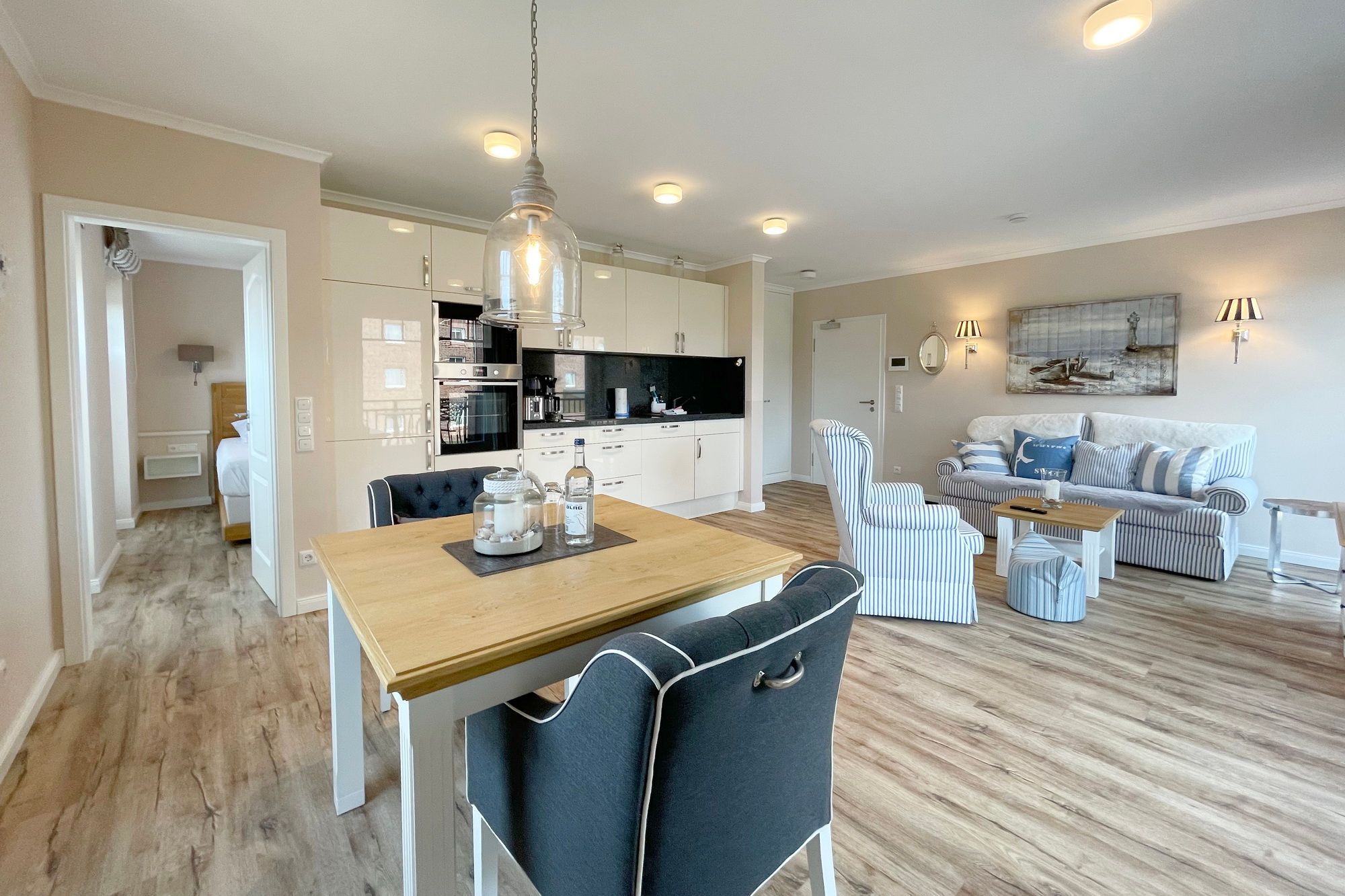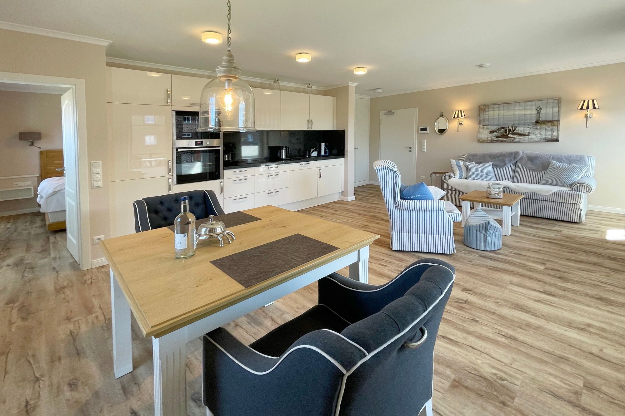 Sie ist stilvoll und mit viel Liebe zum Detail eingerichtet und verfügt über einen einladenden Wohn-Essbereich und eine offene Küchenzeile, die wie auch die gesamte Ferienwohnung sehr gut ausgestattet ist.