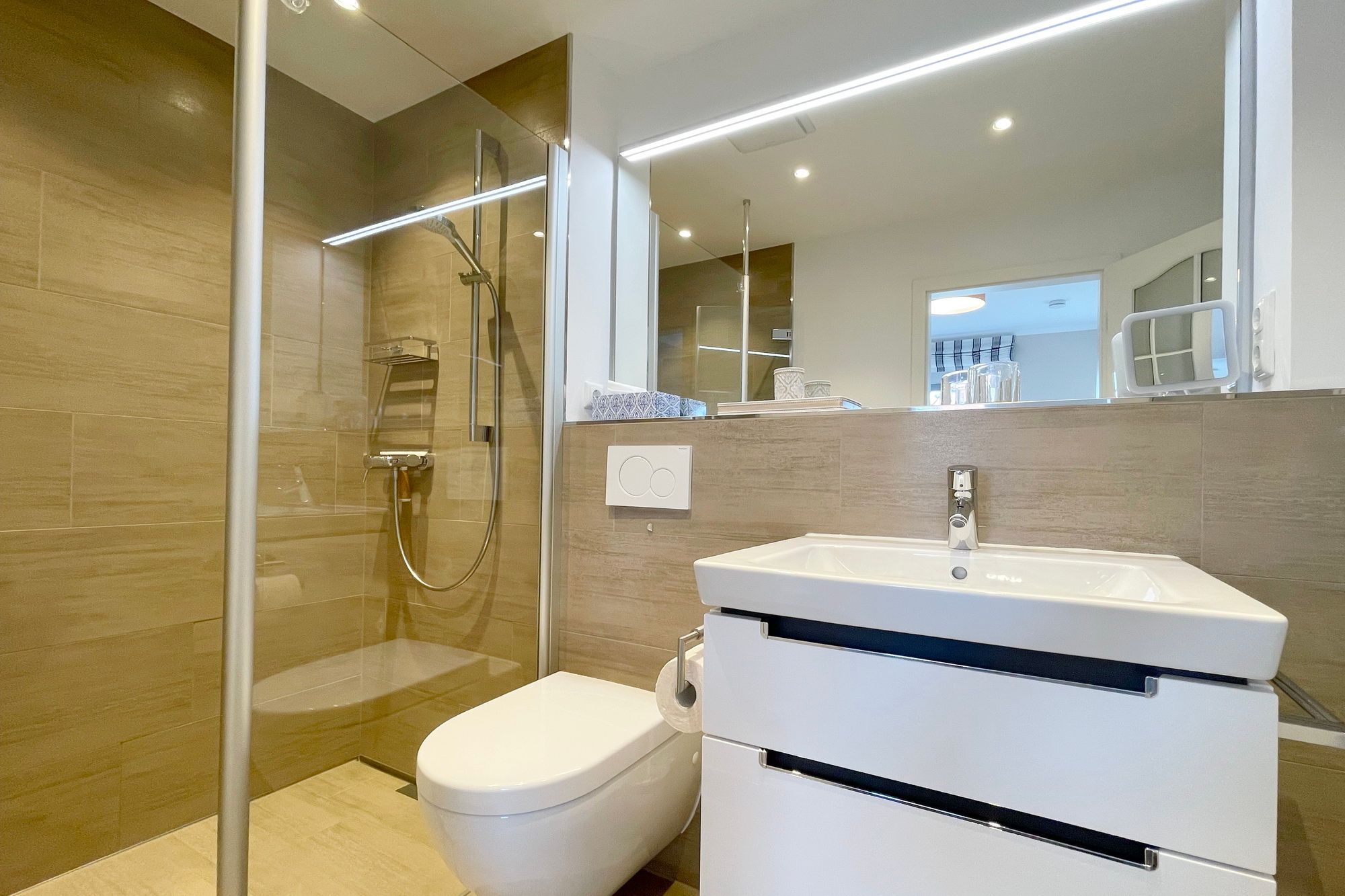 Das separate Schlafzimmer verfügt über ein erstklassiges Boxspringbett ( 180x200 ) für erholsamen Schlaf. Ein Bad en suite mit bodentiefer Dusche, Waschtisch, Handtuchtrockner und WC gehört ebenfalls dazu.