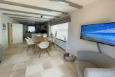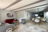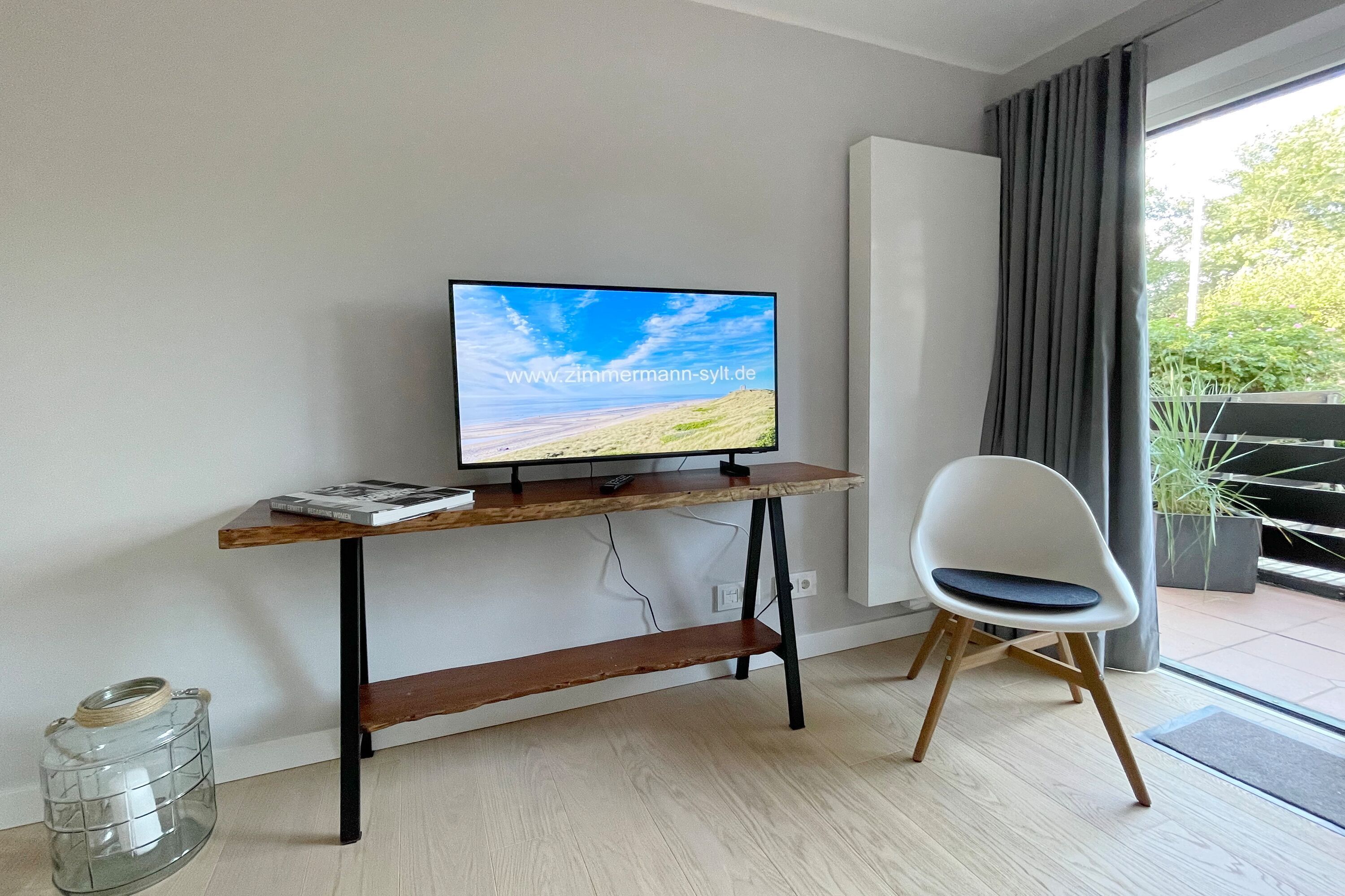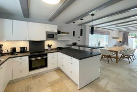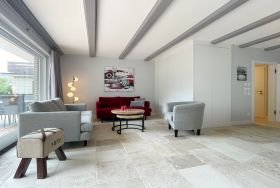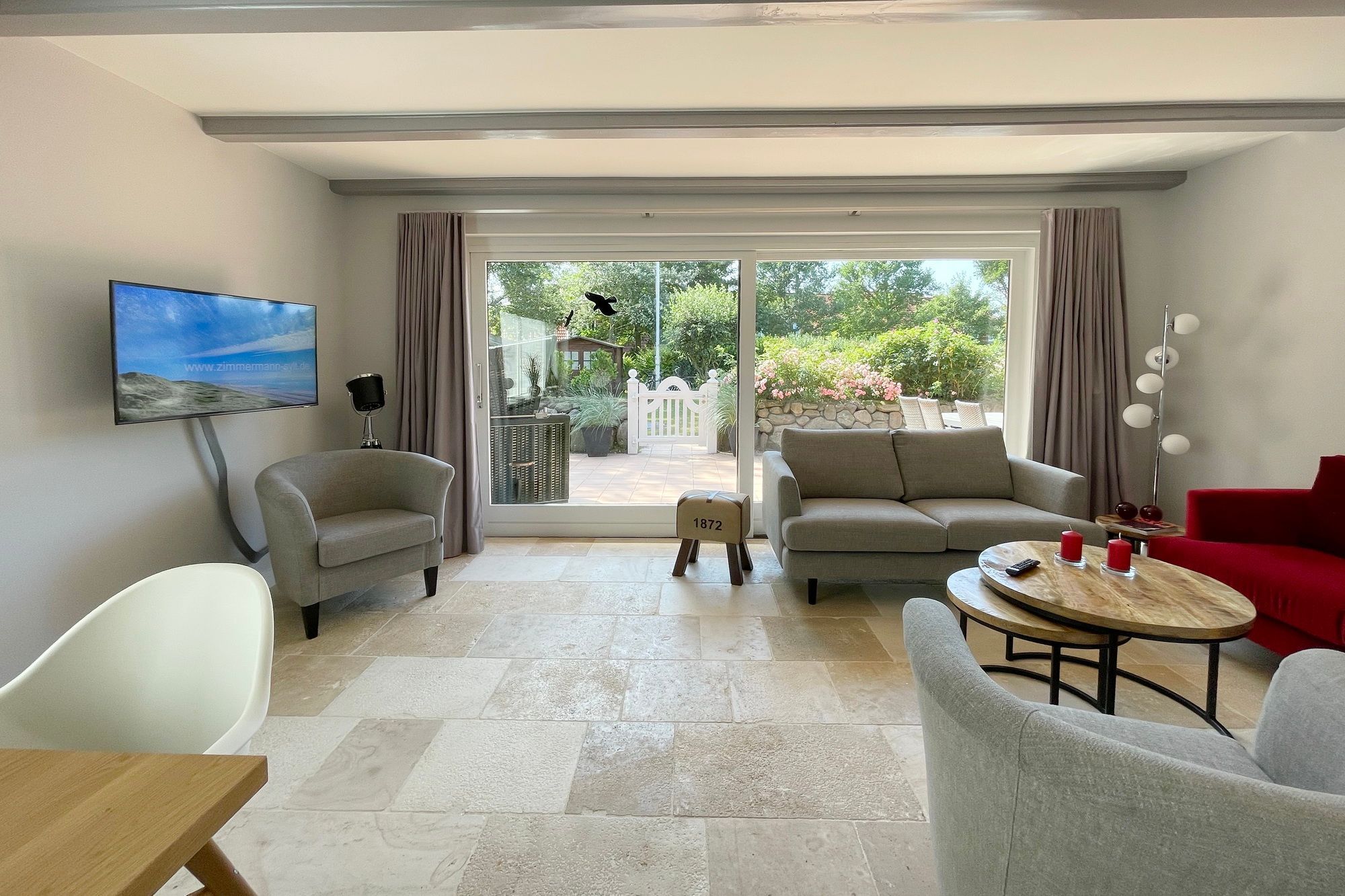 Wohnzimmer mit Natursteinböden, edle Tischlereinbauten, Smart-TV, Couchgruppe und Esstisch für 6 Personen. Die offene Küche ist umfangreich ausgestattet und lässte praktisch keine Wünsche offen.