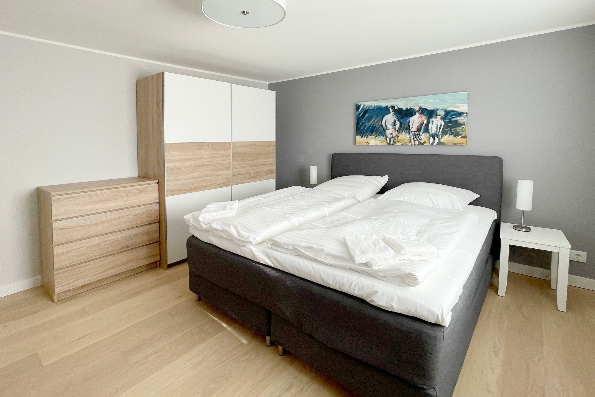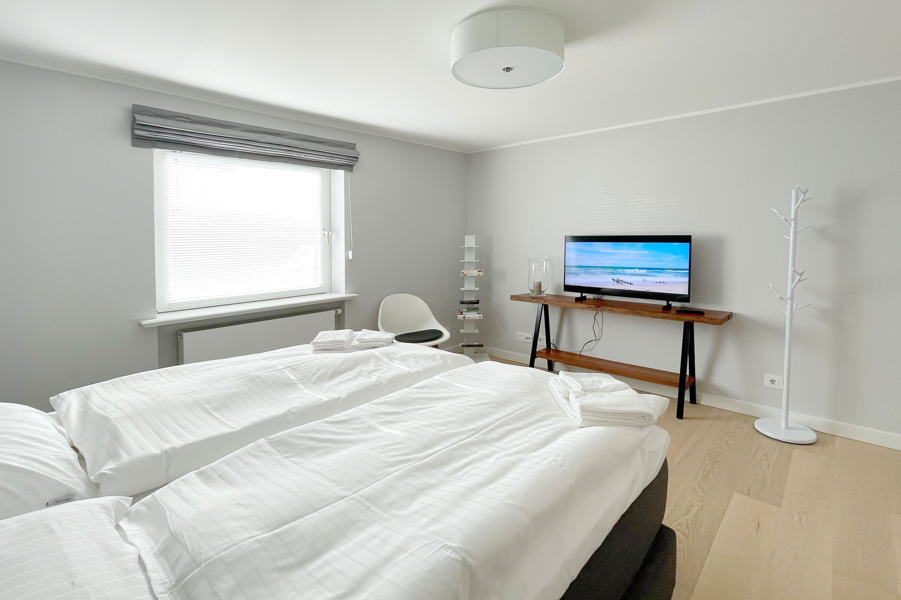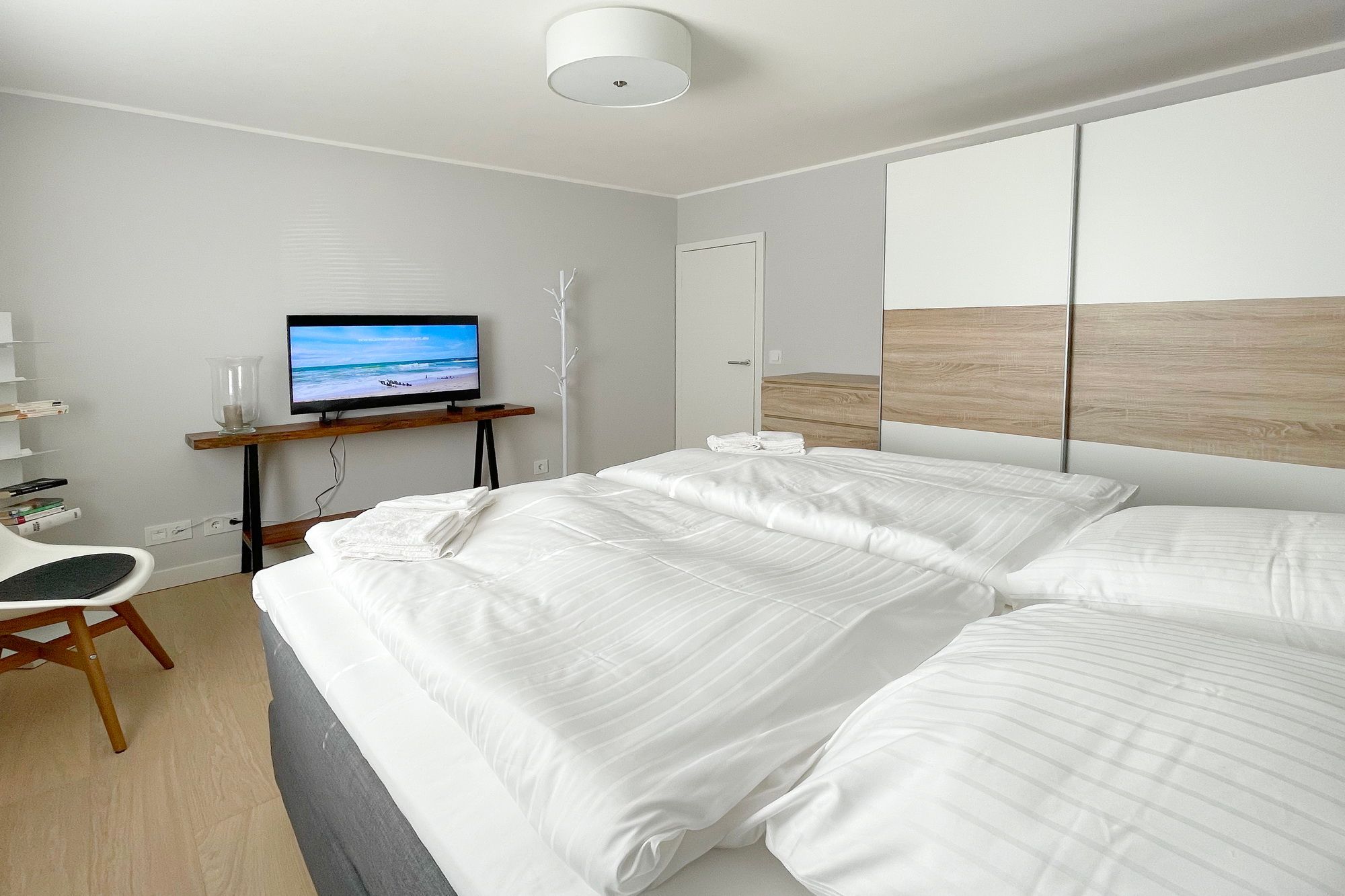 2 große Schlafzimmer mit Doppelbetten jeweils mit TV, 2 kleine Schlafzimmer für jeweils eine Person.