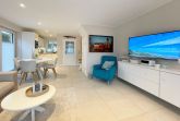 EG: Modernes Wohnzimmer mit offener Küche und Zugang zu 2 Terrassen. Gäste-WC